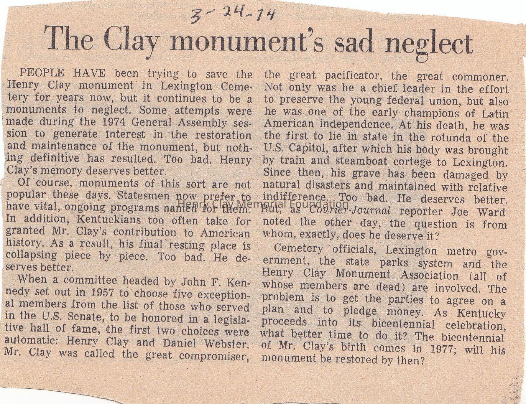 A small clipping regarding the neglect of the Henry Clay monument at the Lexington Cemetery and the nearing of the bicentennial of Mr.Clay's Birth. The end of the article is a question " Will his monument be restored by then?"