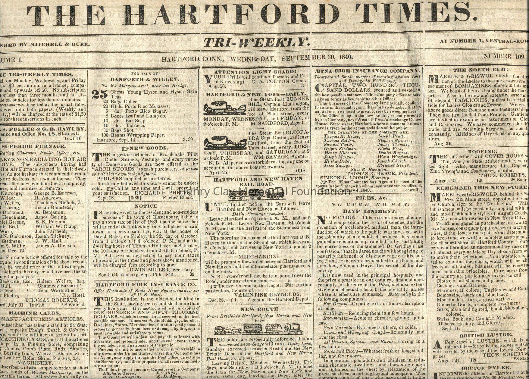 A copy of the Hartford Times newspaper, Wednesday September 30,1840 edition. It contains many articles and advertisements. The paper is pro-Democratic and contains an article implying that Henry Clay assuaged his debts by participating as a silent partner in the Negro Trade.