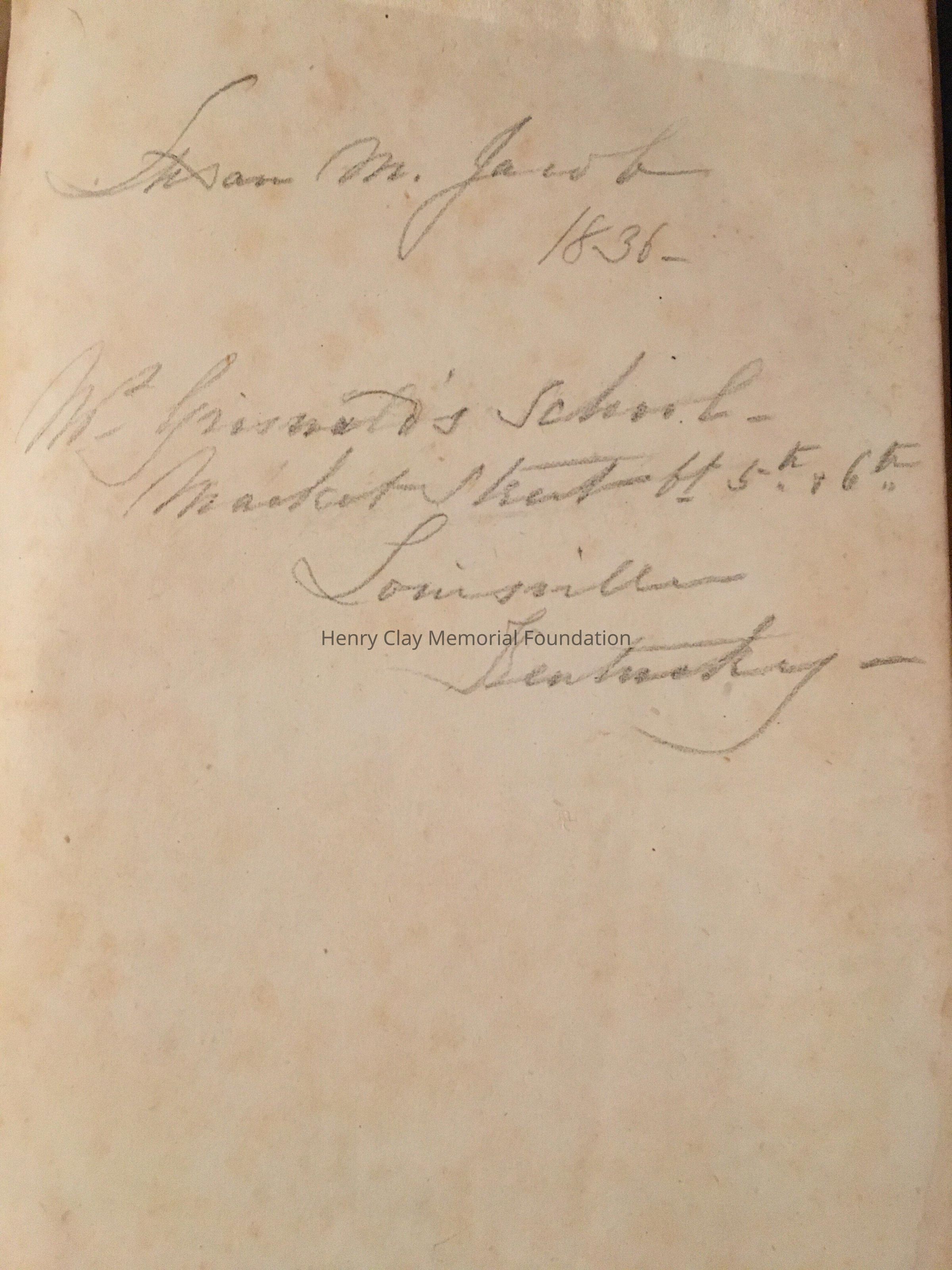 On first page "Susan M.Jacob 1836 Mr. Ginswalds School, Market street about 5th and 6th, Louisville Ky" and on following pages drawings in pencils of flowers.