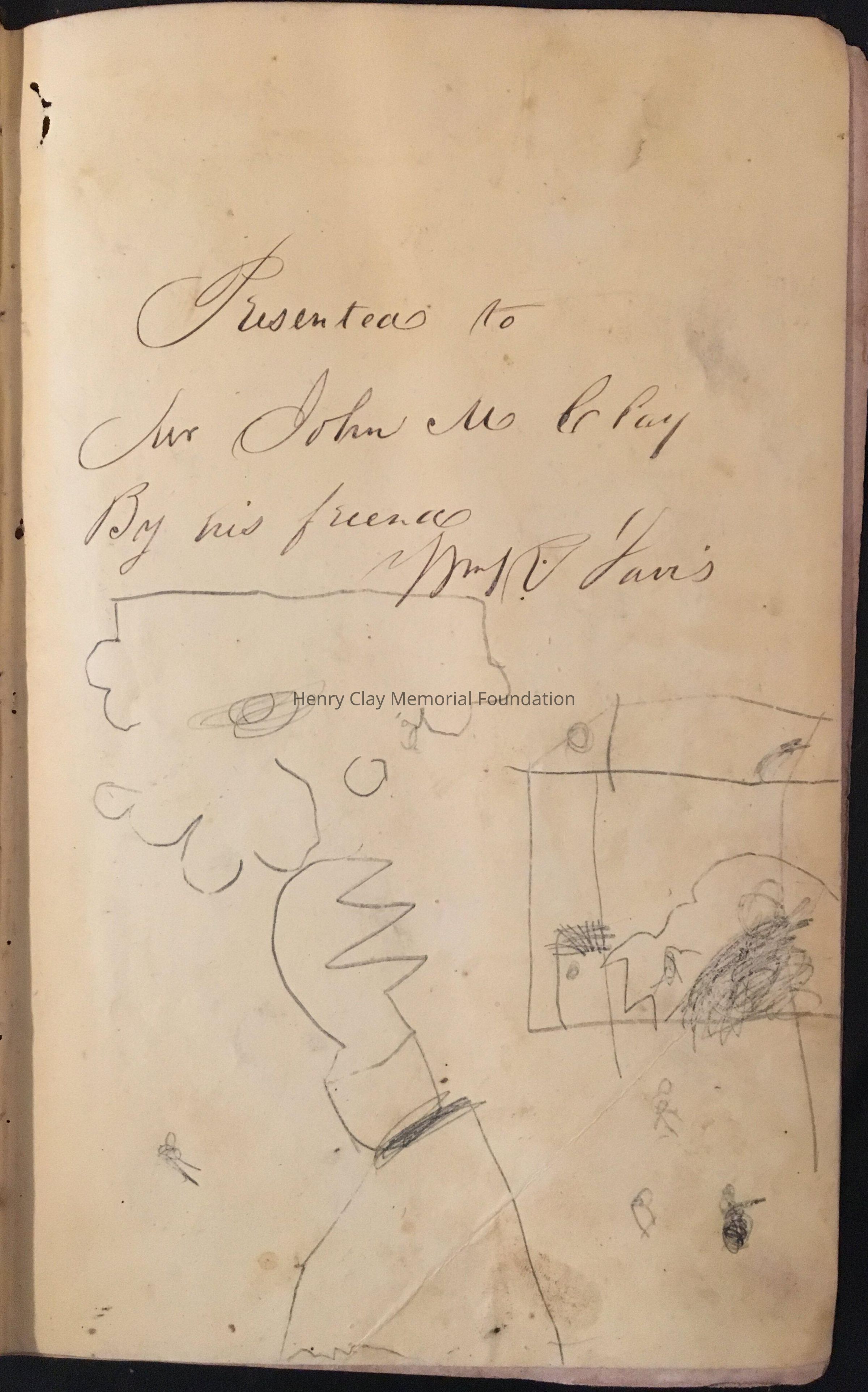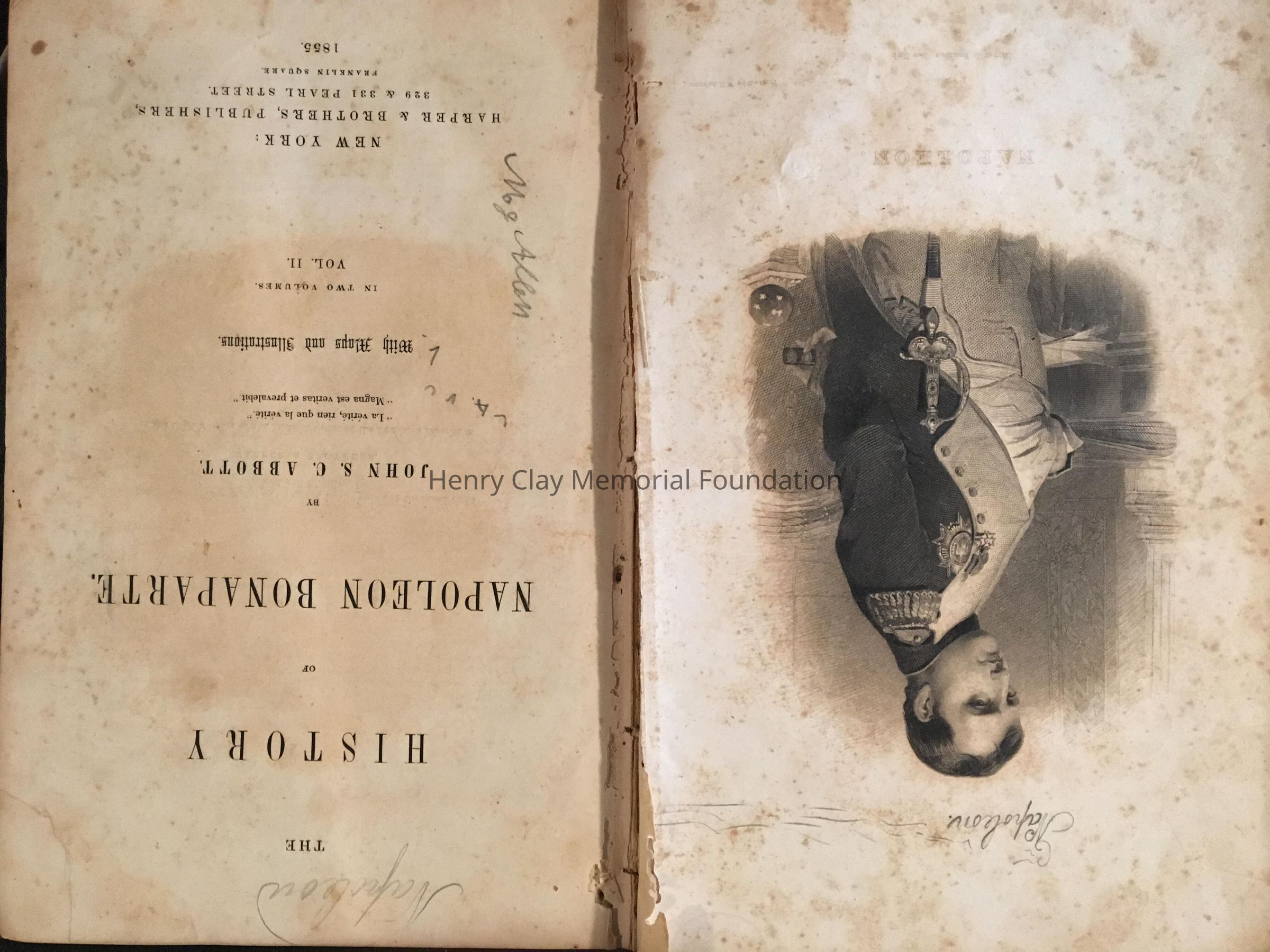 History of Napoleon and features maps and illustrations. Inside various sketches of persons, and an annotation in pen "Presented to Mr. John M.Clay by his friend (?) Brown with gold etching.
