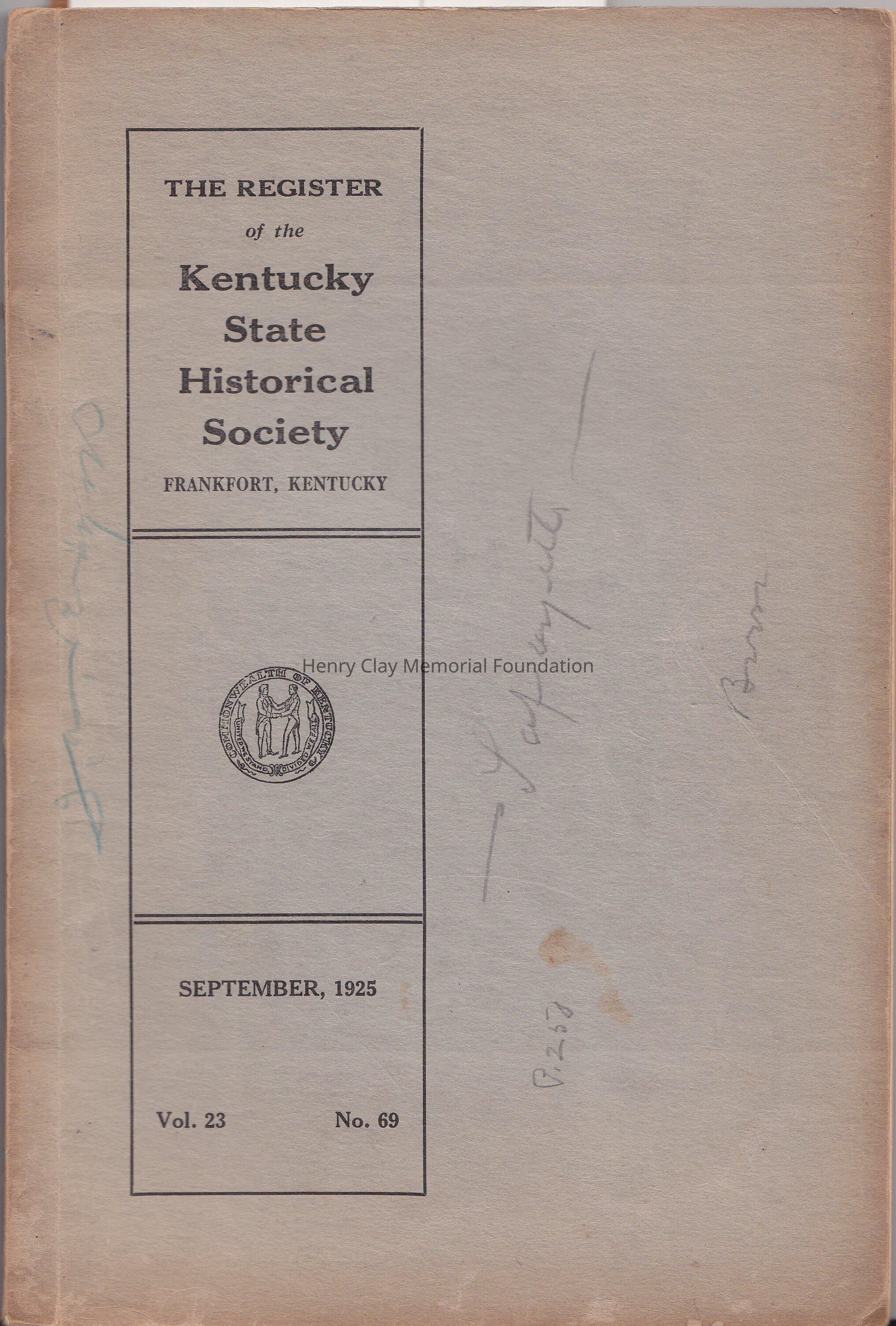 A: A magazine from the Kentucky Historical Society, Frankfort, Ky. Inside an article about Lafayette visit to kentucky.