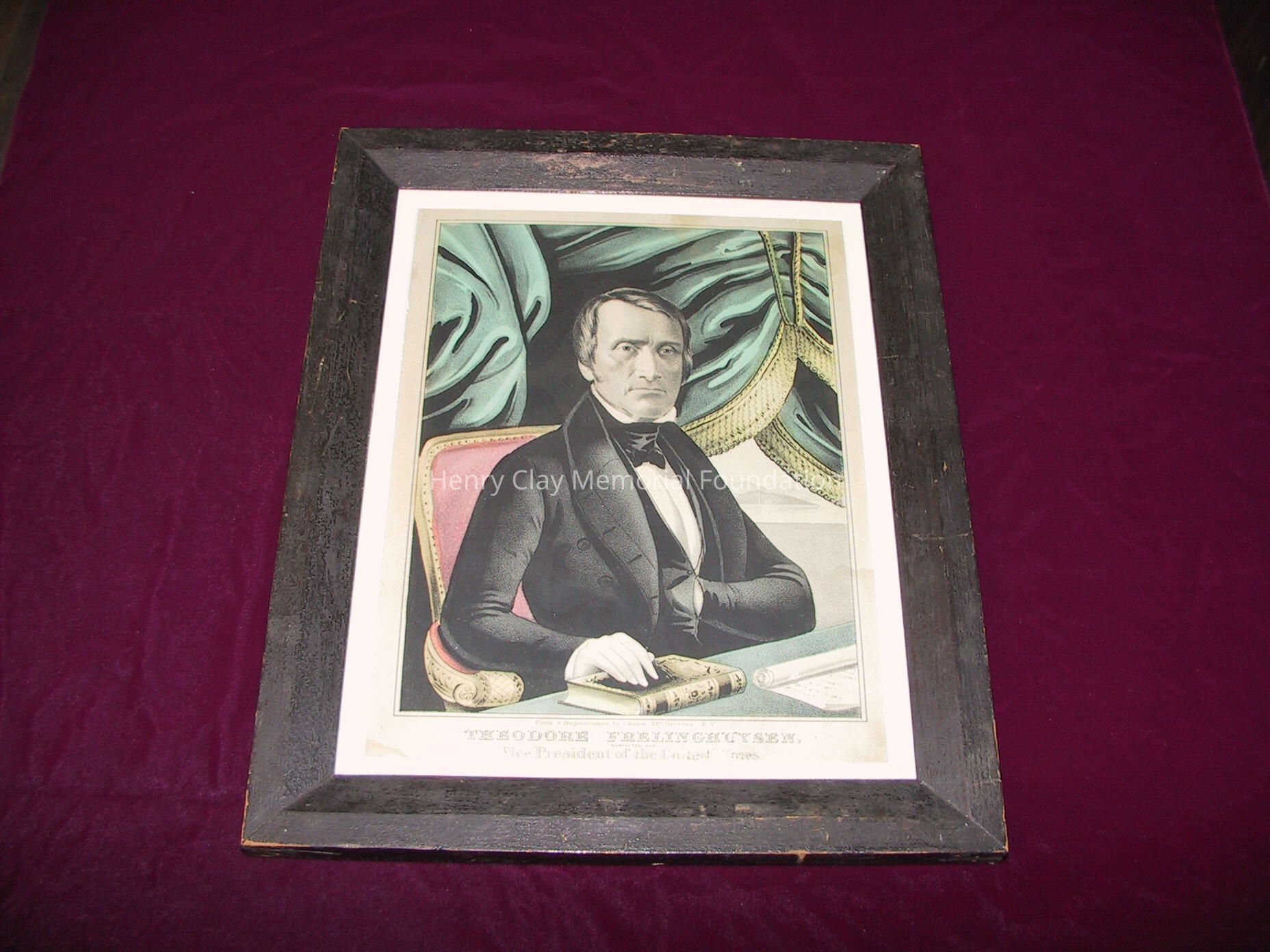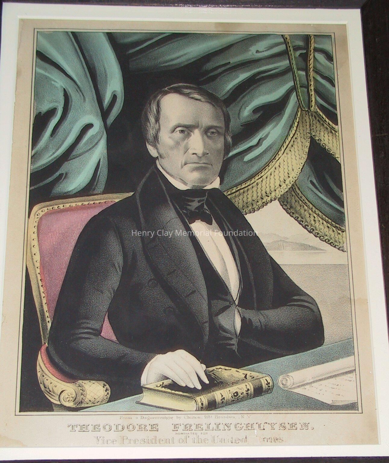 Nathaniel Currier Lithograph of Theodore Freylinghuysen. Image is of a man in a black coat, waistcoat, and crevat and white shirt sitting with left hand in coat and right on book on table in front of him. Also on table is a scroll. Behind man is burgundy chair back and blue drapes. Print is handcolored. Legend at the bottom reads: "From a Dauguerreotype by Chilton, 281 Broadway, NY Theodore Freylinghuysen nominated for Vice President of the United States." Framed in plain stained or painted dark wood frame under glass with U-shaped metal hanger at top.Dimensions