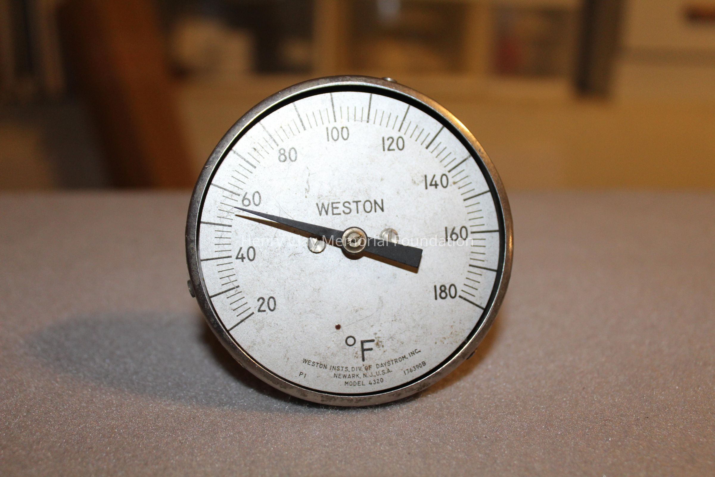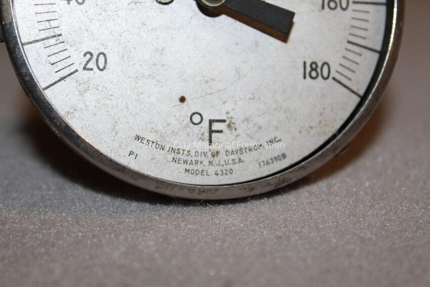 One round metal temperature gauge marked from 0 degrees to 180 degrees Fahrenheit, Has blakc indicator Gauge has metal tube stem extending from back of dial. Above the screw where the indicator mounts is the word Weston. At the bottom the dial is labeled: Weston Instrs. Div. of Daystom Inc. Newark, N.J. USA Model 4320 176390B.