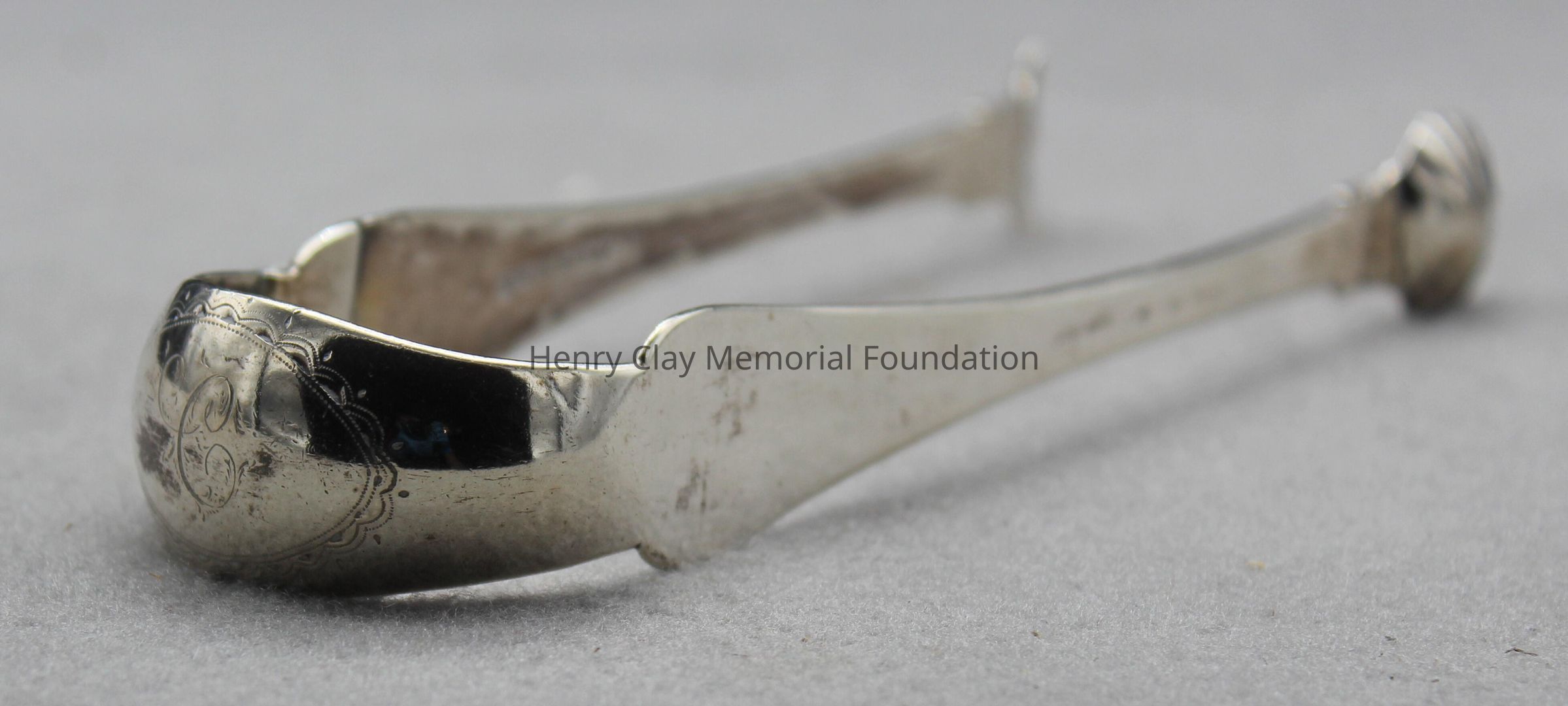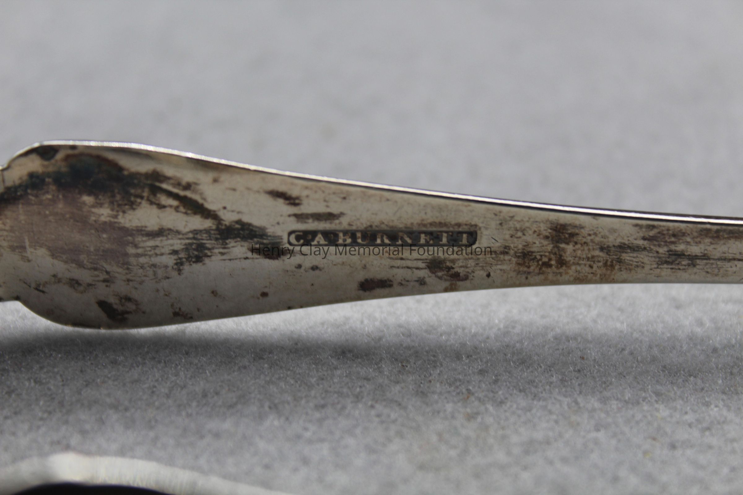 Coin silver sugar tongs. The apex of the tongs is engraved with a "C" surrounded by an oval border. The arms of the tongs terminate in shell shaped bowls, one of which is worn halfway away. The inside upper surface of one arm is stmaped CA Burnett.