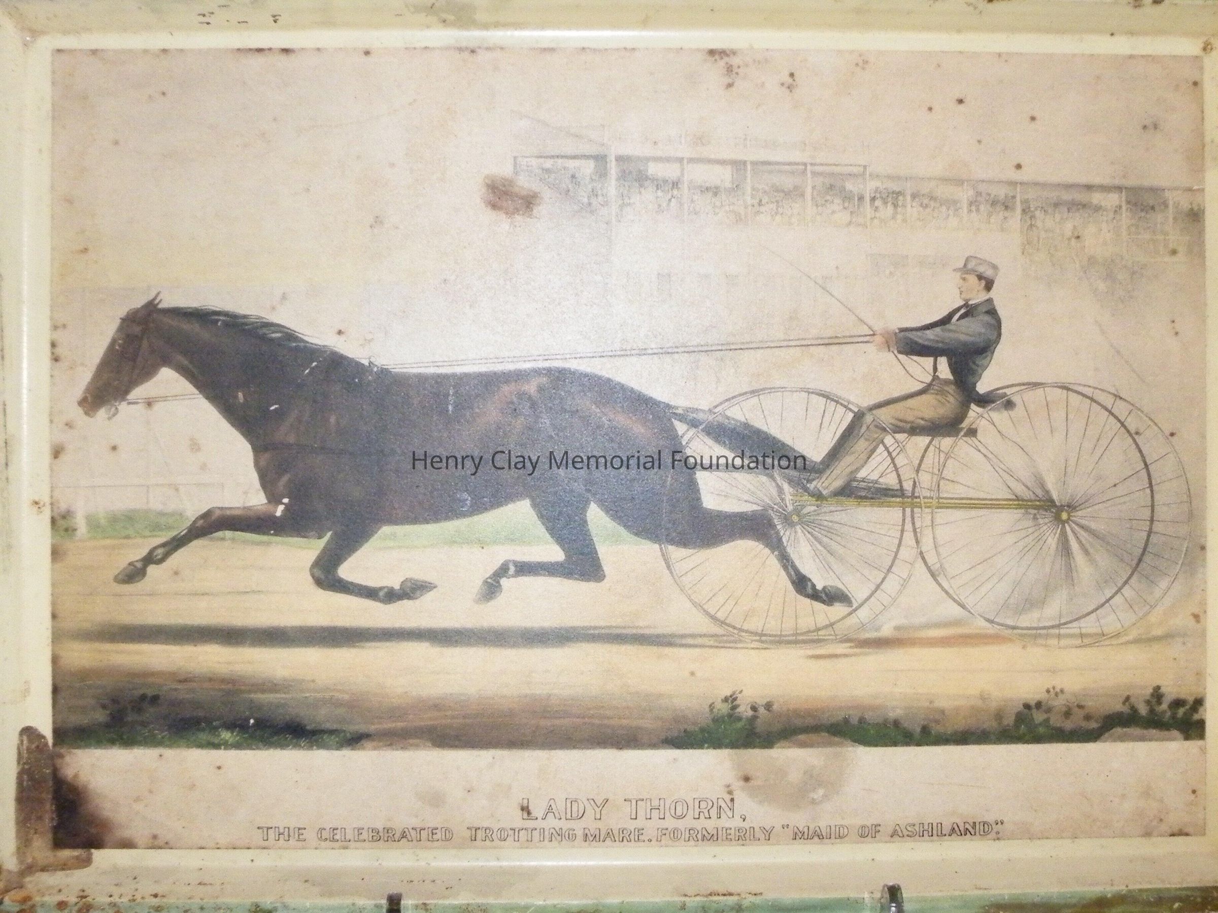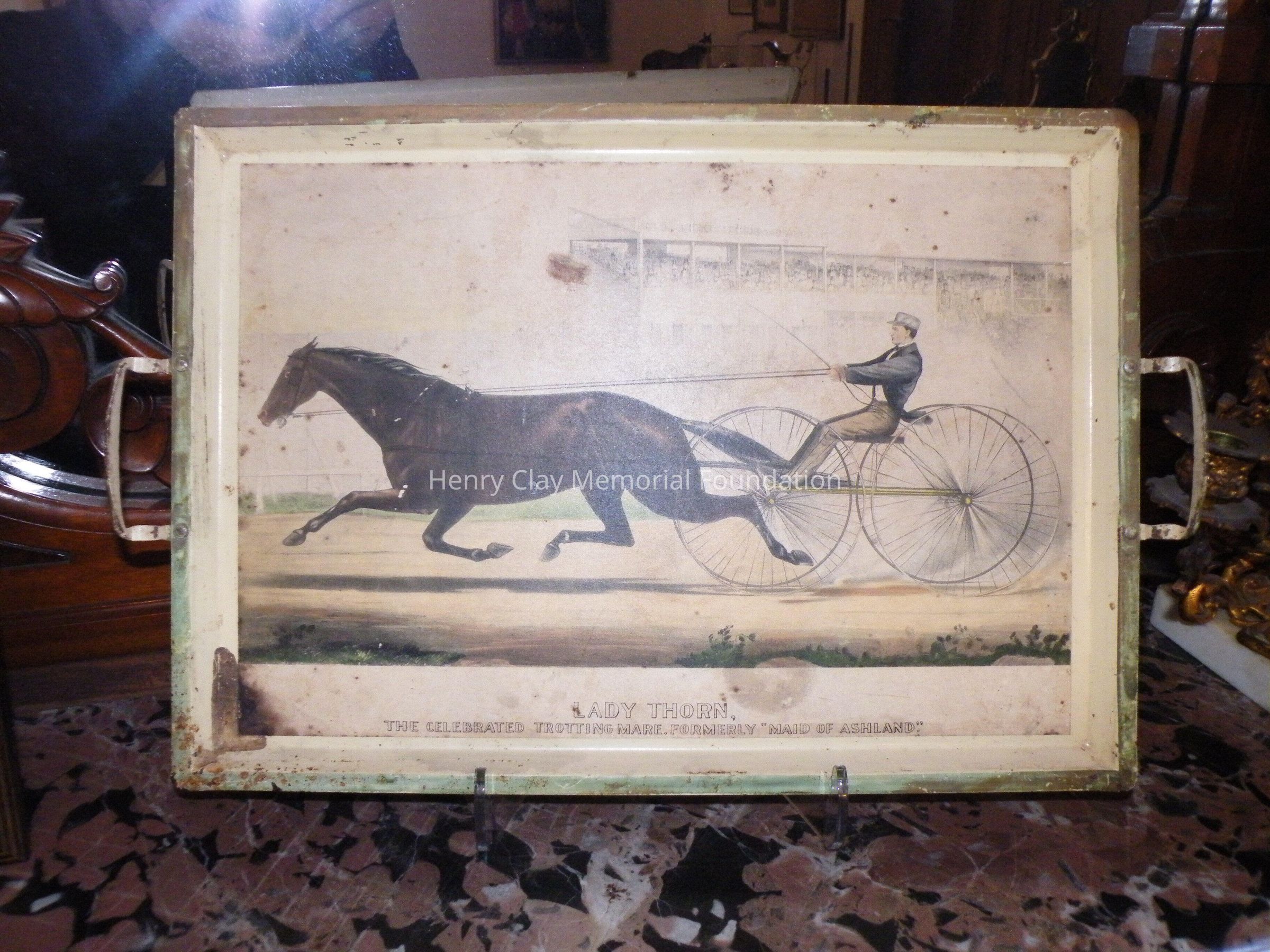 Tole tray with engraving of the trotter Lady Thorn pulling sulkey and jockey glued into it.
