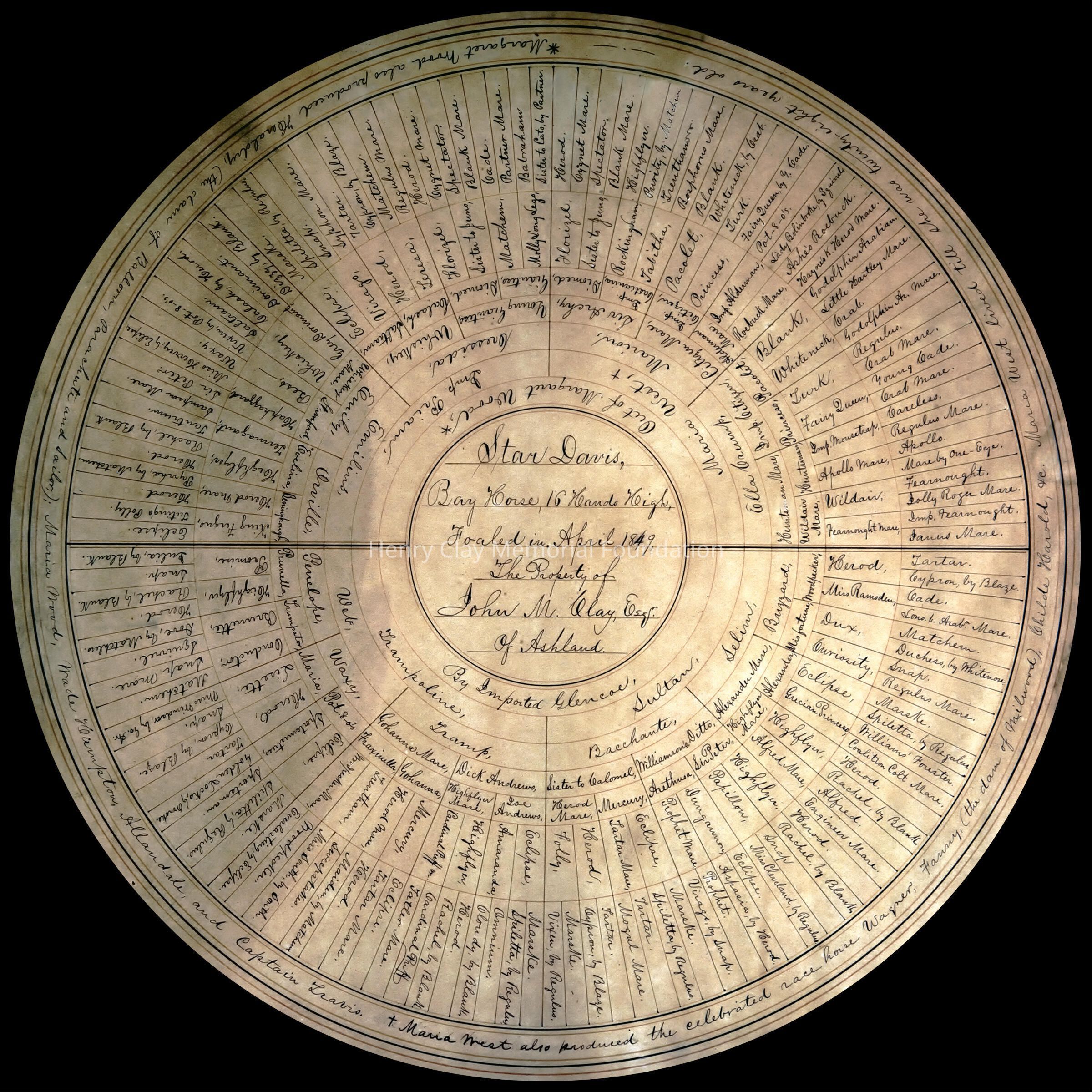 A pedigree of the horse Star Davis in wheel format. Framed in plain gold frame.
