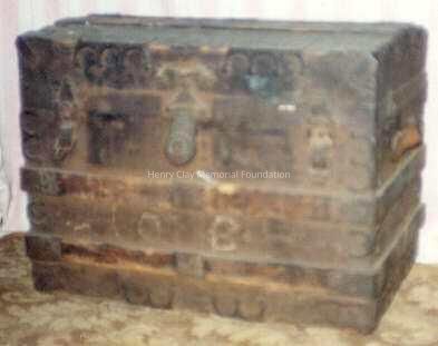 Military metal trunk with decorative wooden bonding, leather handle at the right side, partially missing on left side. Name printed in black on right side, "C.D. Clay" and "U.S." below. Two metal catches at sides of front with '4' above- central larger, metal lock with key hole. Interior-- lined in fabric with maroon bonding inside lid. Right back hinge has patent on it, which is barely legible, "PAT July [illegible]." Metal wheels on bottom.Dimensions