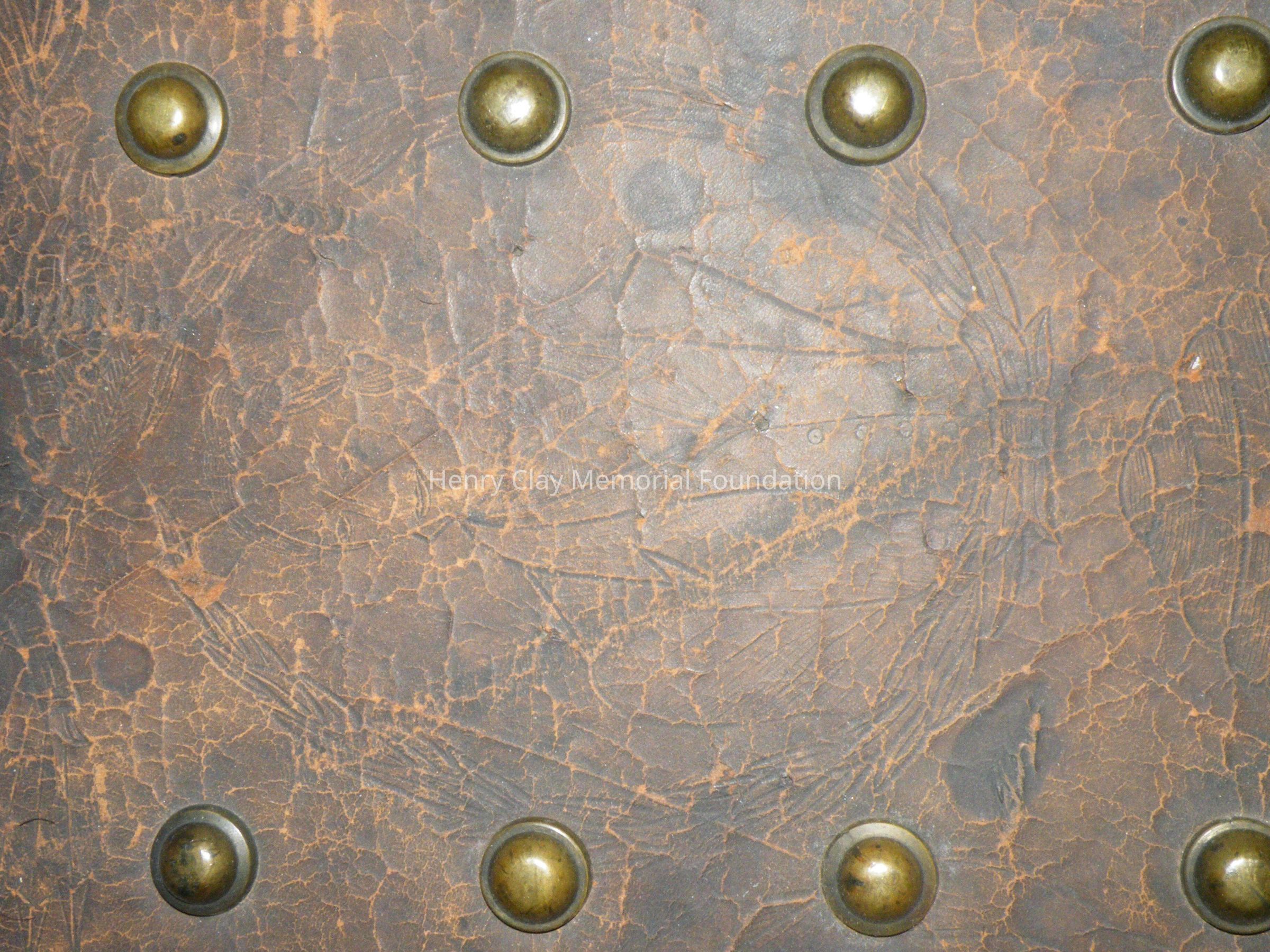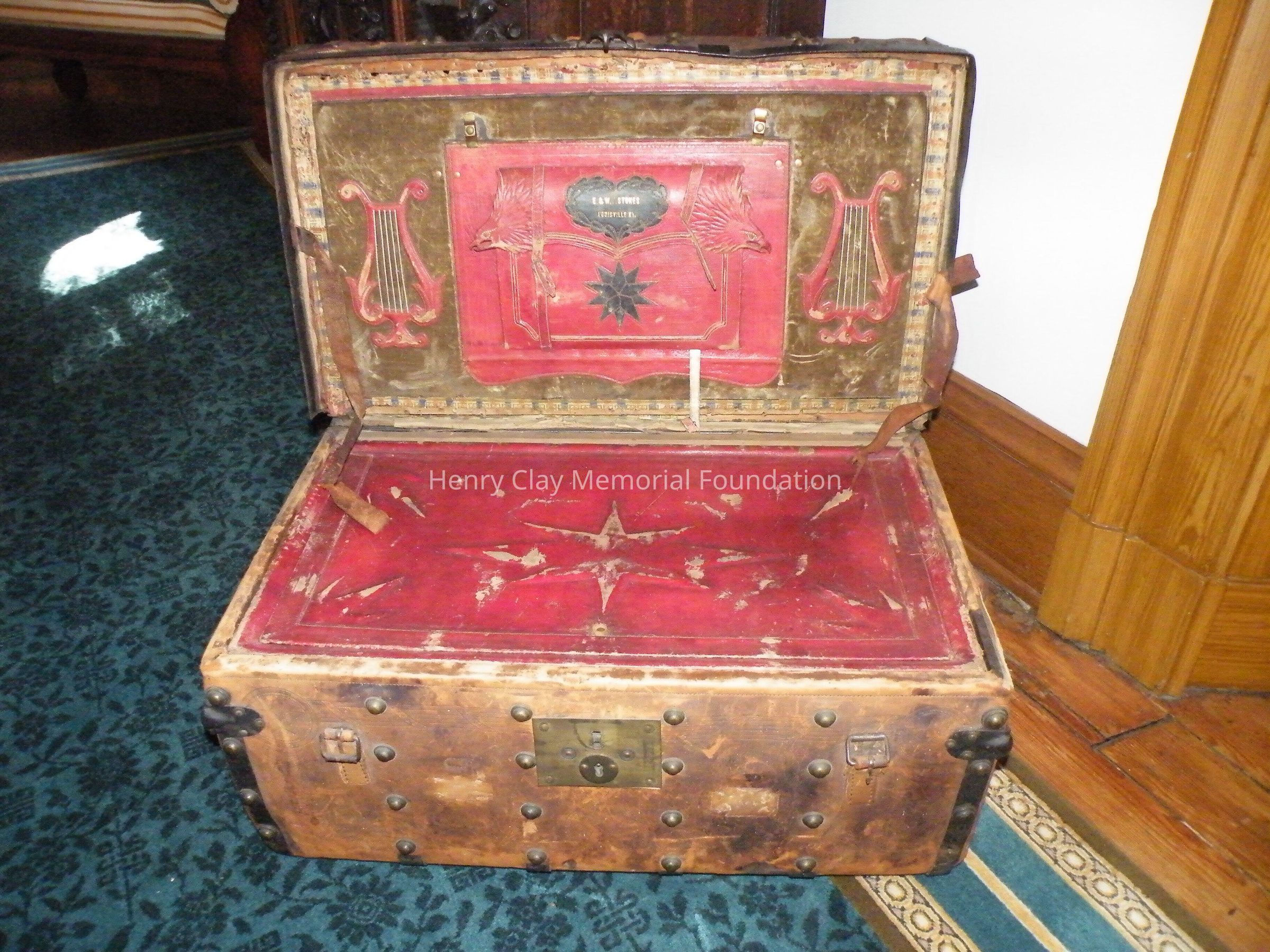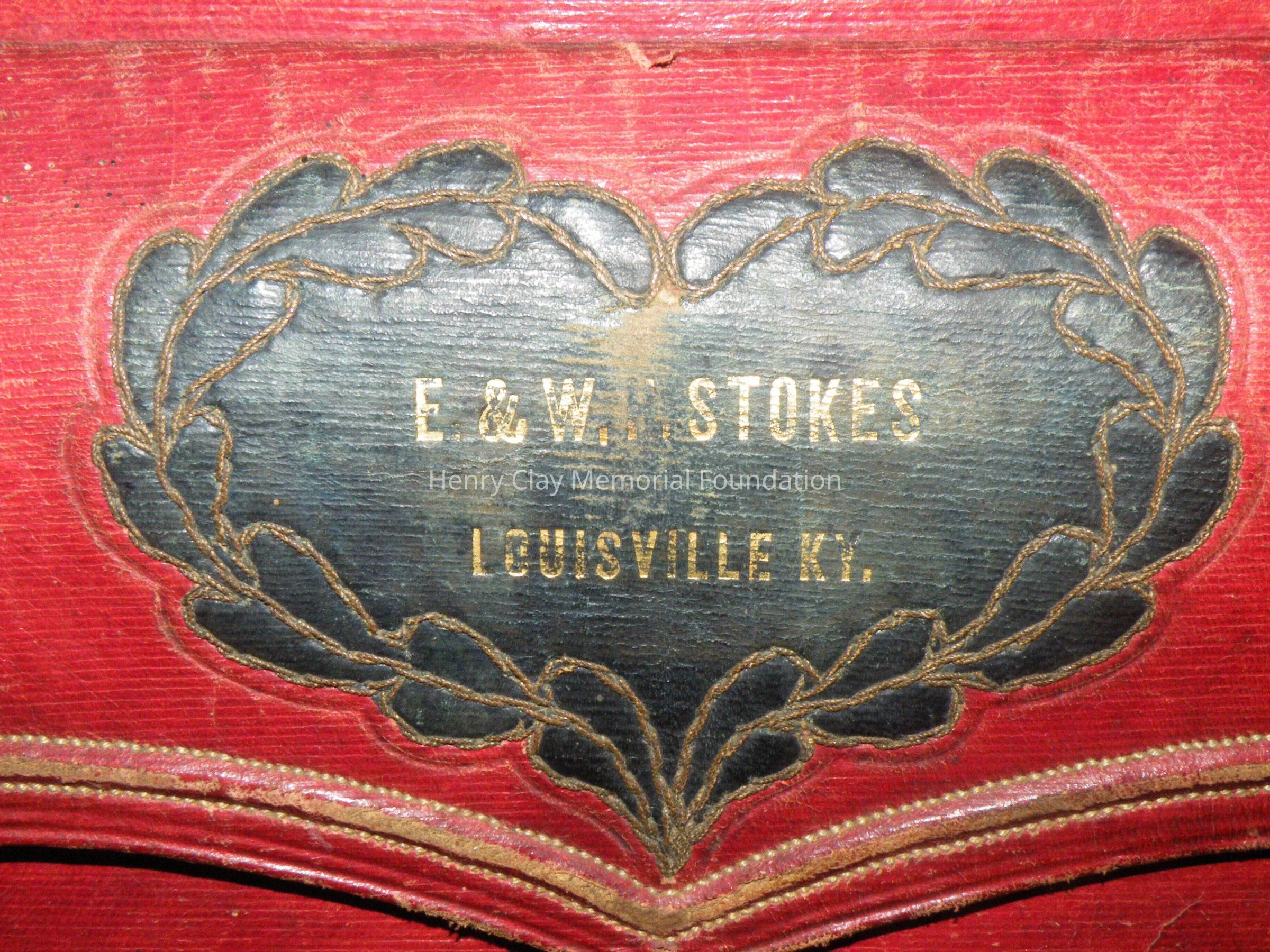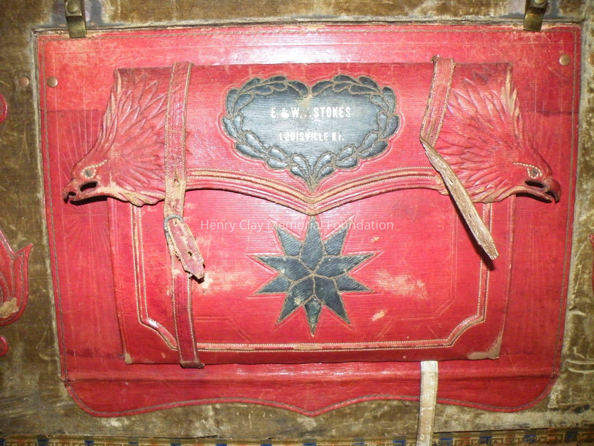 Leather with hinged lid, with gold-embossed maker's mark "E. and W.H. Stokes / Louisville KY." Brass-studded bands around trunk and tooled with eagles and other designs in leather. Inside is lined with red and green velvet. Red lyre decorations and eagles on pocket on inside lid. Inner tray sits above main storage compartment. The tooled designs on the outside include Henry Clay, Lady Justice, Lady Liberty, a plow and a beehive.Dimensions