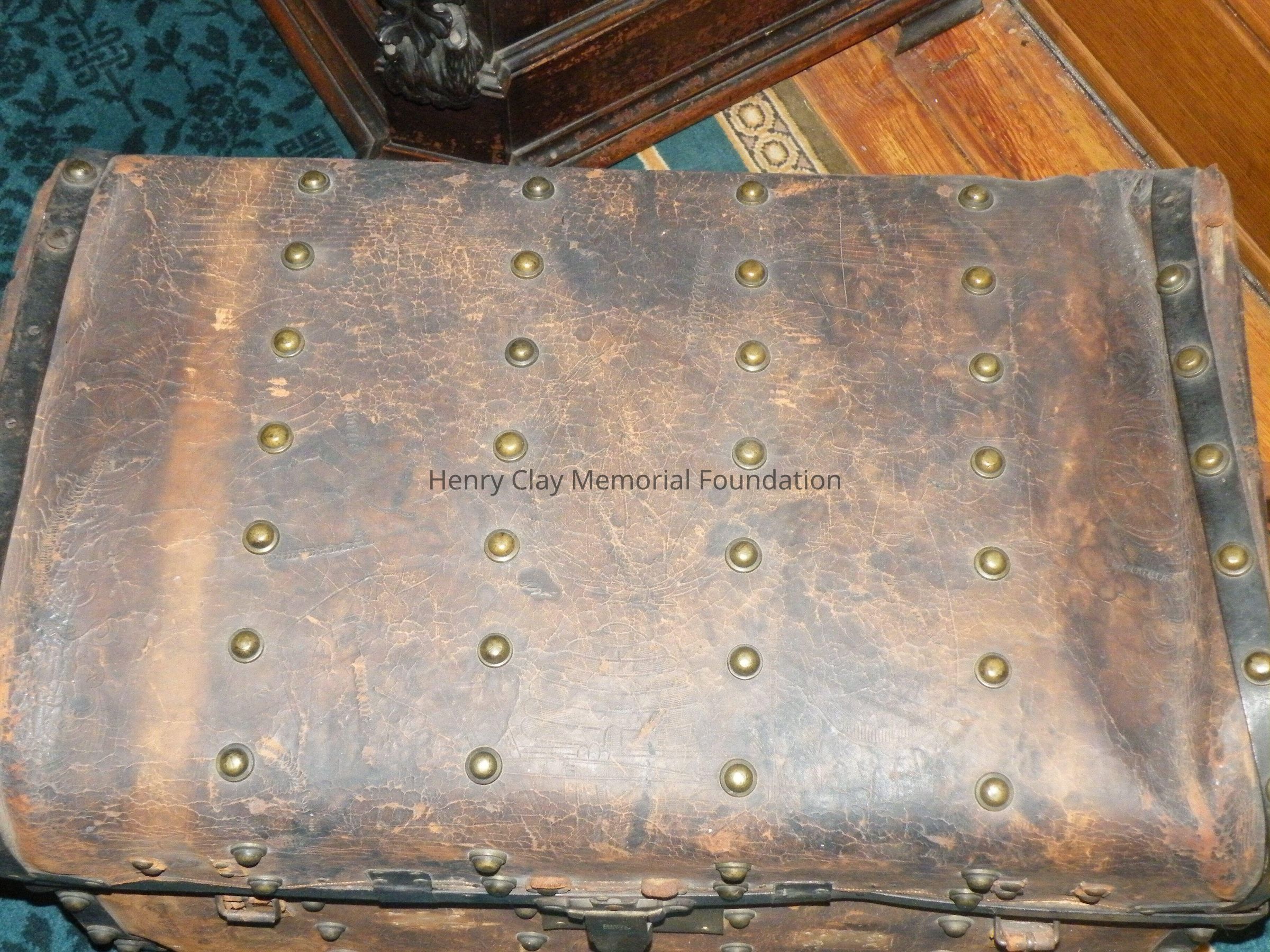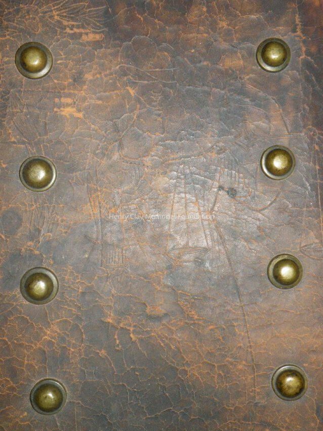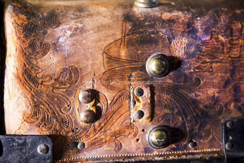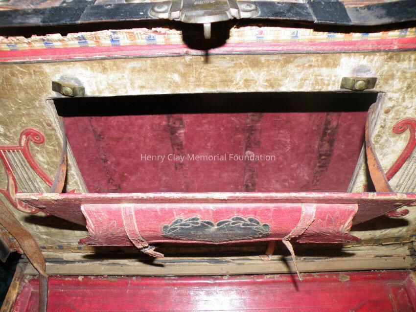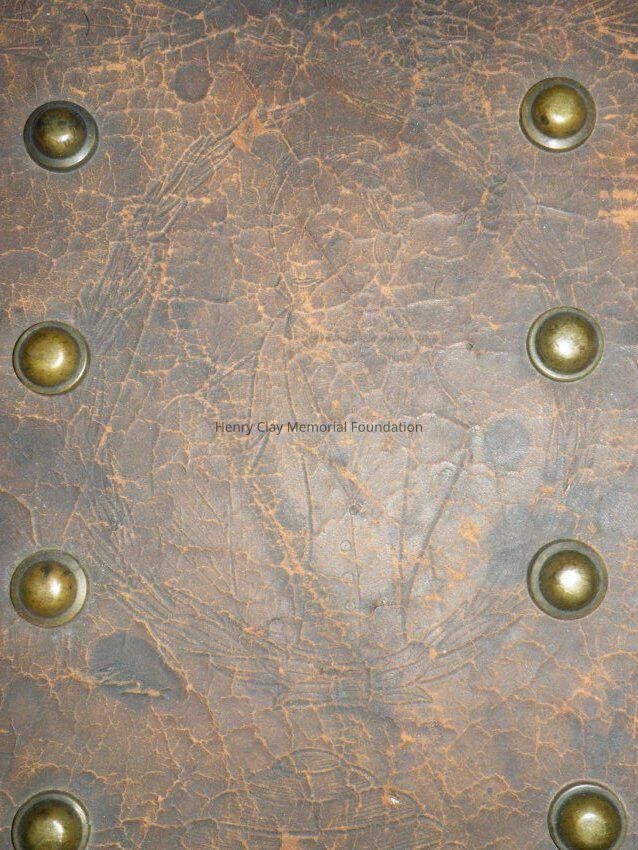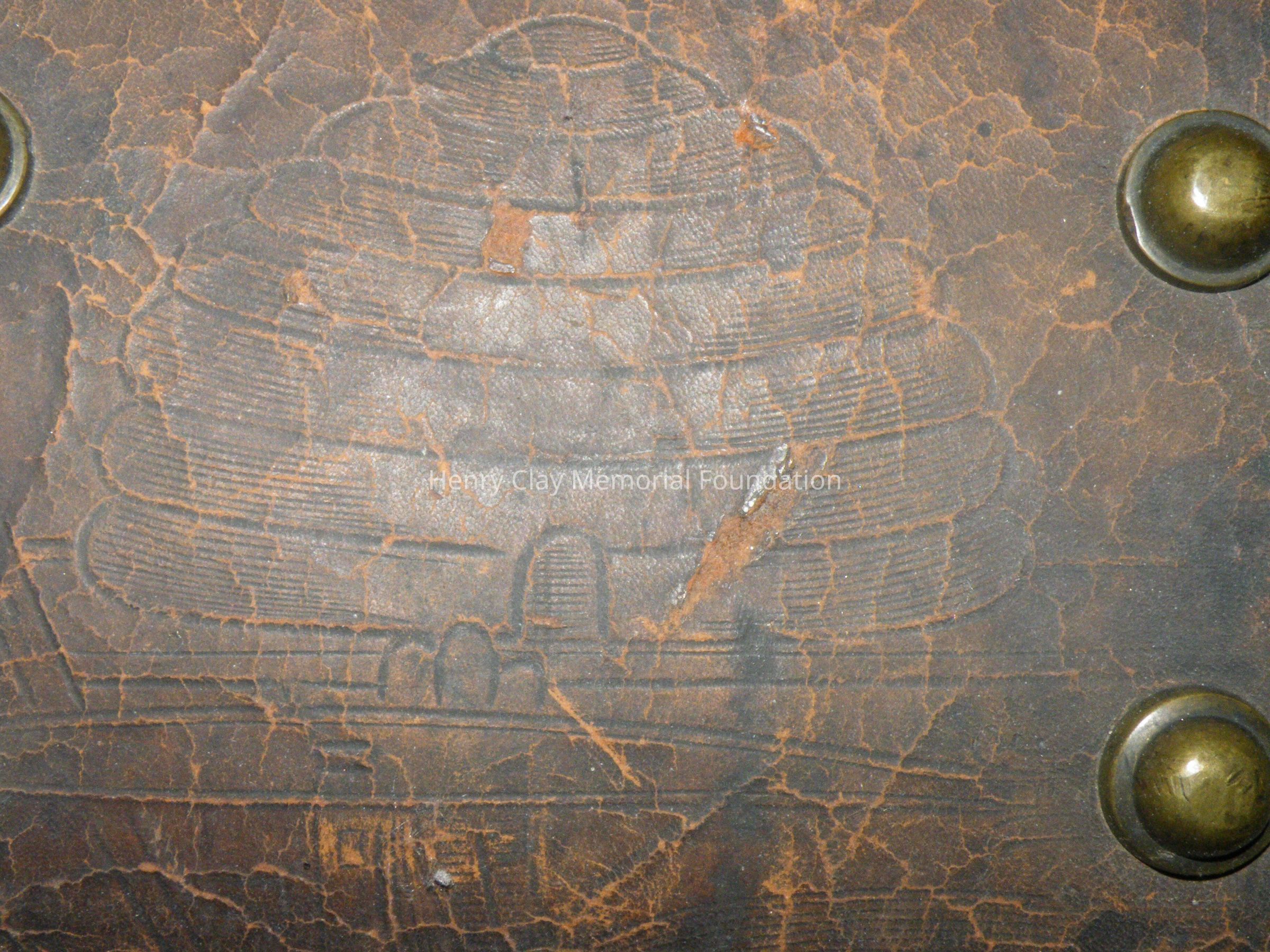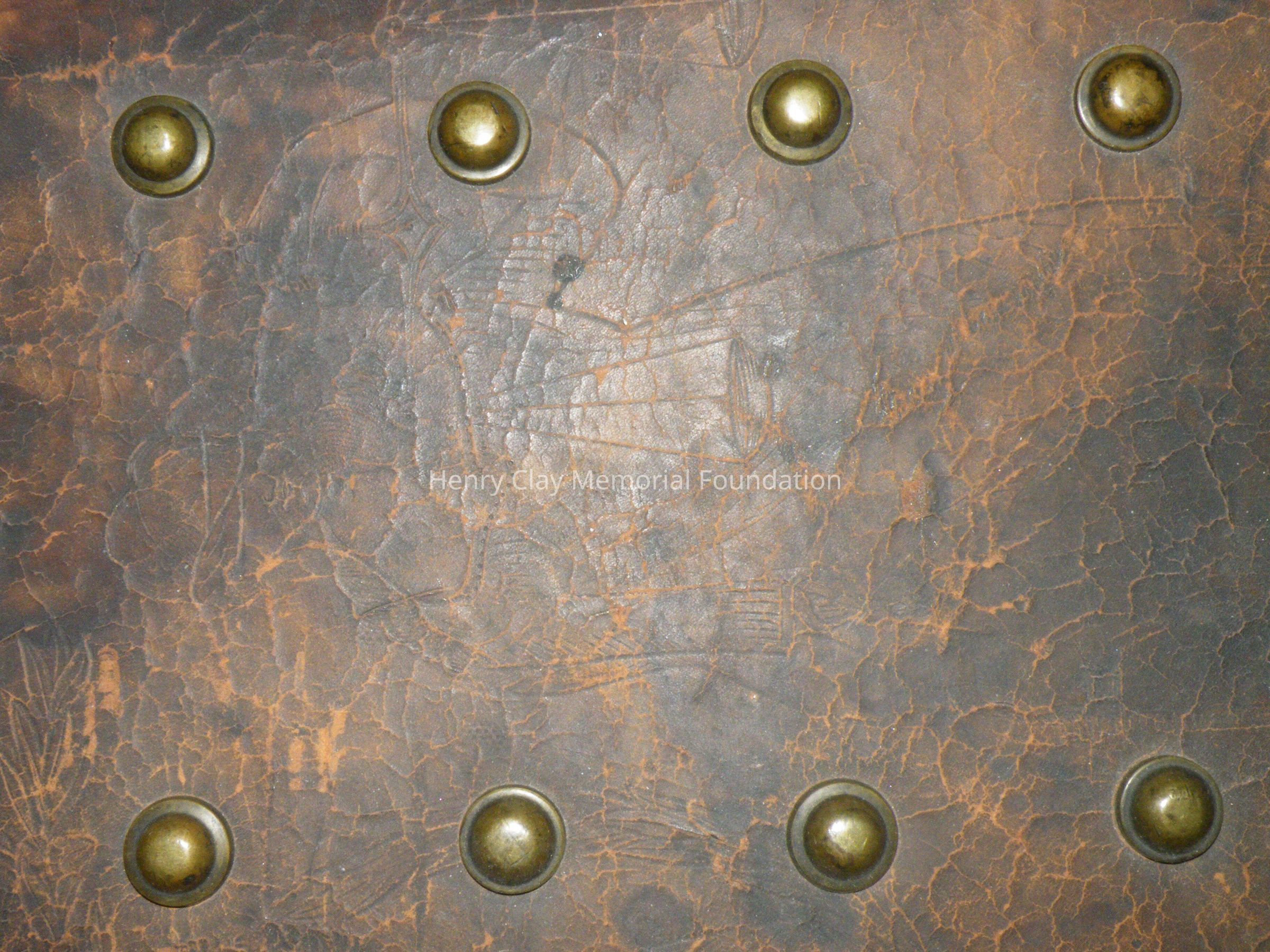 Leather with hinged lid, with gold-embossed maker's mark "E. and W.H. Stokes / Louisville KY." Brass-studded bands around trunk and tooled with eagles and other designs in leather. Inside is lined with red and green velvet. Red lyre decorations and eagles on pocket on inside lid. Inner tray sits above main storage compartment. The tooled designs on the outside include Henry Clay, Lady Justice, Lady Liberty, a plow and a beehive.Dimensions