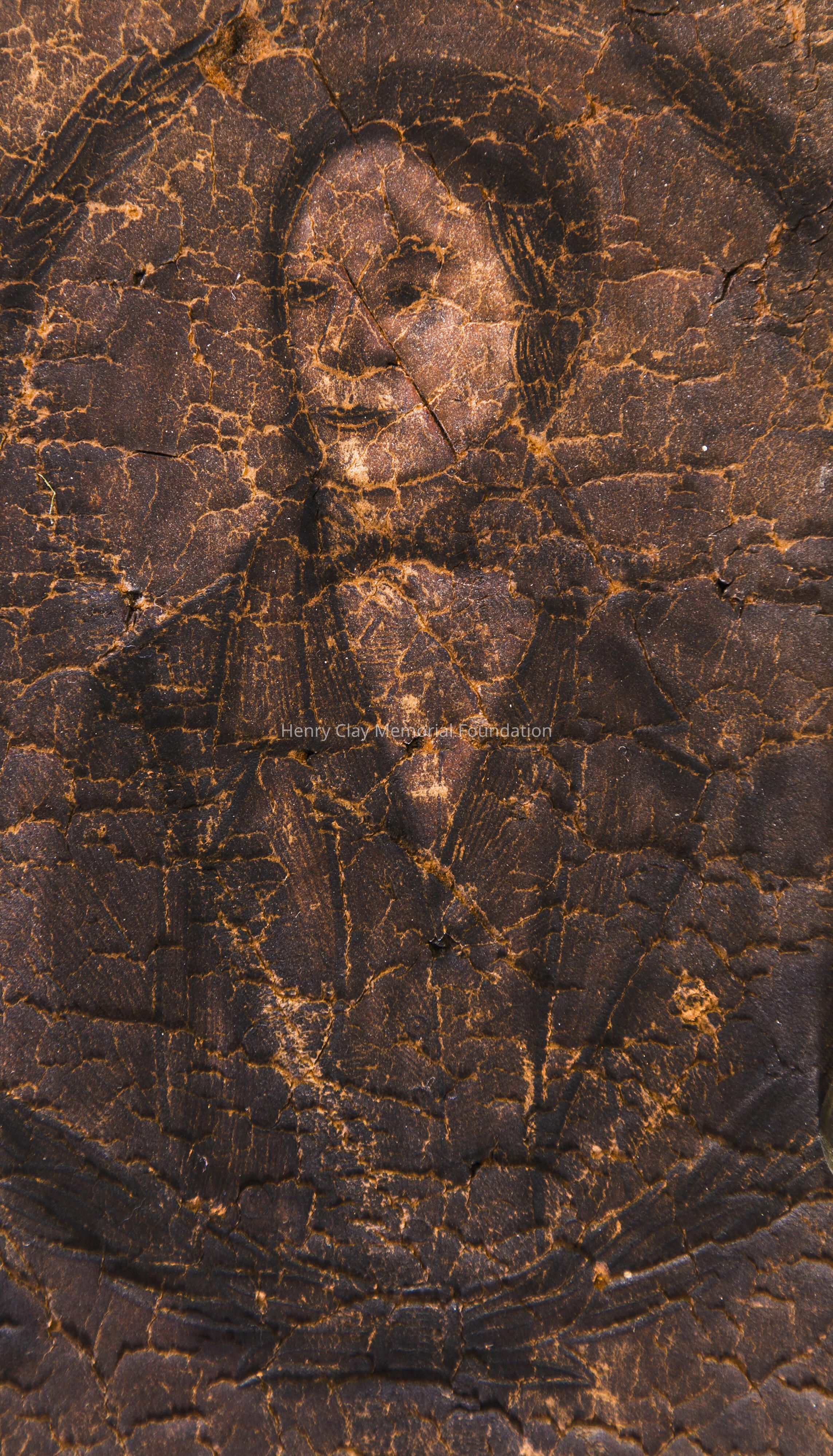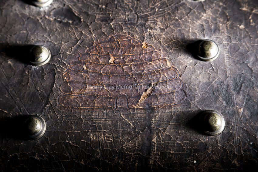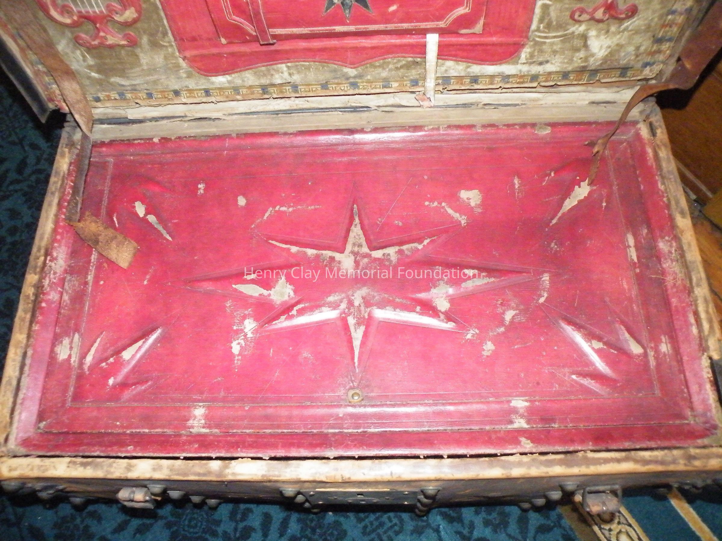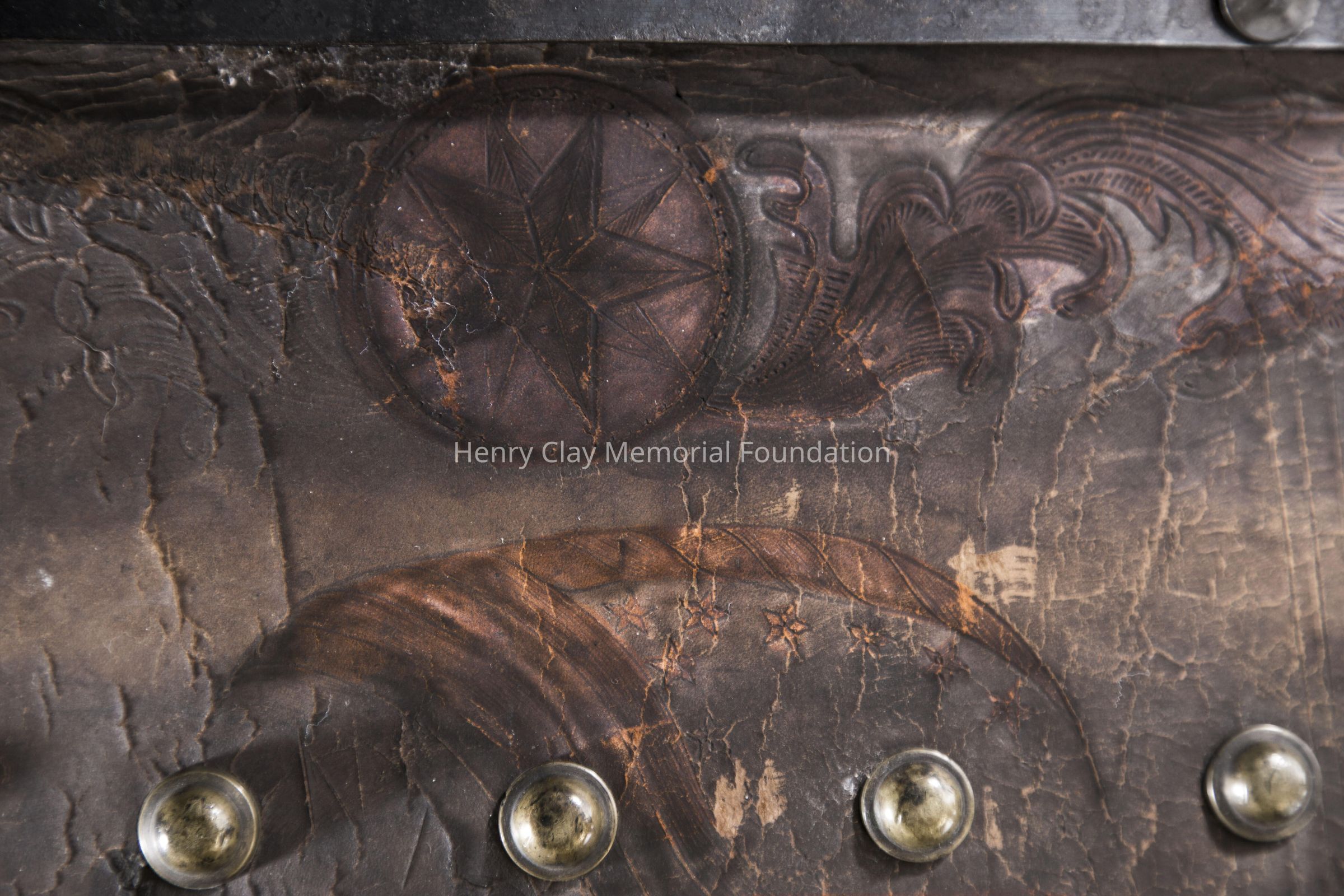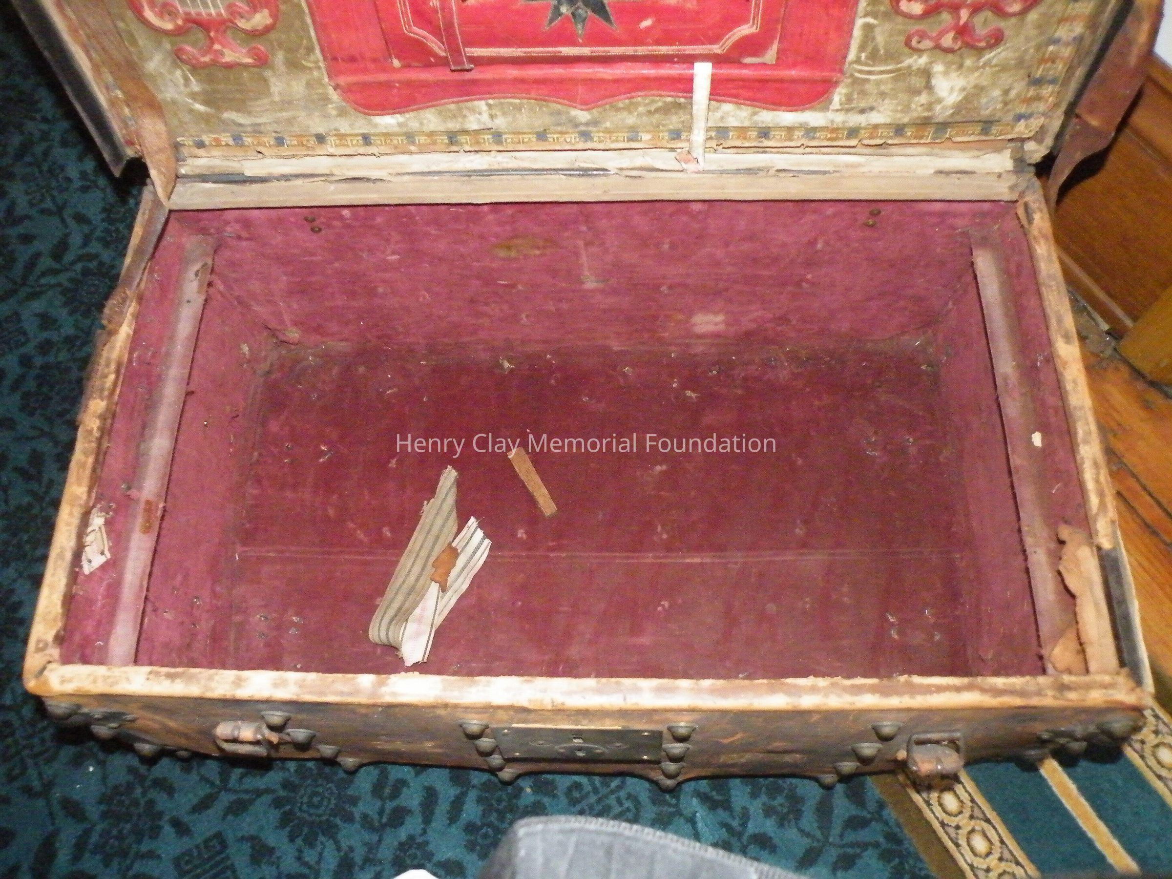 Leather with hinged lid, with gold-embossed maker's mark "E. and W.H. Stokes / Louisville KY." Brass-studded bands around trunk and tooled with eagles and other designs in leather. Inside is lined with red and green velvet. Red lyre decorations and eagles on pocket on inside lid. Inner tray sits above main storage compartment. The tooled designs on the outside include Henry Clay, Lady Justice, Lady Liberty, a plow and a beehive.Dimensions