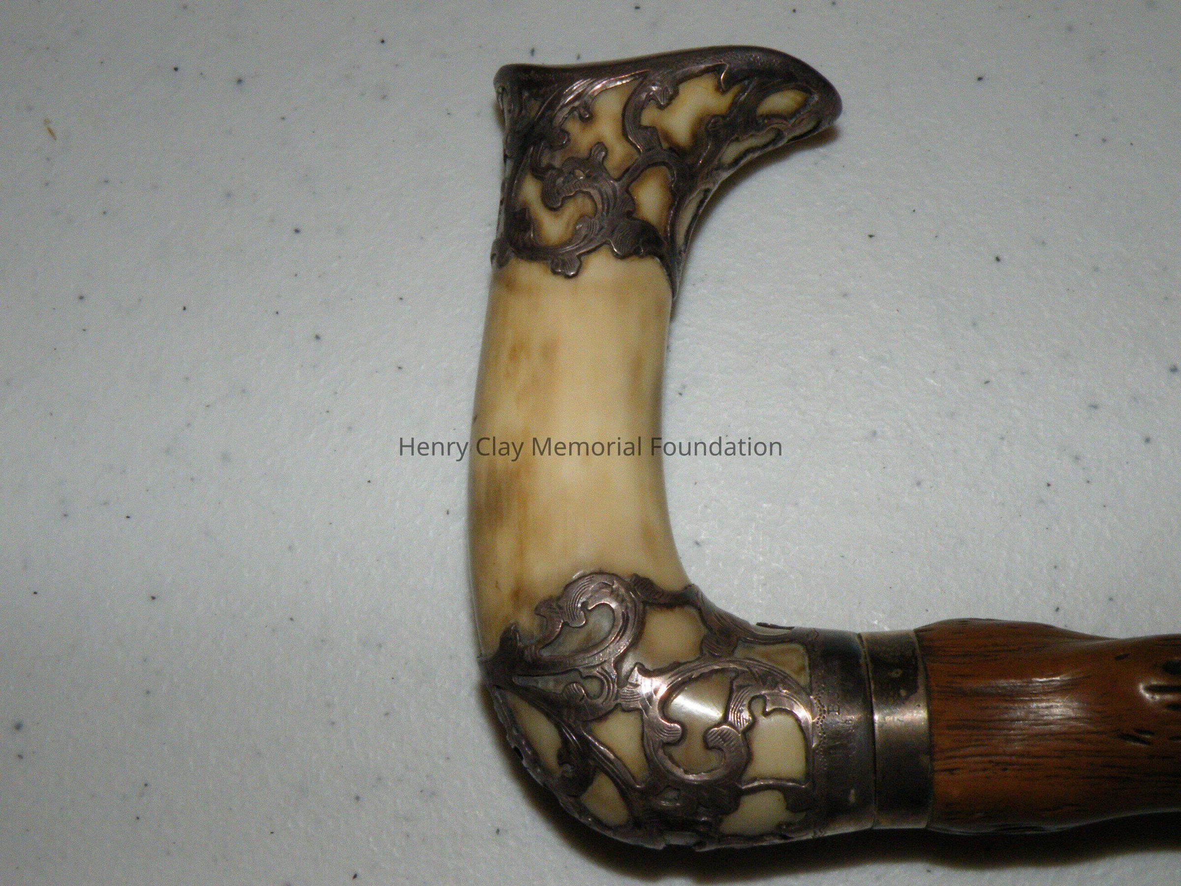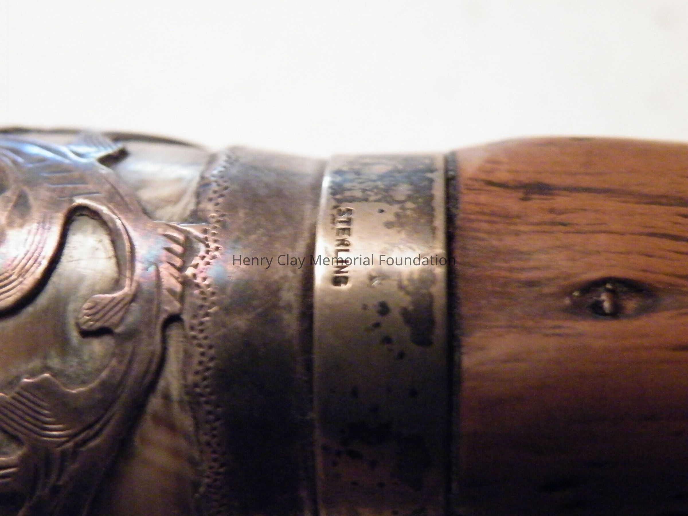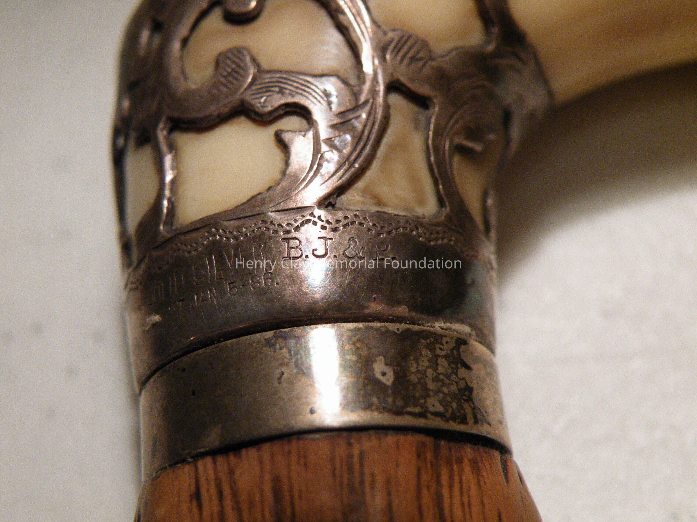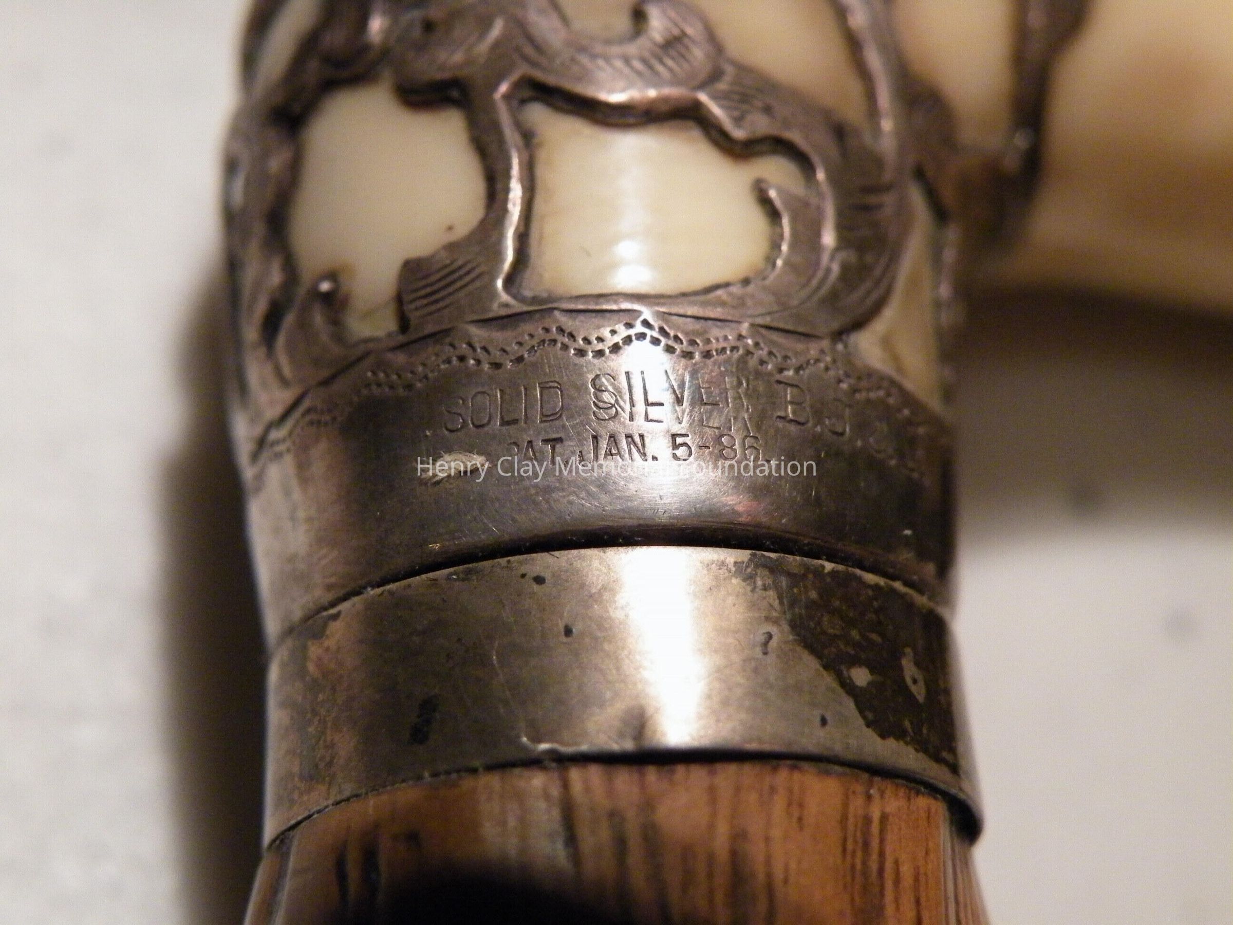 A black silk umbrella. The ribs are metal and the shaft is wooden. The handle is bone or ivory overlaid with silver filigree. The silver is stamped "Solid Silver" B S & P," "Pat. Jan 5 '86," and "Sterling." The end of the handle is engraved: "Dr. TS Bullock."