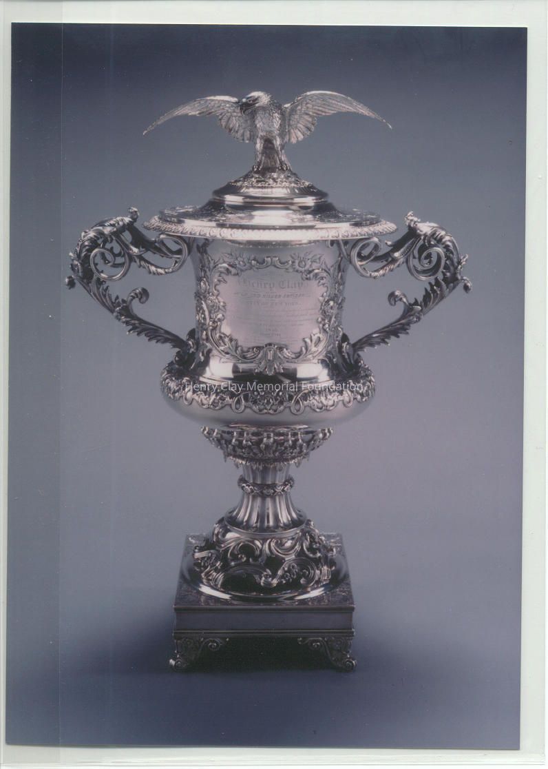 Silver urn with removable lid with an eagle on top. The urn is on a square base, footed at each corner. Two scrolled handles on sides. The urn is higly decorated with intricate metal work and detail. Inscribed: "Presented to Henry Clay by the Gold and Silver Artisans of the City of New York, as a tribute of their respect for the faithful and patriotic manner in which he has discharged his high public trusts and especially for his early and untiring advocacy of Protection to American Industry. 1845. Committee: William Adams, Moses G. Baldwin, Alfred G. Pickham, Edward Y. Prime, Daniel Carpenter, David Dunn." Made by William Adams, Manufacturer of Silver Ware, New York, 1845.Dimensions