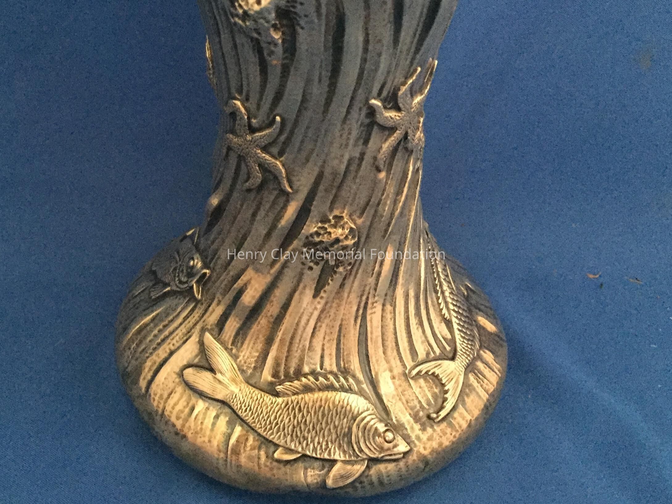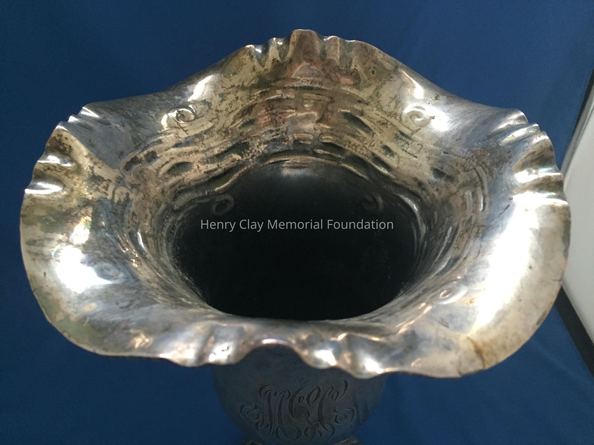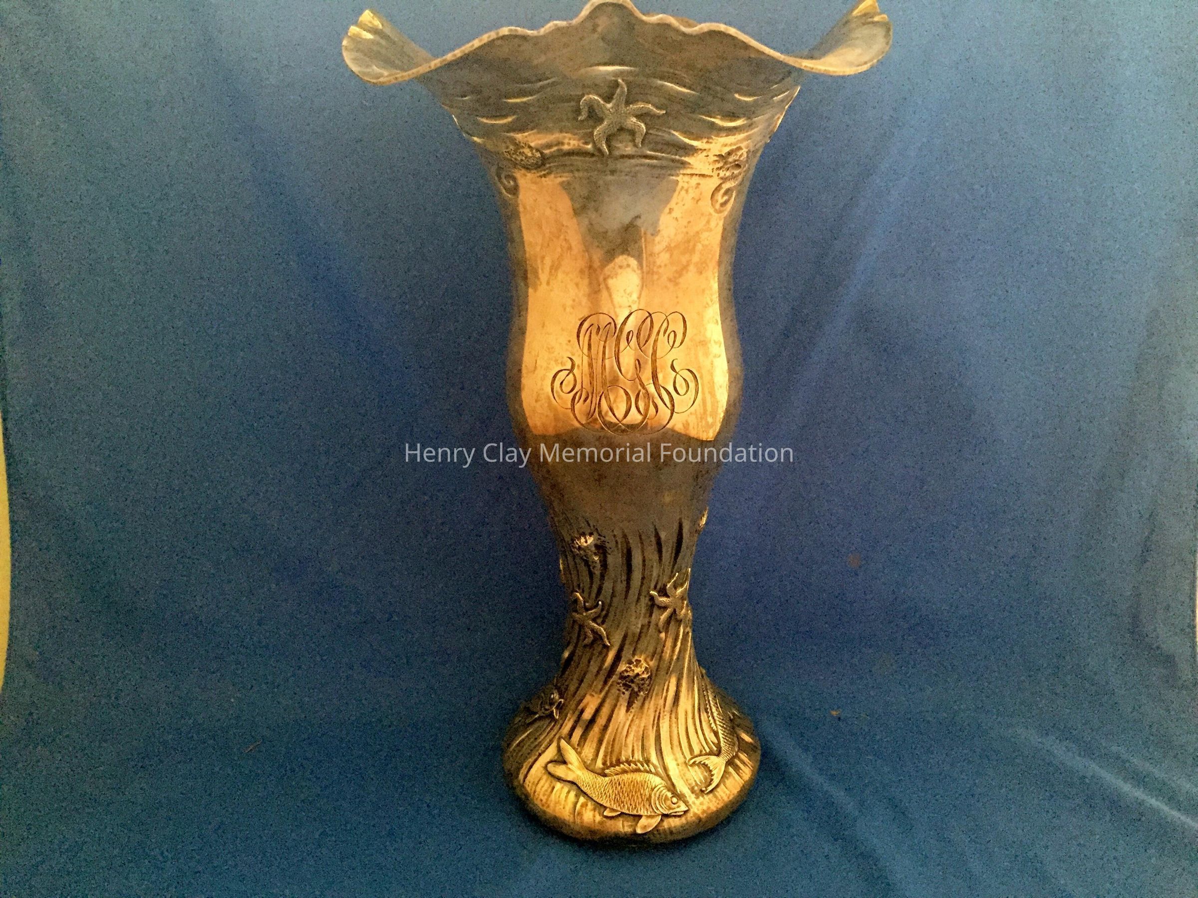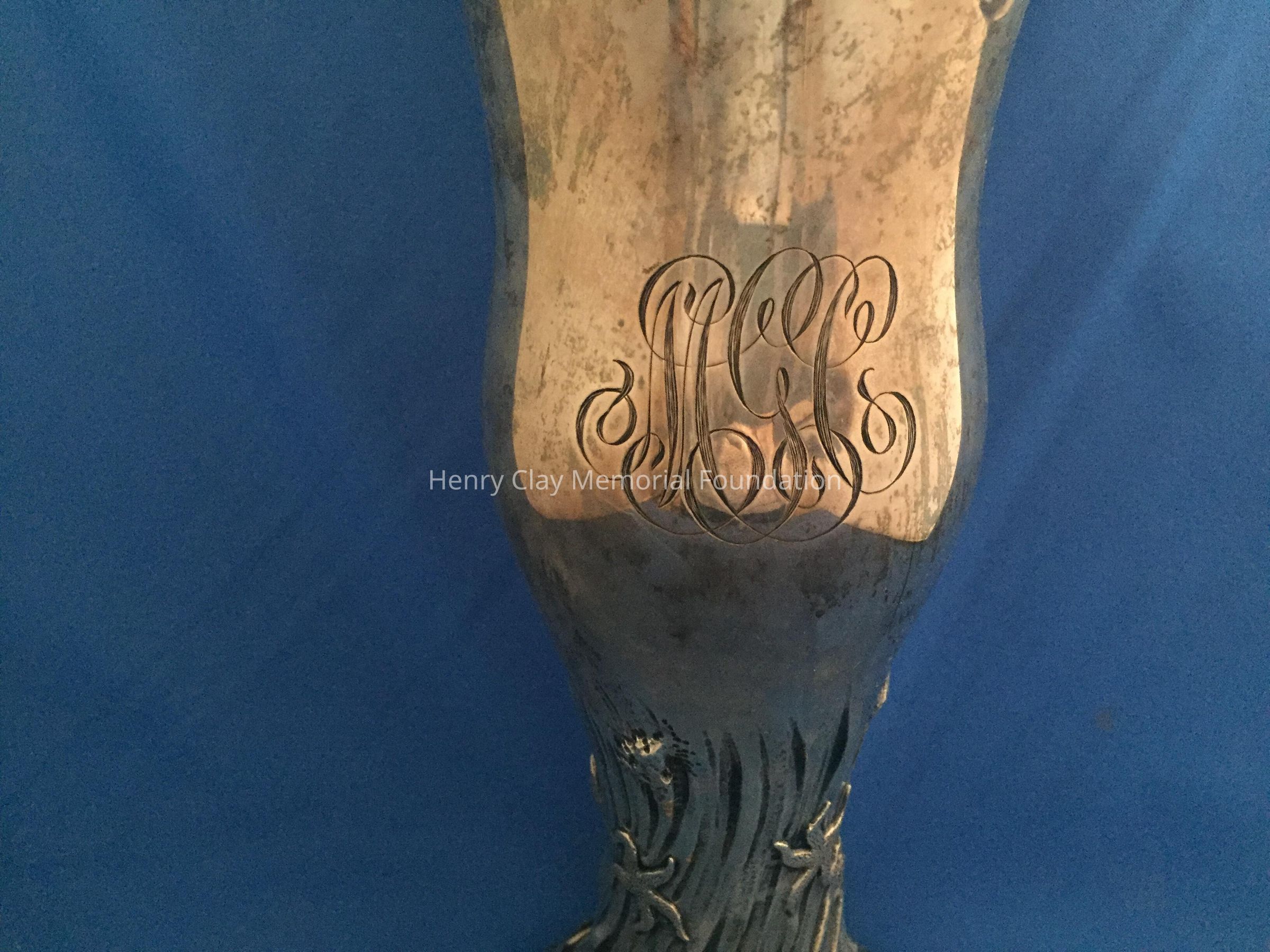 Sterling silver flower vase monogrammed "MGC." Early 20th century, American, crimped and scalloped rim with repousse work of waves, sea life underneath rim and around base. Made by George Shiebler, marked "A. Stowell & Co. 3030" on bottom with stamped hallmark of a winged letter "s." Engraved on bottom: "Frances and William [Fitzhenry] December 25, 1948."Dimensions