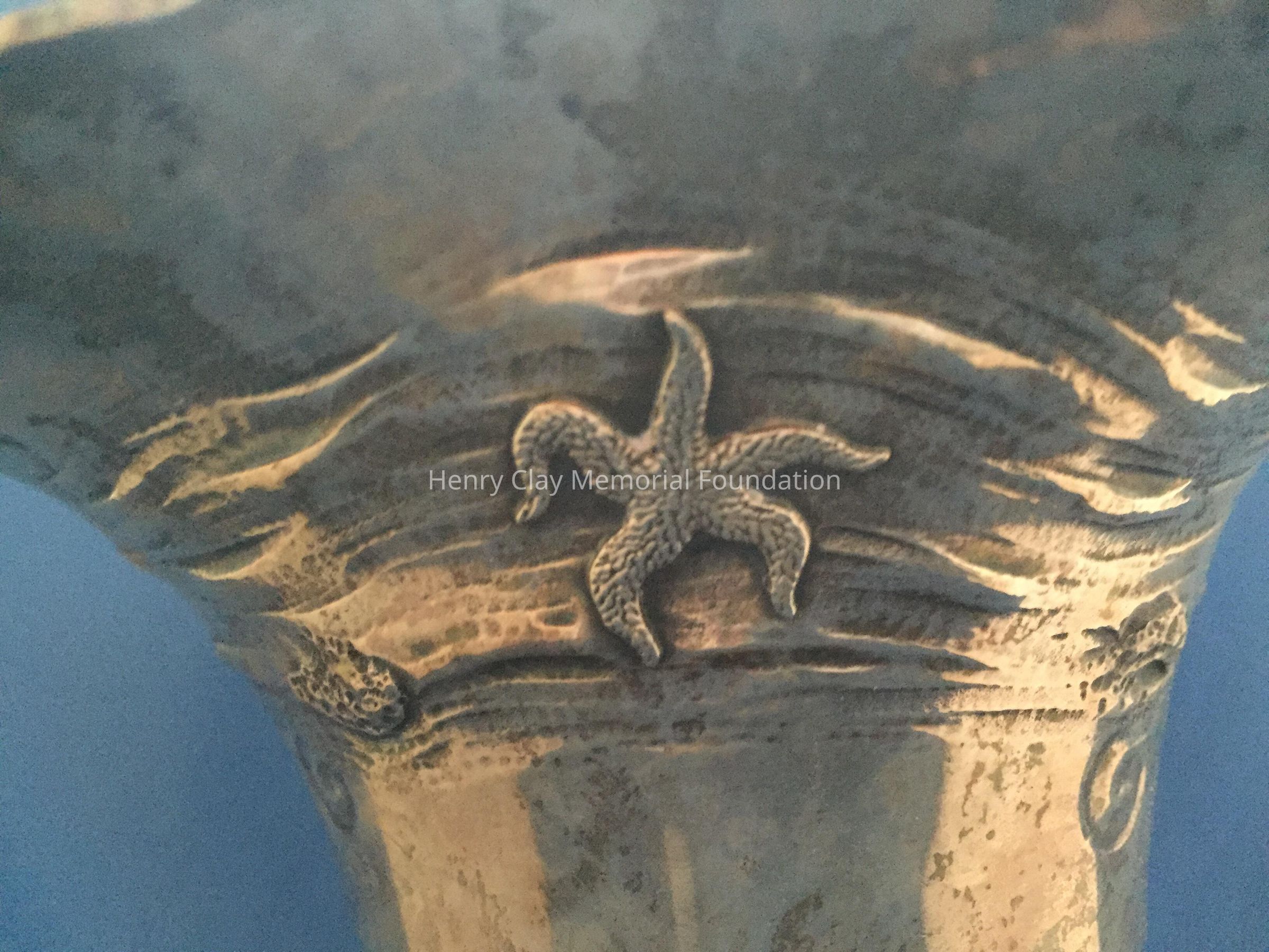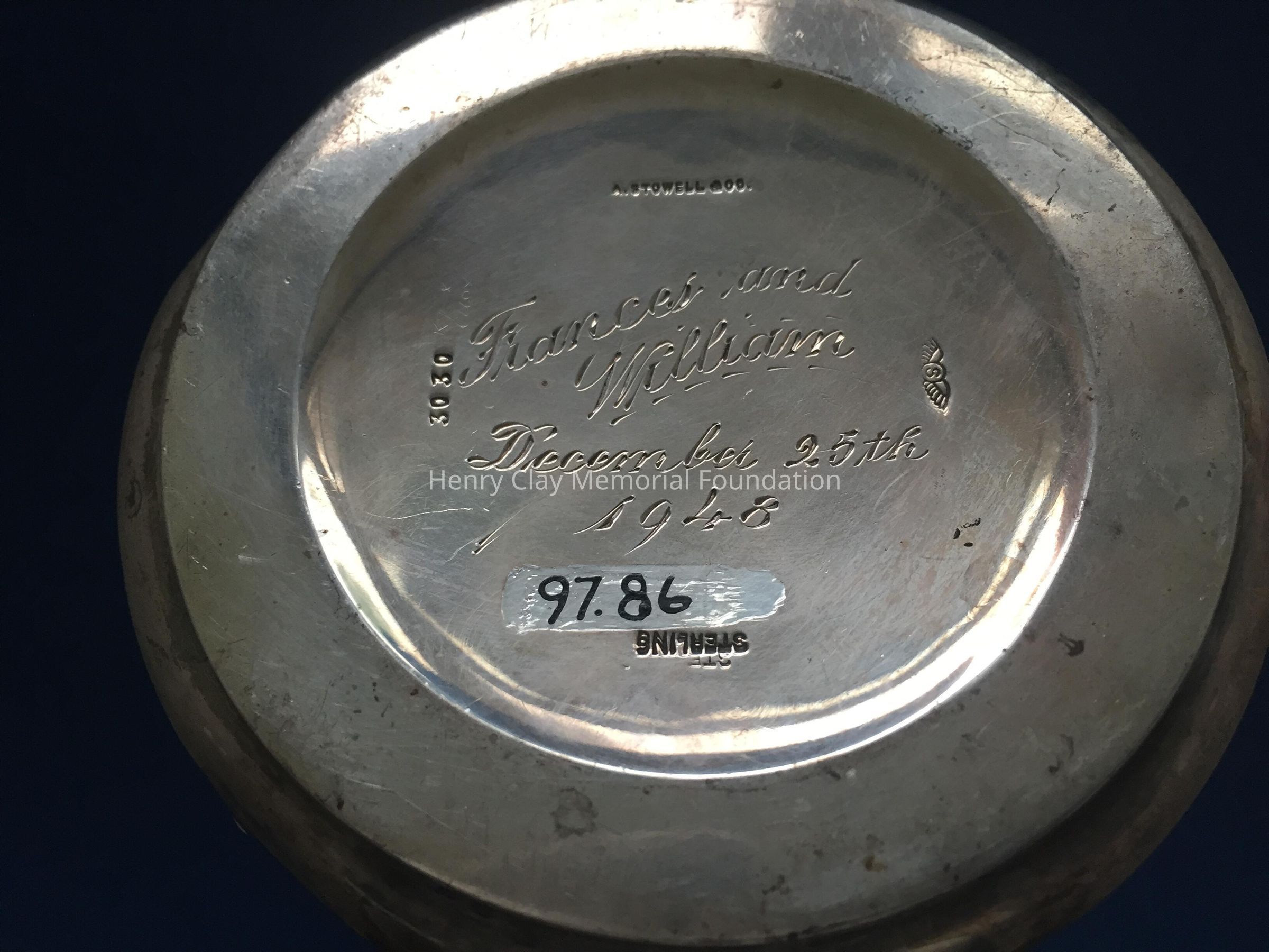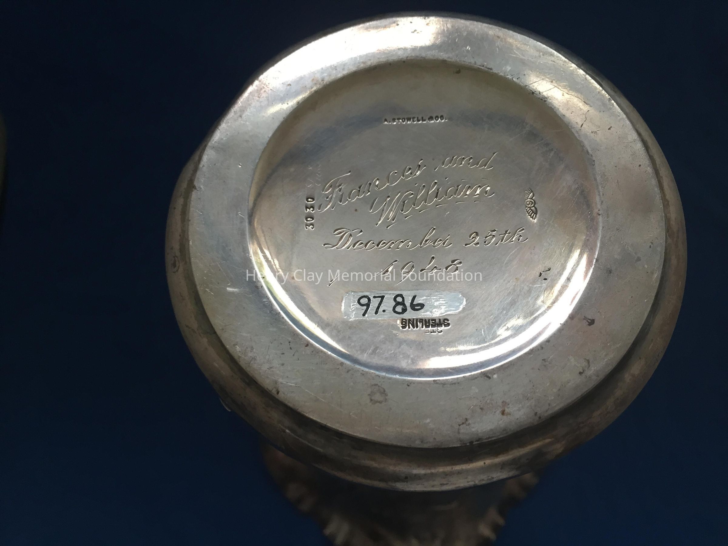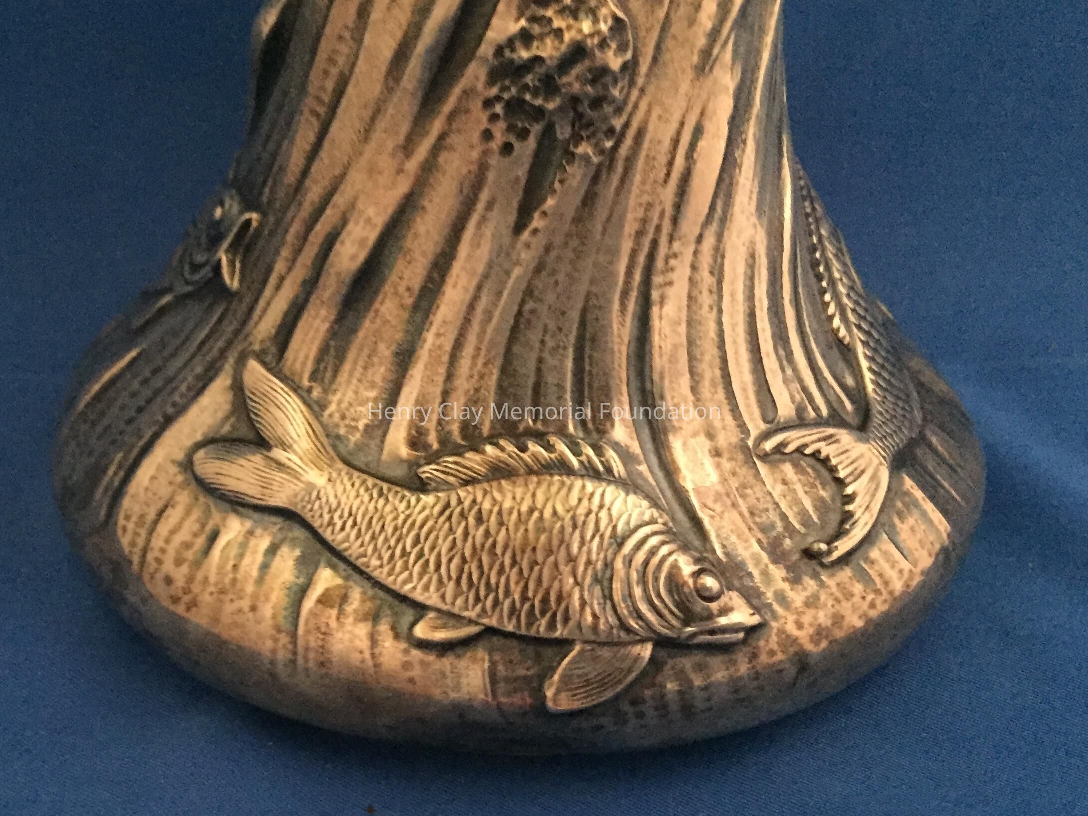 Sterling silver flower vase monogrammed "MGC." Early 20th century, American, crimped and scalloped rim with repousse work of waves, sea life underneath rim and around base. Made by George Shiebler, marked "A. Stowell & Co. 3030" on bottom with stamped hallmark of a winged letter "s." Engraved on bottom: "Frances and William [Fitzhenry] December 25, 1948."Dimensions