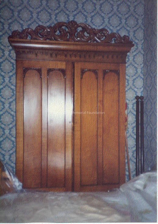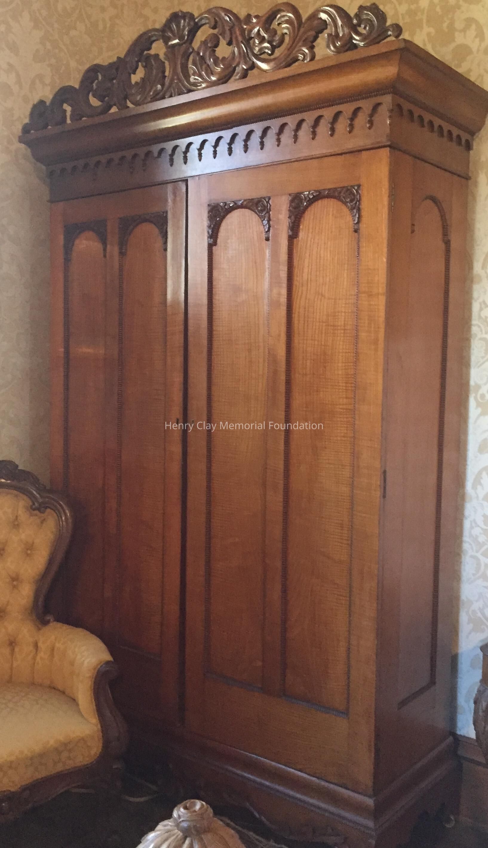 Ash, part of James B. Clay's bedroom set, 2 matching armoires with elaborately carved tops and on casters. Armoire "a" has an inside label written in ink: "James B. Clay, Lexington, KY."Dimensions
