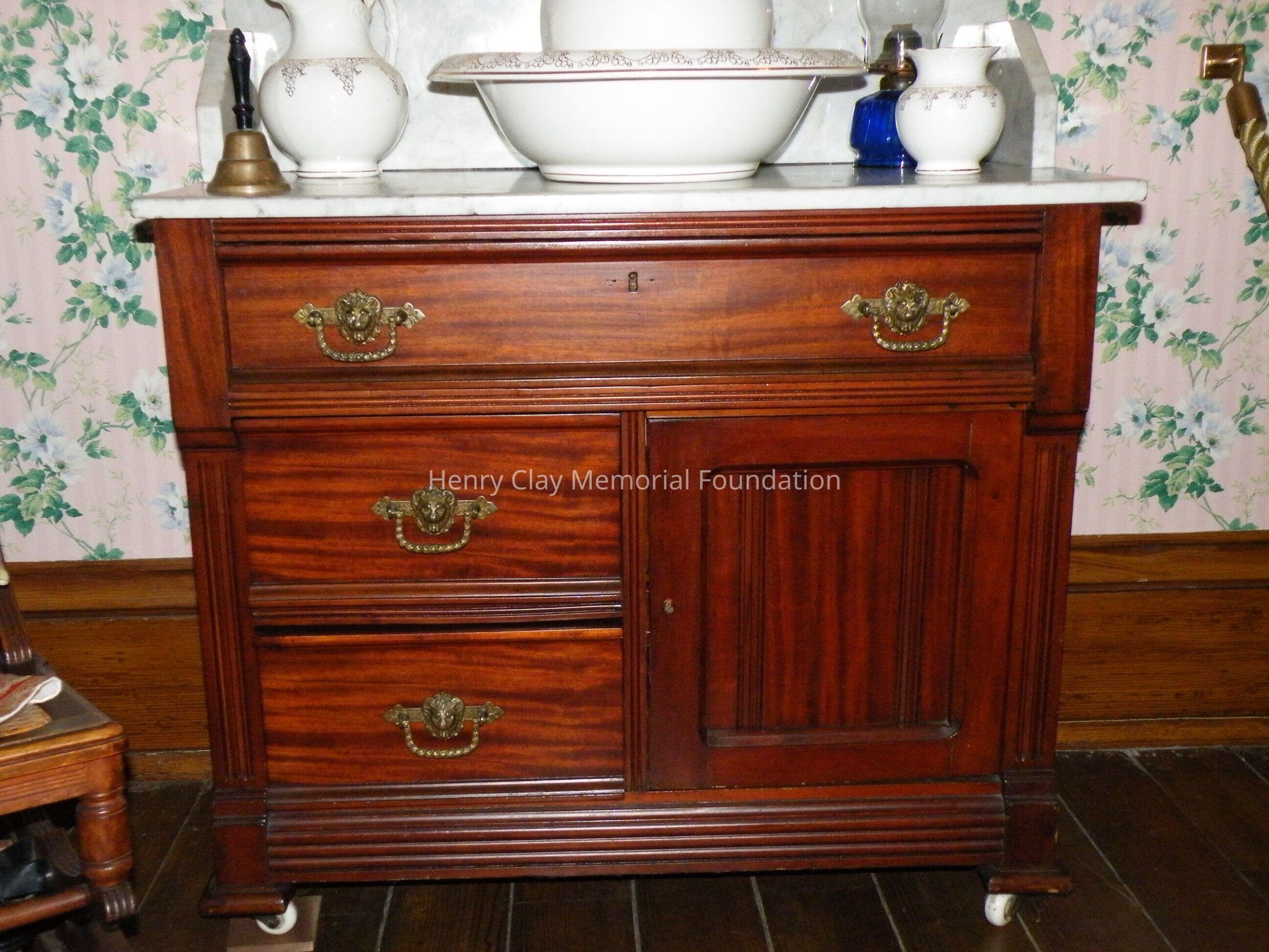 Eastlake mahogany washstand with marble top. Has three drawers with brass pulls on one side and a cabinet on the other, The pull for the cabinet door is missing. The marble top has a marble backsplash and corners. The shelves in the corners are missing.