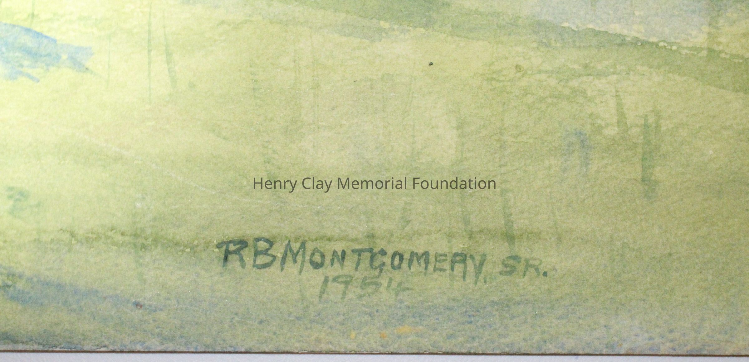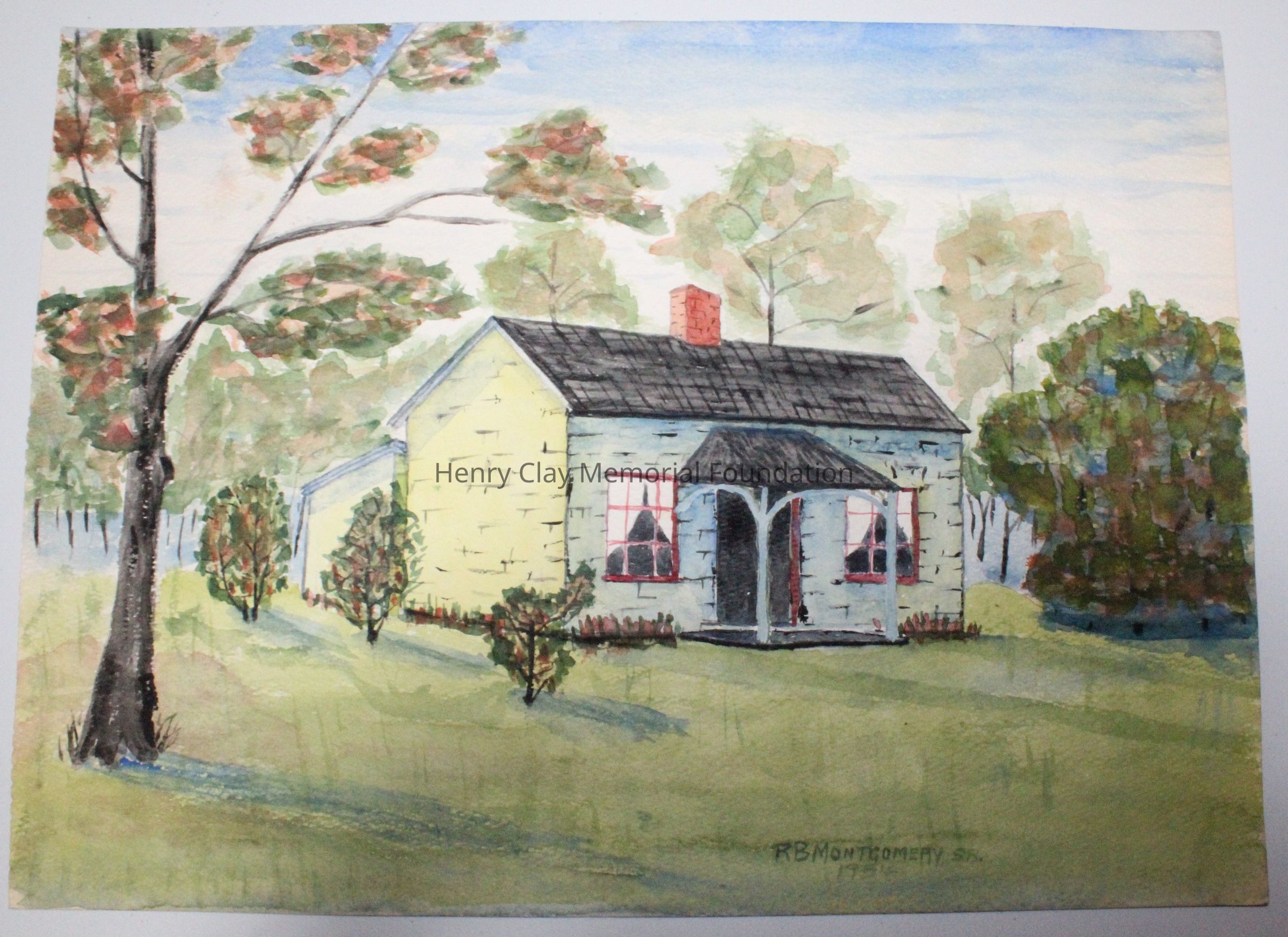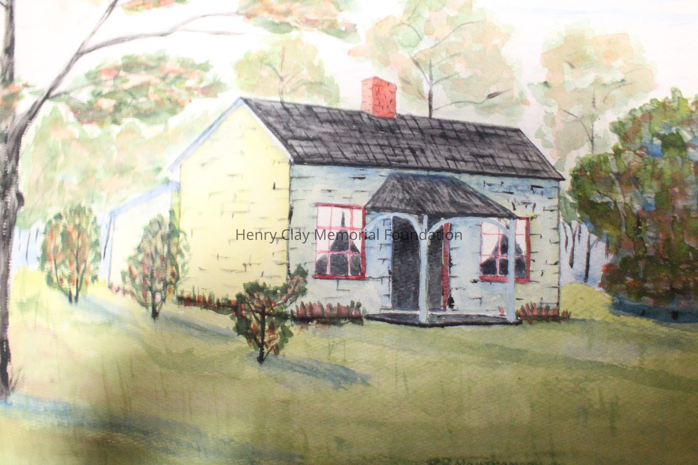 Watercolor on paper of a small house. House is brick painted white with red windows and black roof. There is a small covered porch at front center and a chimney on the roof in the center. There is a smaller structure attached to the back of the building. The building is surrounded by trees and sits on a green lawn.