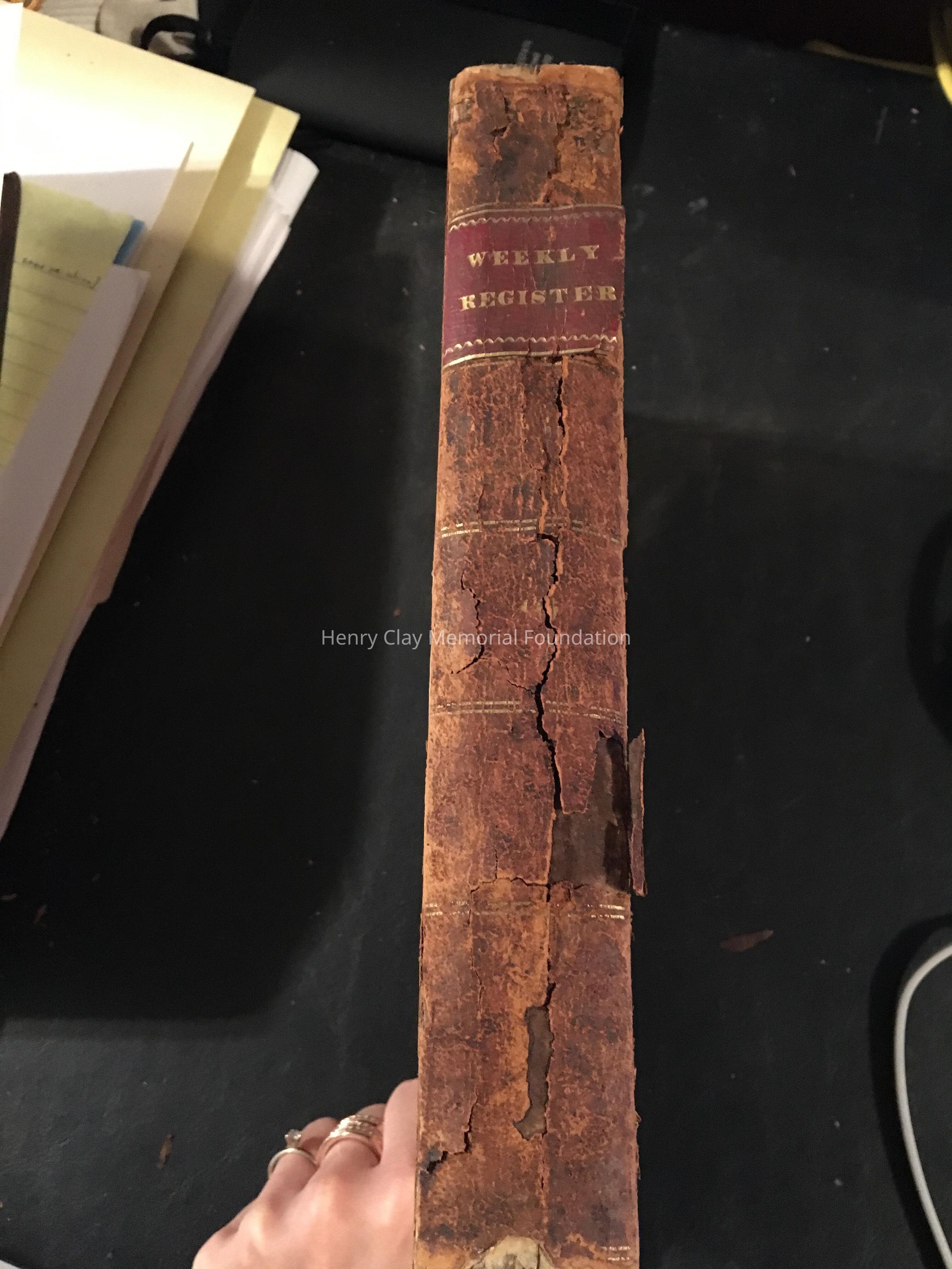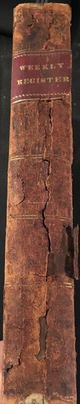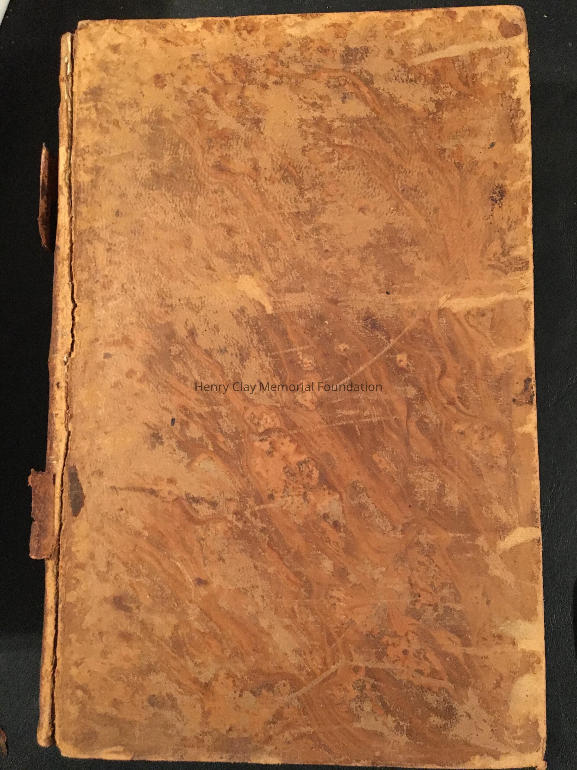 Hardcover, marbled, brown, spine is breaking.