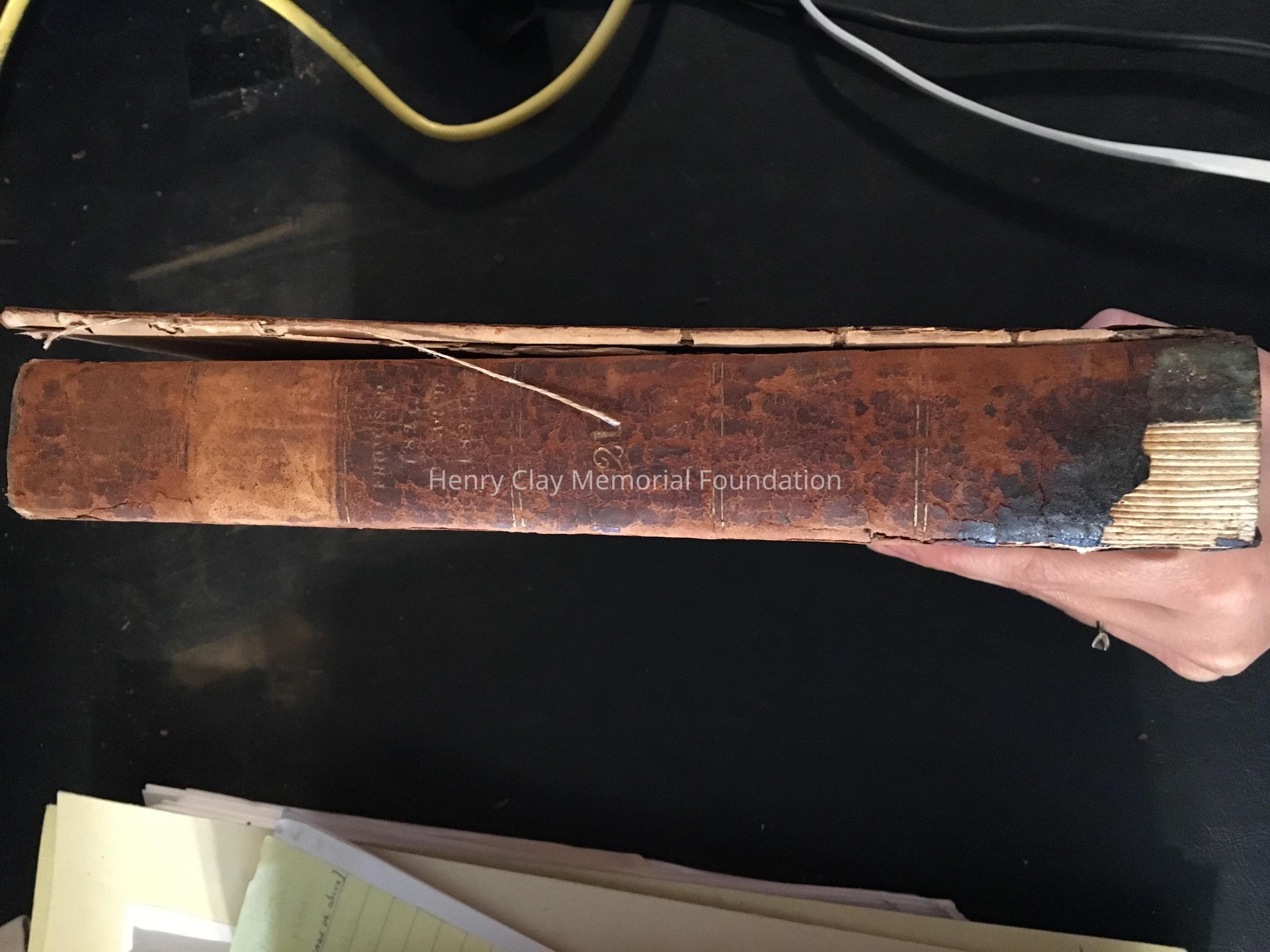 Collection of newspapers. Clay is not mentioned in the index. Leather bounded, front cover is detached, and the bottom part of the spine is missing.