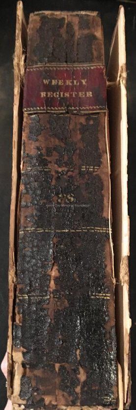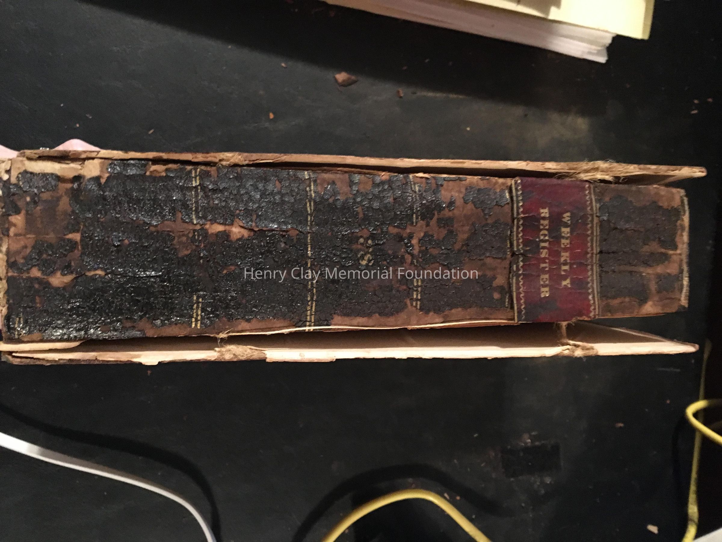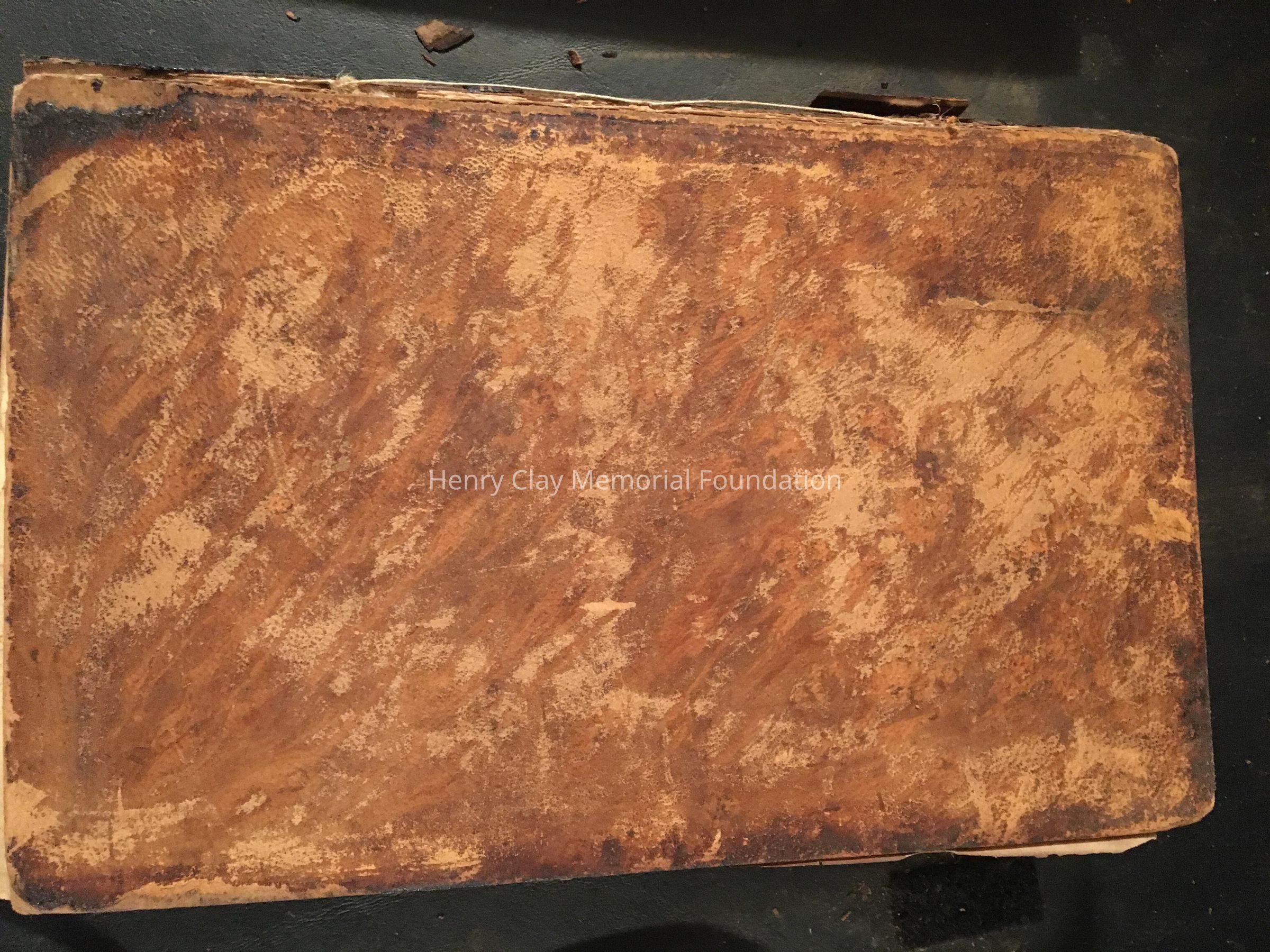 Leather cover. Spine is black, cracking, and is all shivreled up.