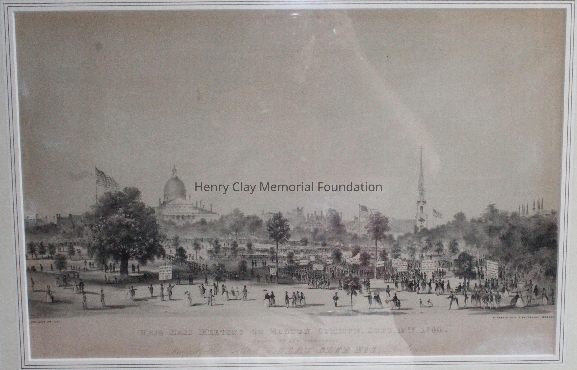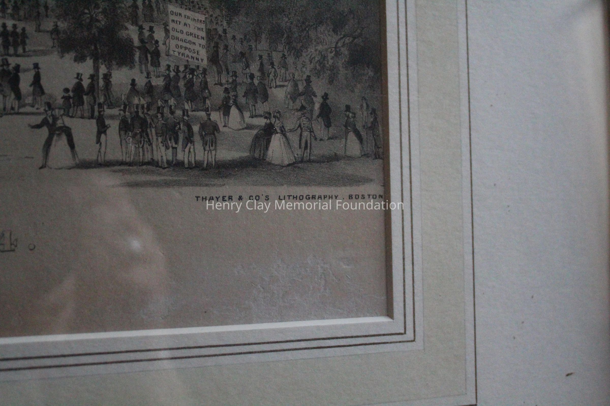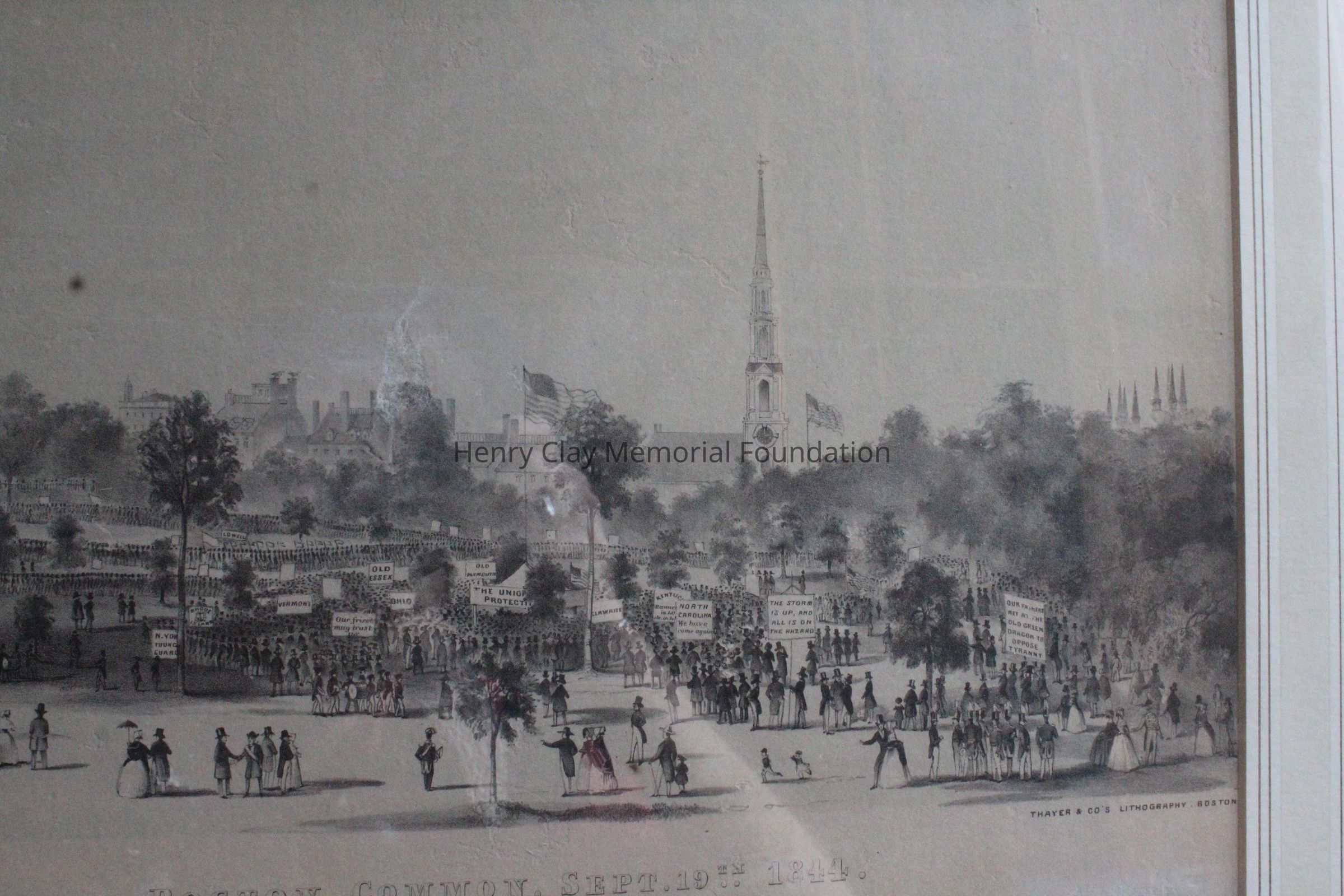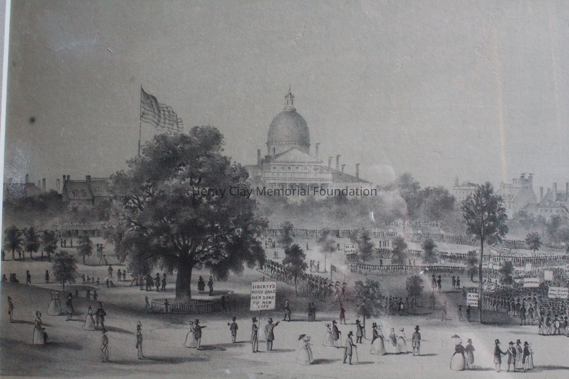 This image depicts a rally organized by the Whig Party leaders to promote Henry Clay and Theodore Frelinghuysen as President and Vice President. The Massachusetts State House and the Old North Church are in the background along with thousands of Clay supporters. It was drawn by J. Sheldon and Lithographed on Stone by Thayer & Co.'s Lithography, Boston.Dimensions