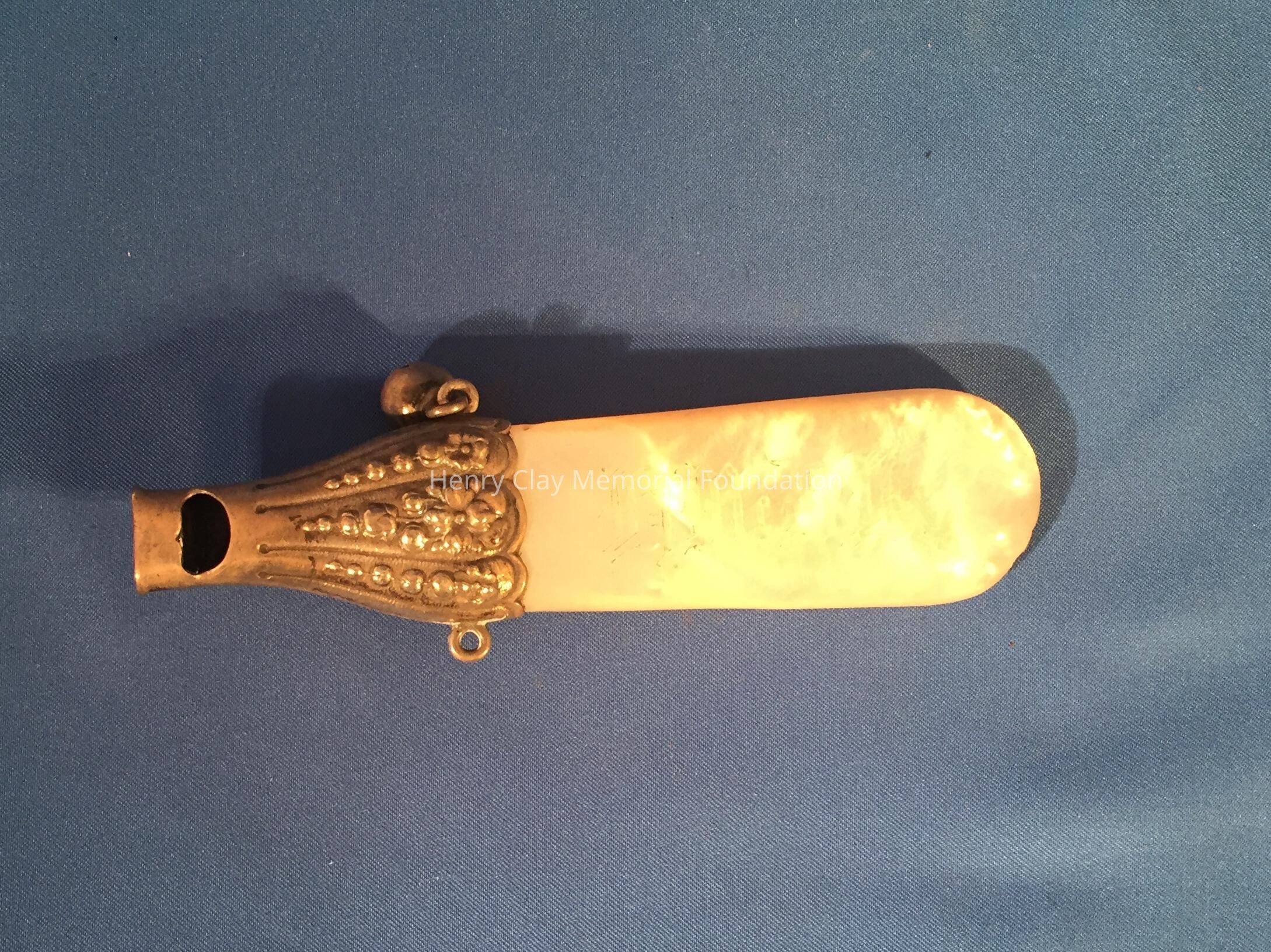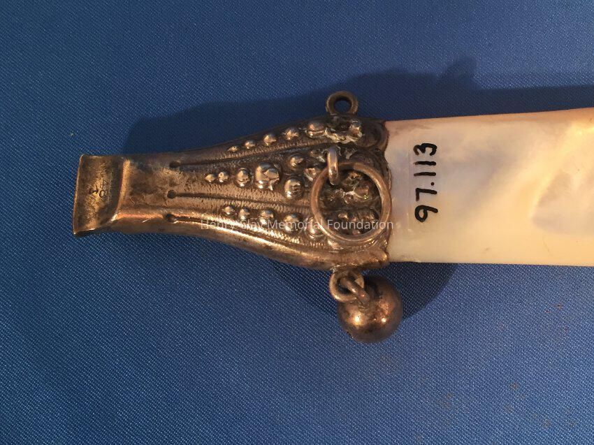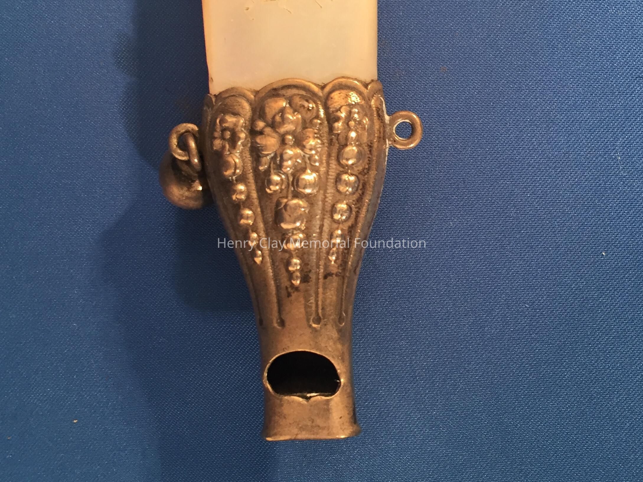 Sterling silver mouthpiece decorated with flowers and a ball hanging from side. Mother of pearl handle with carved initials "HMcDB."