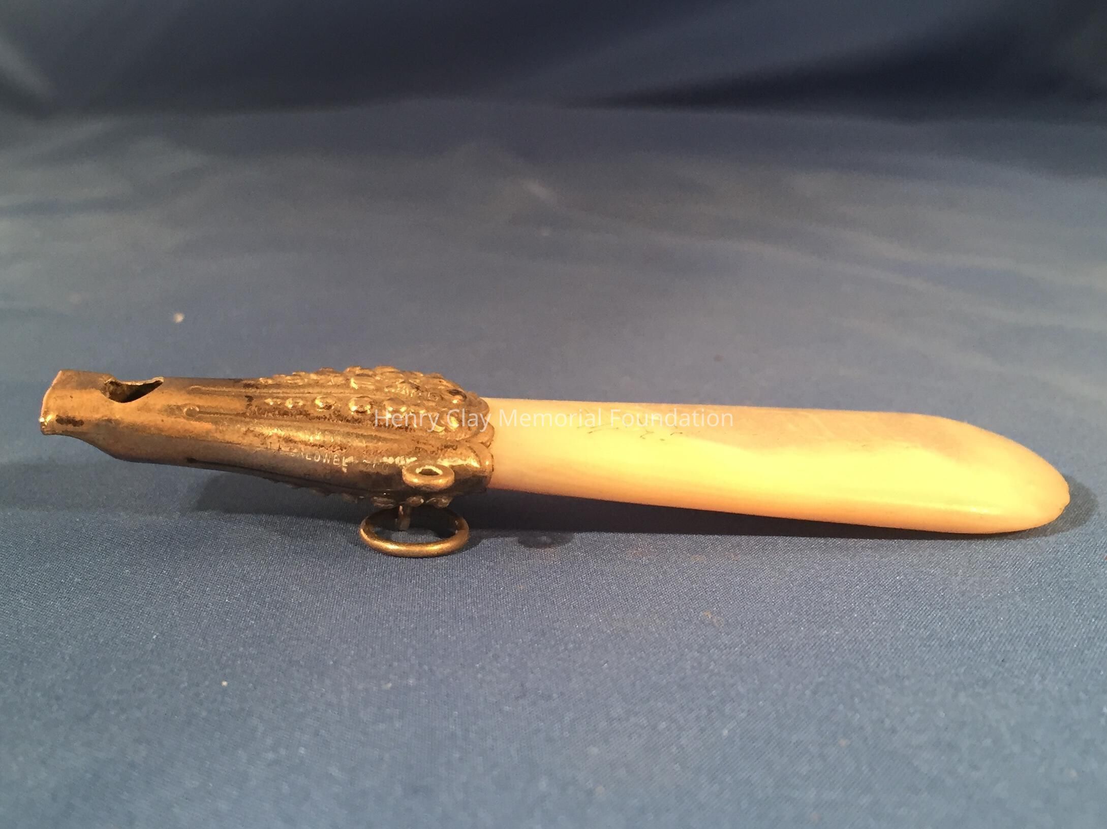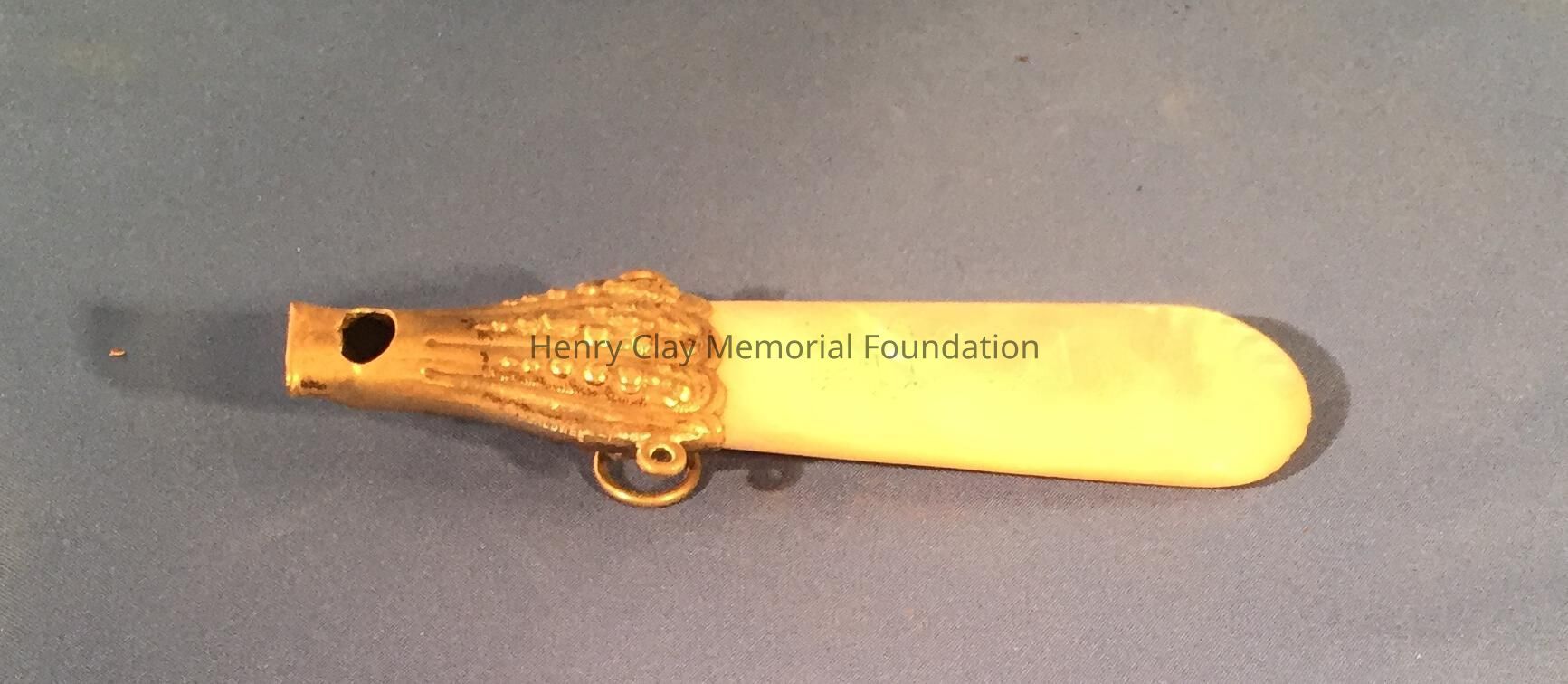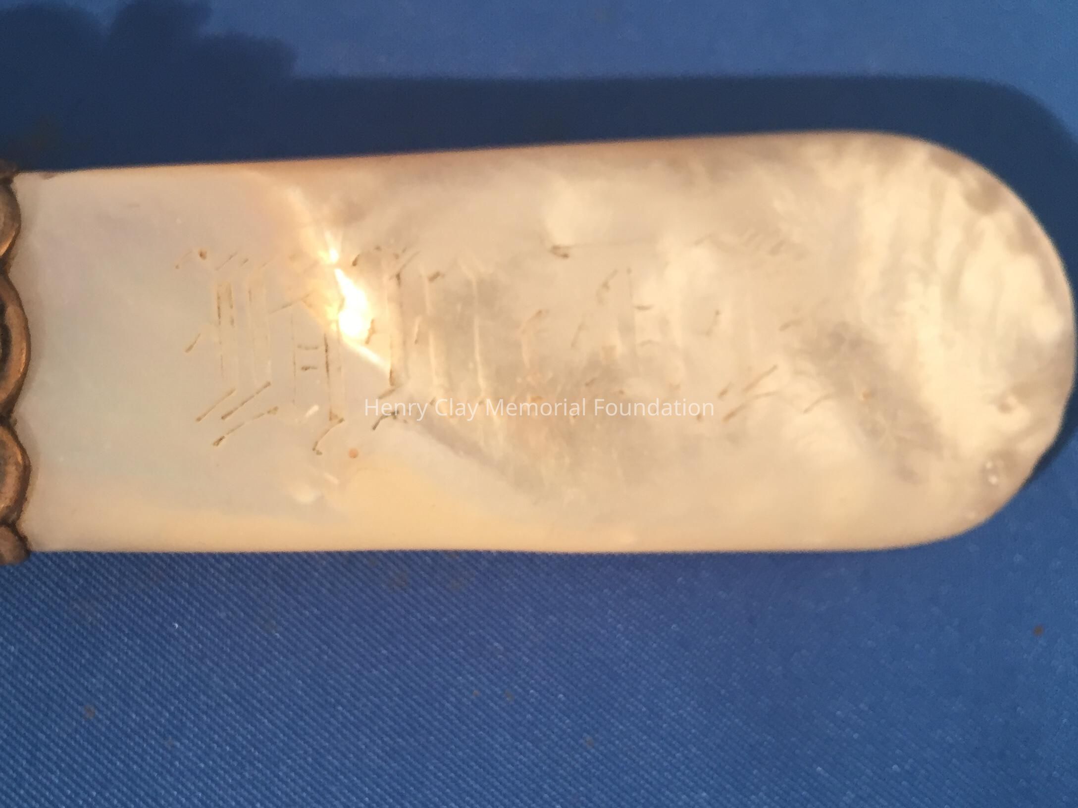 Sterling silver mouthpiece decorated with flowers and a ball hanging from side. Mother of pearl handle with carved initials "HMcDB."