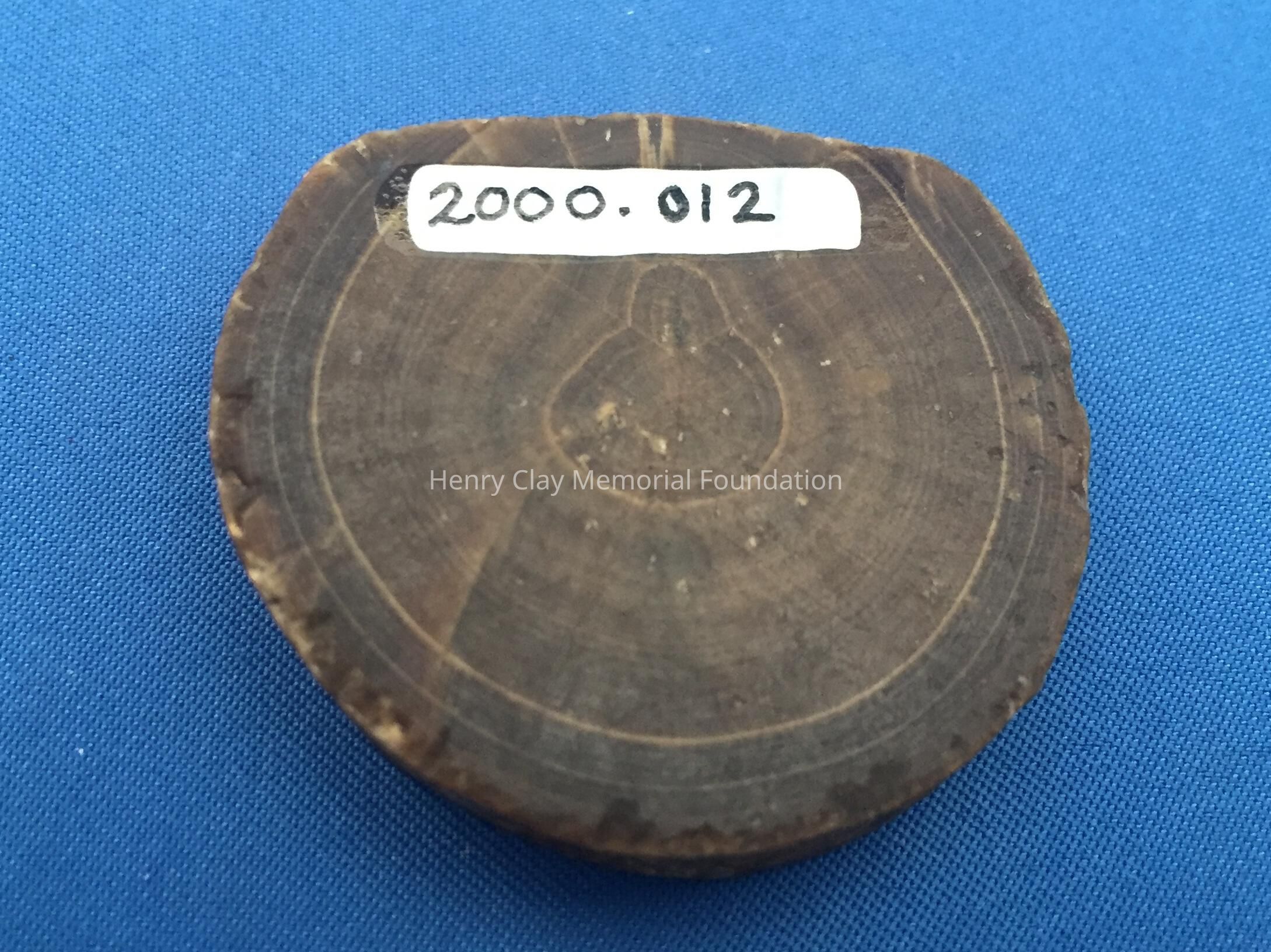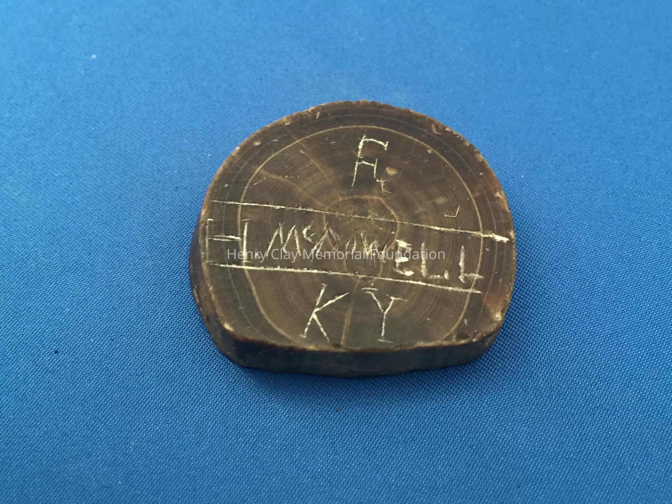 Round piece of fossilized, petrified wood with name " H. McDowell" carved across center between two incised cines. "F" carved above name and "KY" below. Piece appears to be missing from bottom.