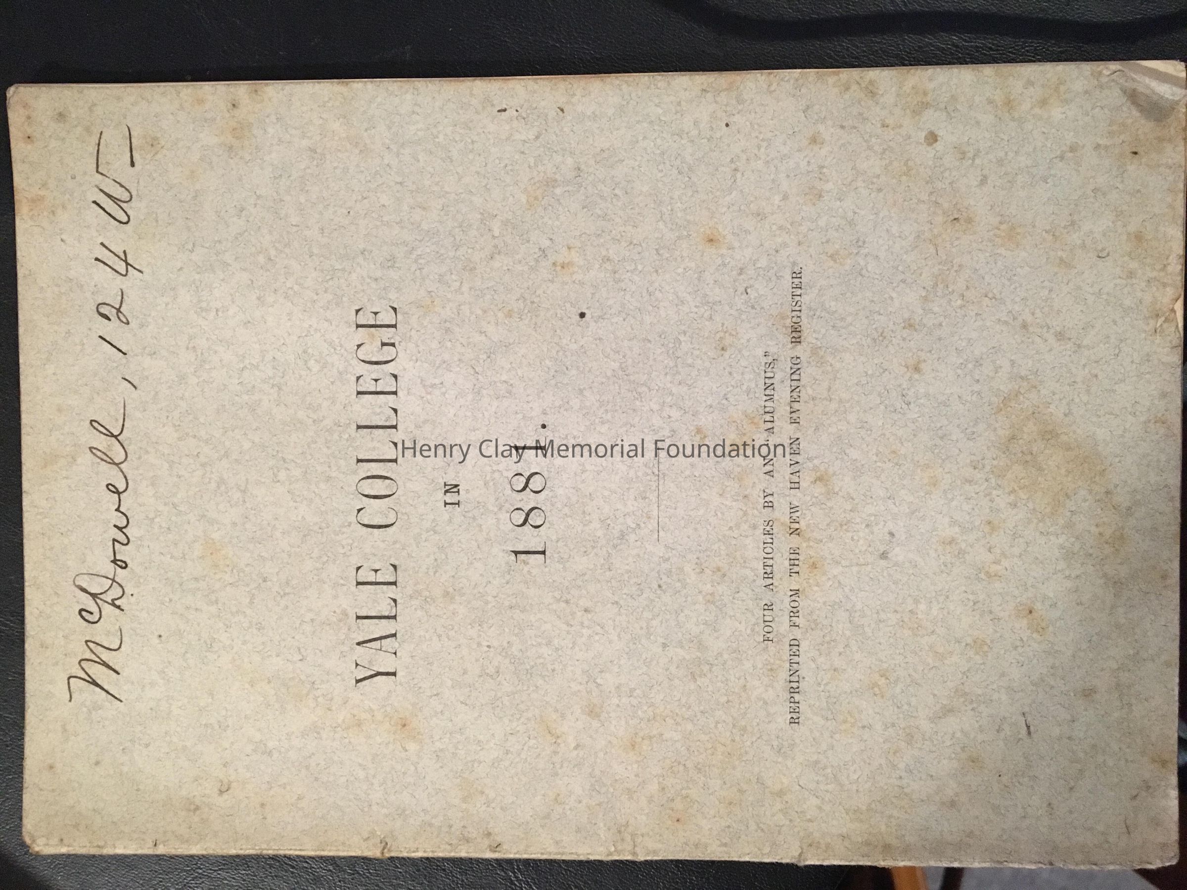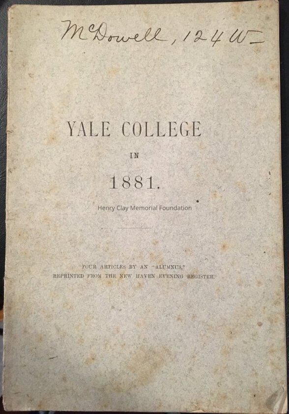 A book of Yale College from 1881, which contains four articles by an alumnus. Reprinted by the New Haven Evening Register.