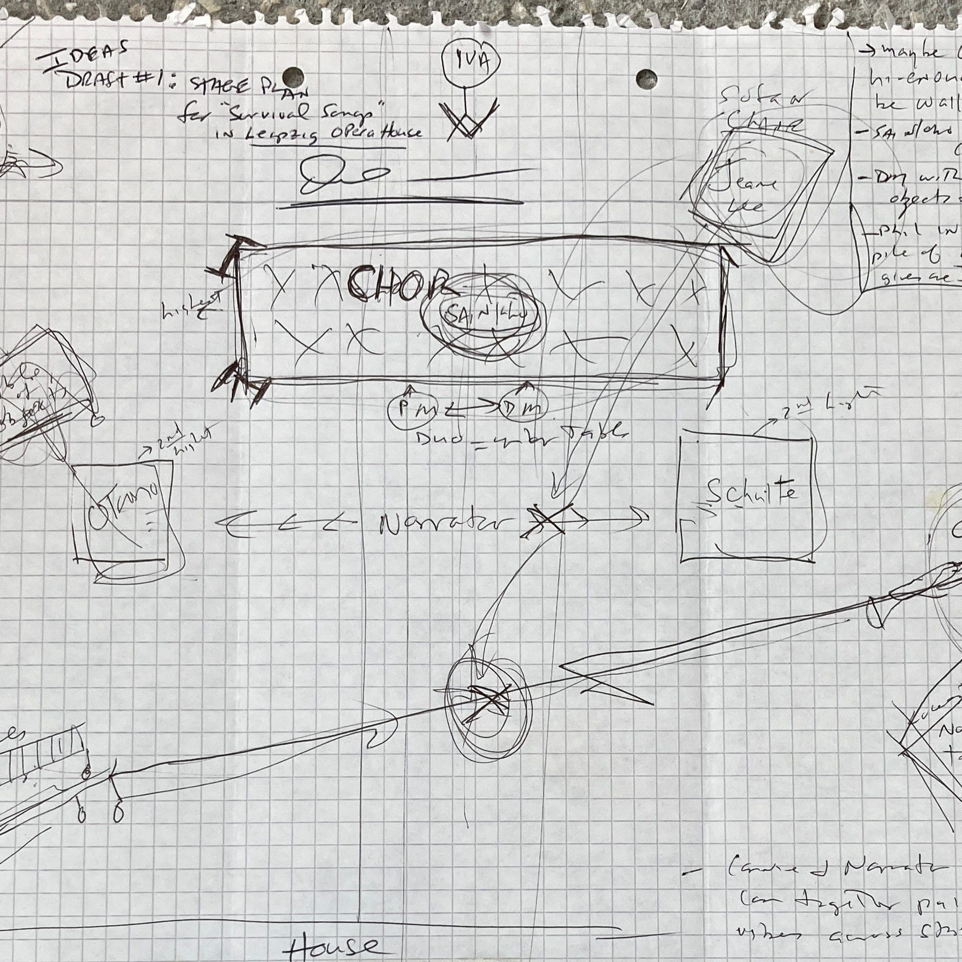 Residency # 42, Created 1996, 3/10-3/30, 1991, Composer Survival Songs, September, 1996 Autography Stage Plan from D. Moss Journal black on graph paper