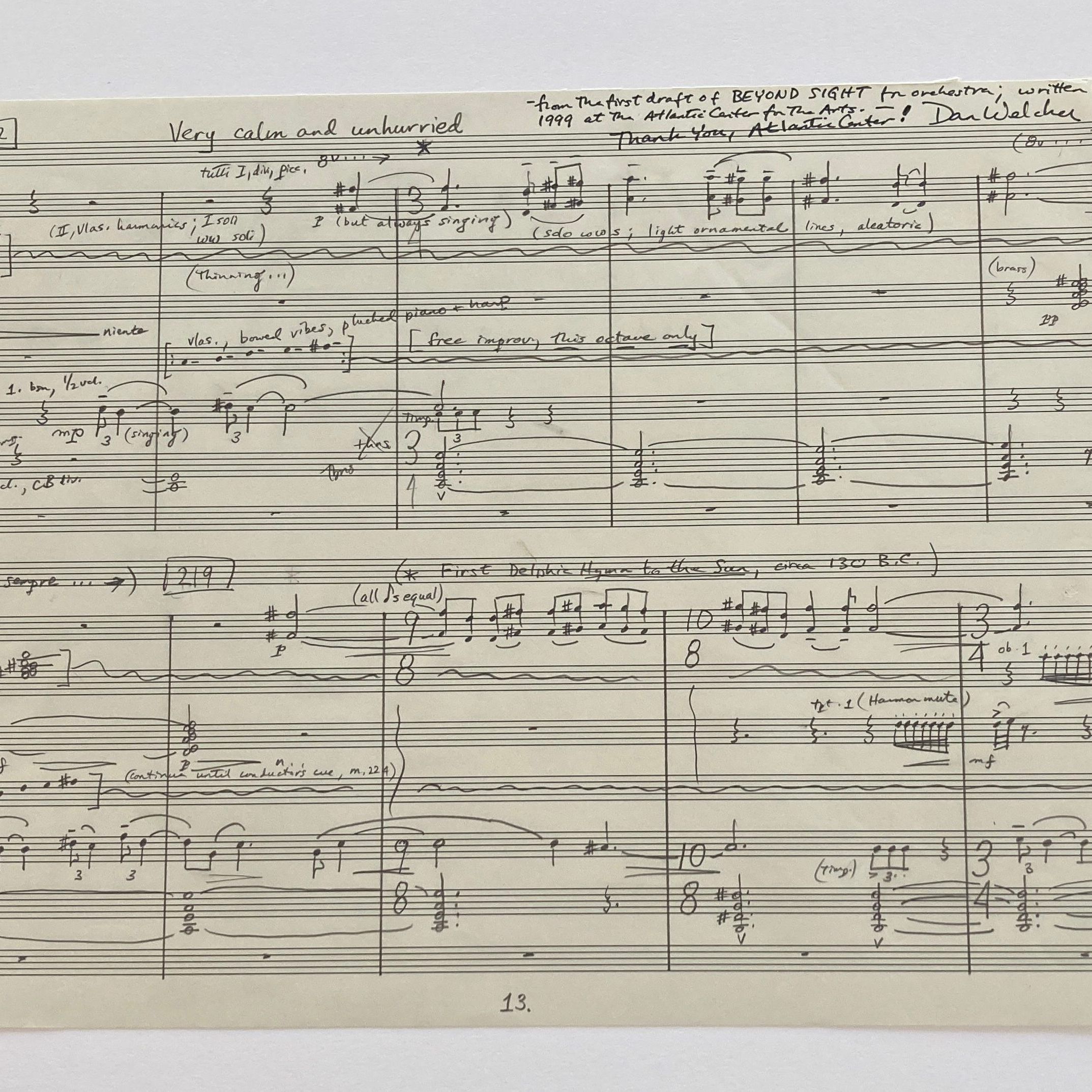 Residency #81, Created 1999 ,7/18-8/7, 1999, Composer Beyond Sight p. 13 of original draft for orchestra music score paper