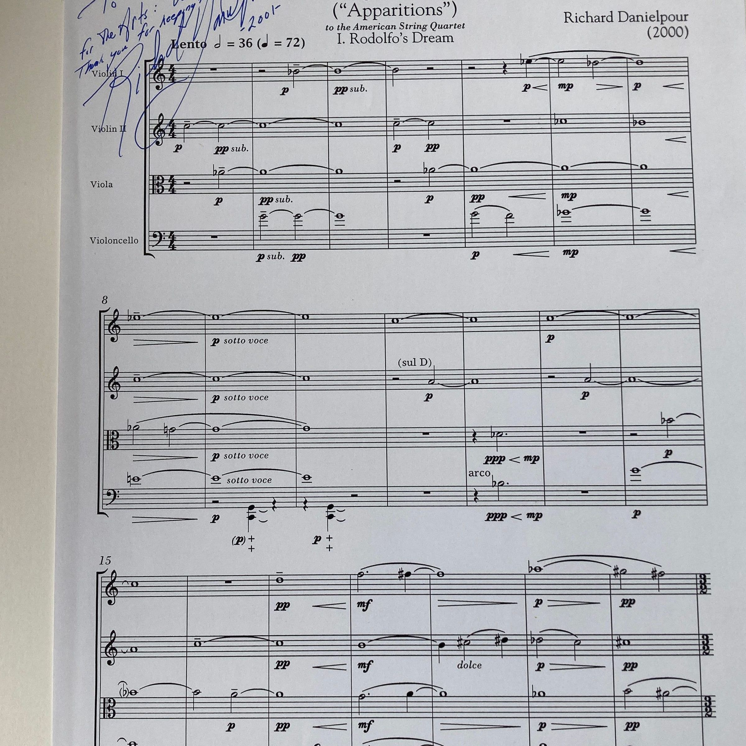 Residency # 91, Created 2000, Apr 29-May 15, 2001, Composer String Quartet # 4, (Apparitions) I. Rodofu's Dream Music score staff paperSubject Person