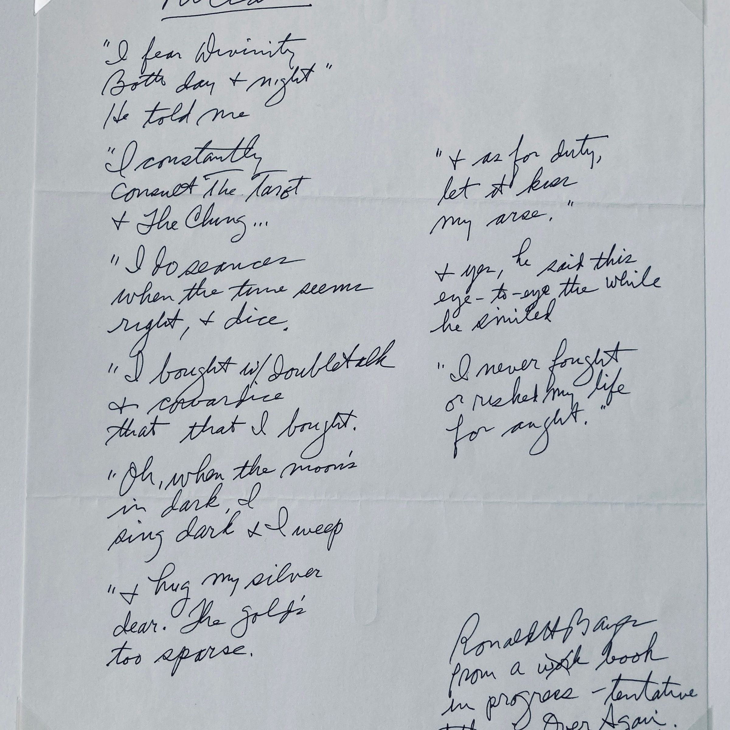 Residency# 20, Created 1996 , Feb., 8 - Feb 21, 1987, Poet Nicias poem handwritten paperSubject Person