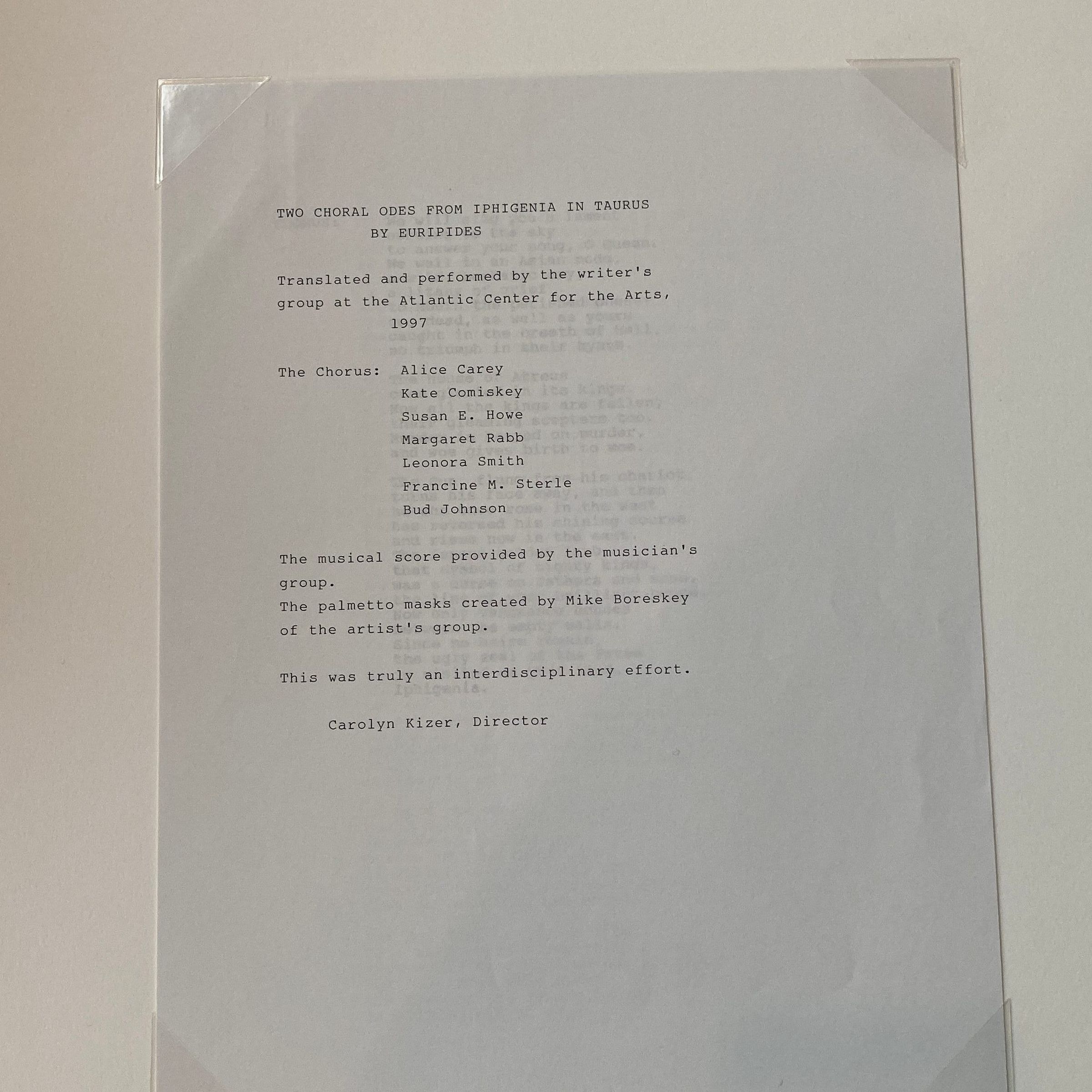 Residency # 68, Created 1997, 1/26-2/15, 1997, Poet Two Choral Odes from Iphigenia in Taurus by Euripedes music lyric 3 pages typedSubject Person