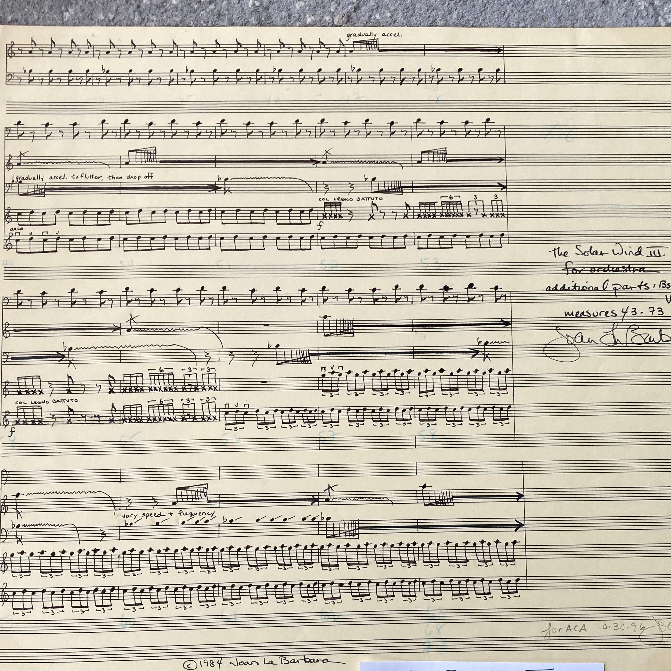 Residency # 51, Created 1984, 1/4-1/30, 1993, composer /vocalist The Solar Wind III music for orchestra original manuscript ink on lined music paper