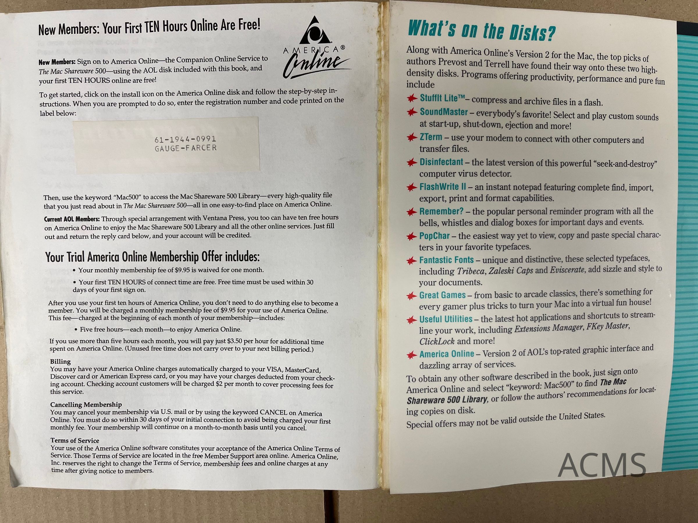 To install the Mac Shareware 500 software on these disks, insert Disk 1 into your floppy drive and double click on the "Read Me First" file for further instruction.