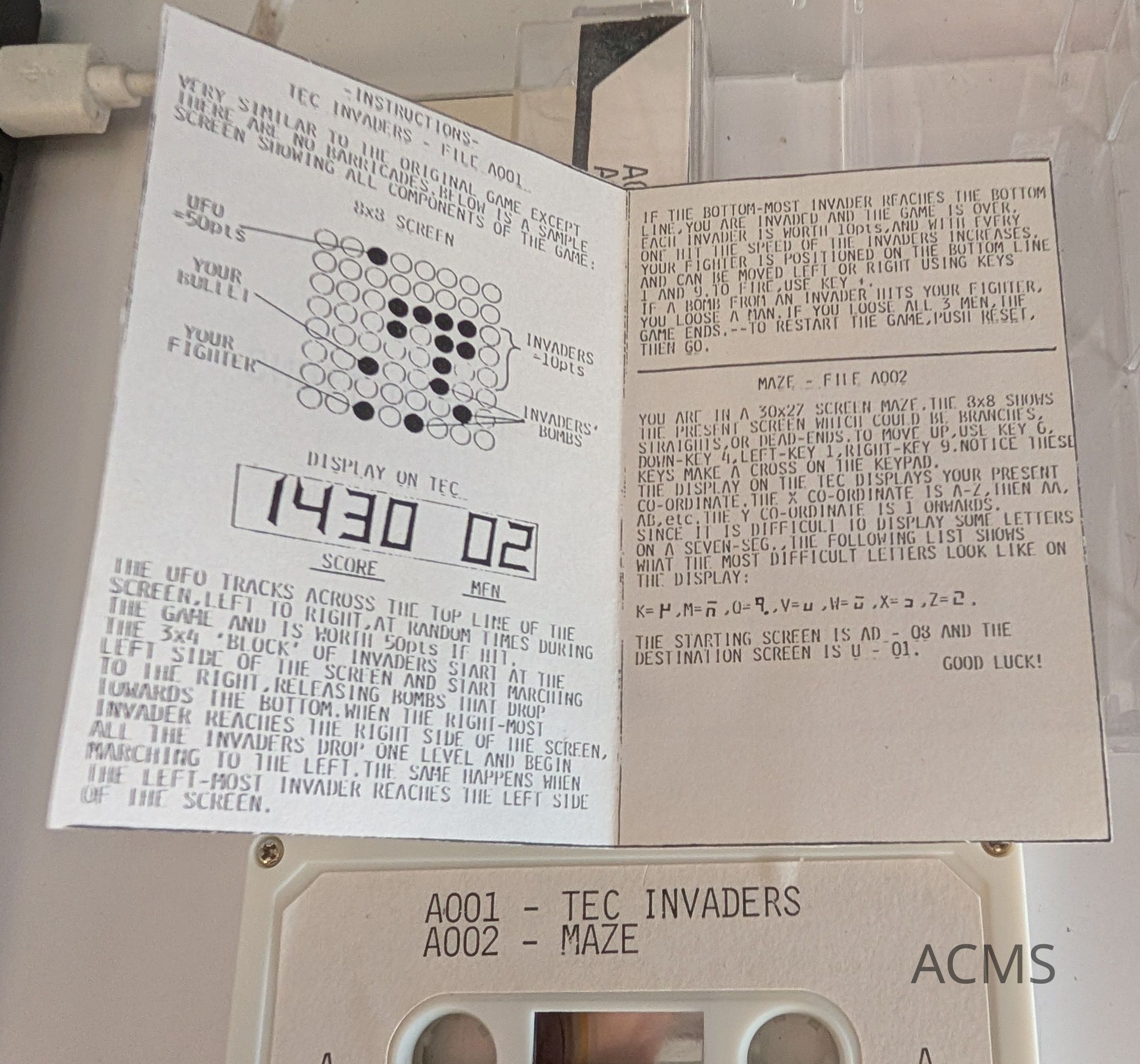 The Tape games were recently revived when Brian Chiha (Ready? Z80), working with Anders Ernest who built a working DAT board, was able to extract data from one of the original tapes. Brian then disassembled the binary data and adapted the games to work on the modern TEC-1G Computer. The audio was extracted into WAV files and along with the source code, were uploaded to the TEC-1 Software repository.Category