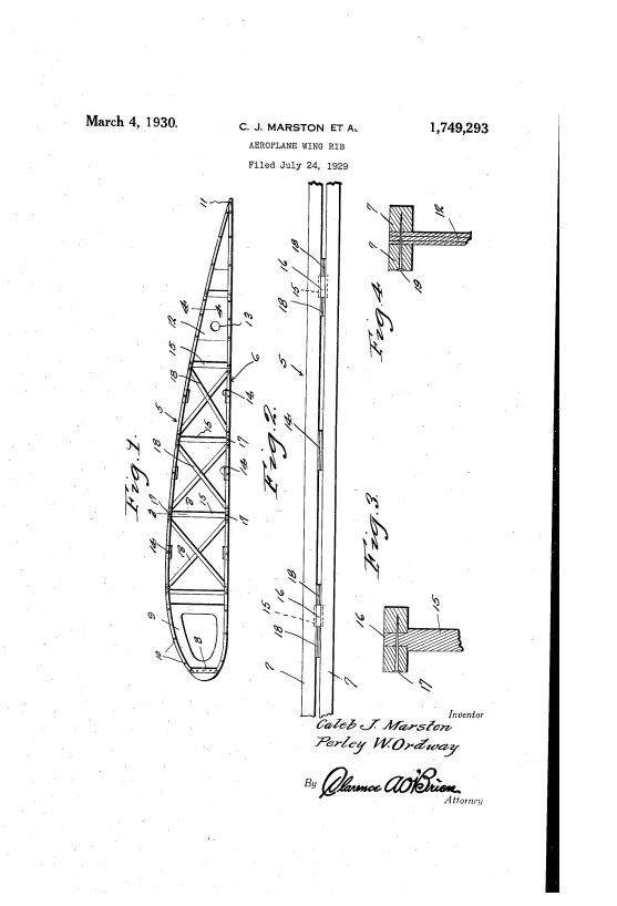 Caleb Marston and Perley Ordway's wing rib patent from the US PTO. Filed in 1929, granted in 1930. This rib design was used in the construction of the Doodlebug bi-plane on display in the Aviation Museum of NH.Context
