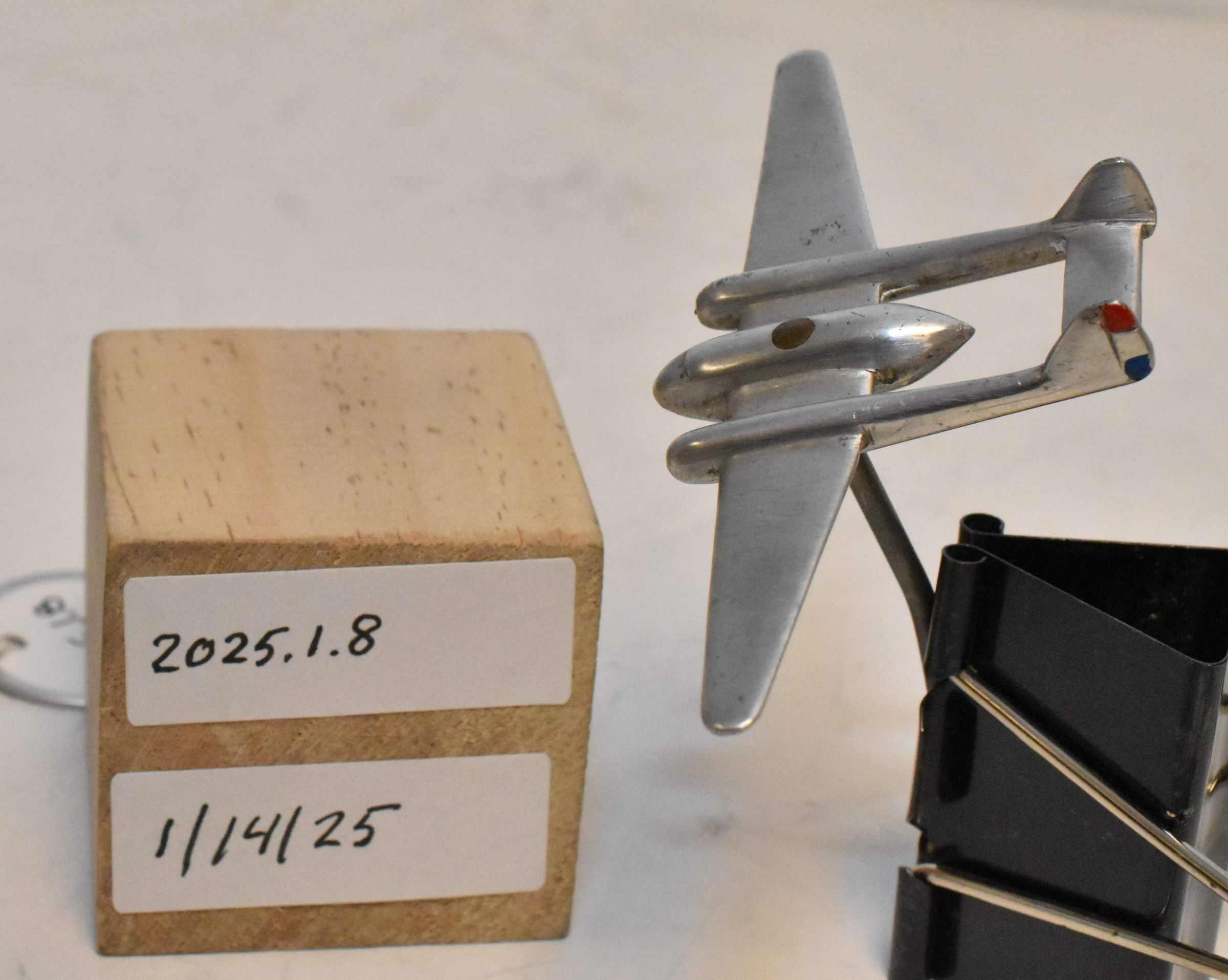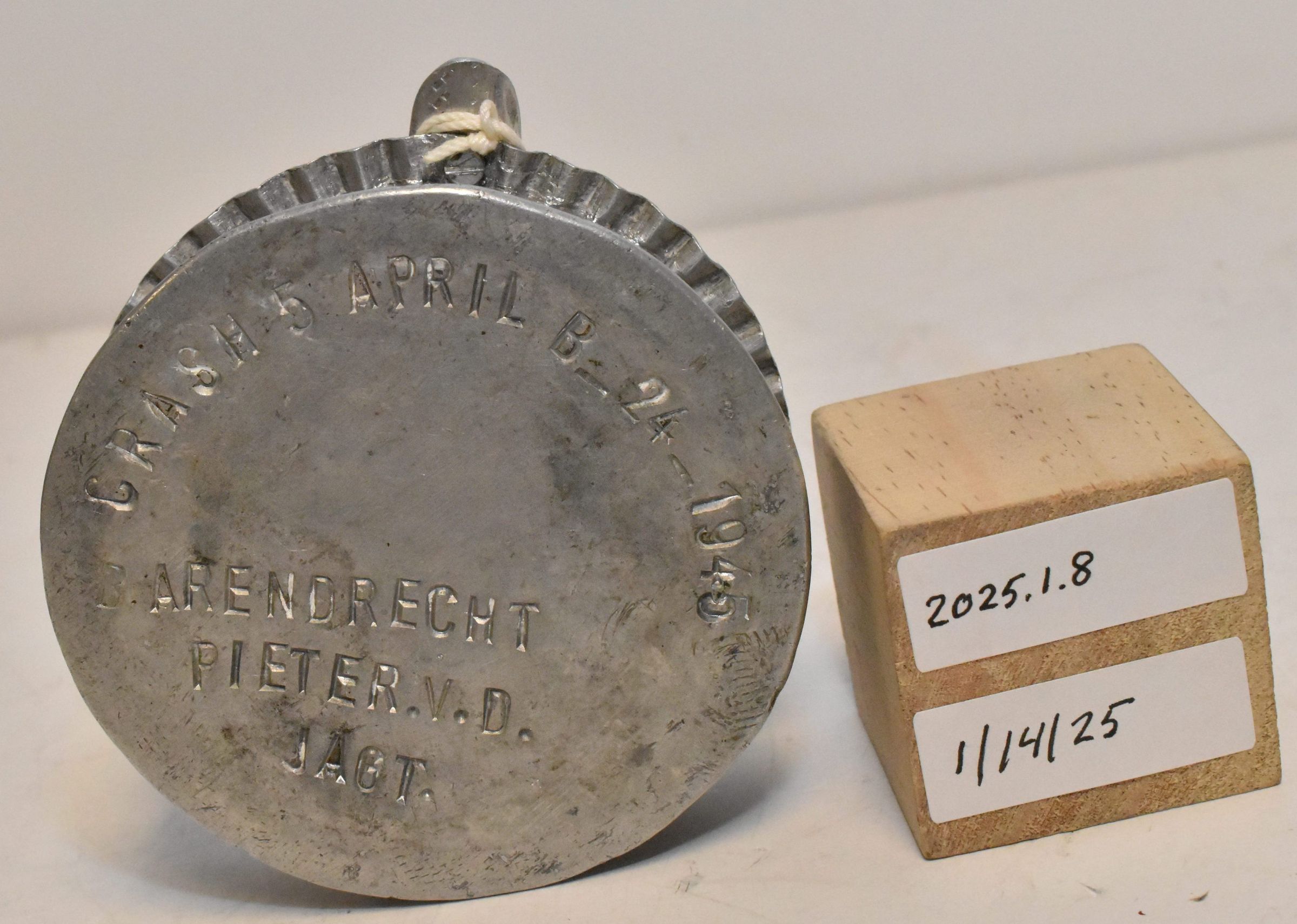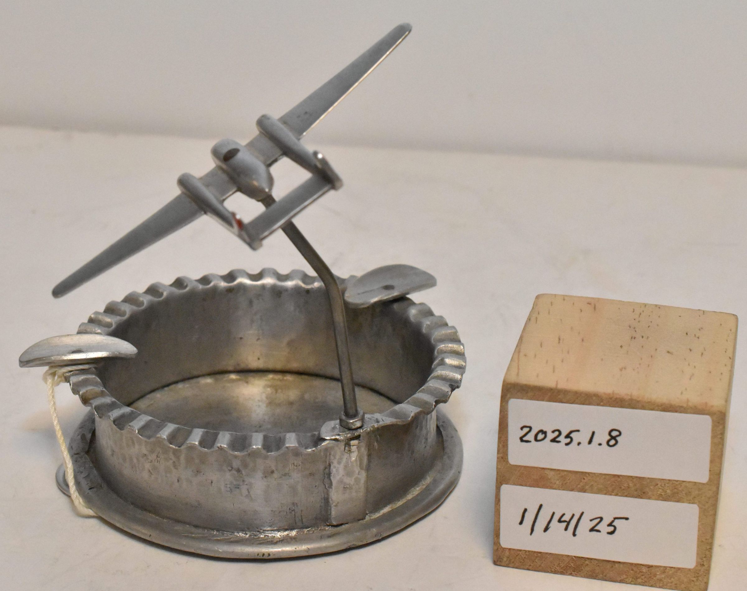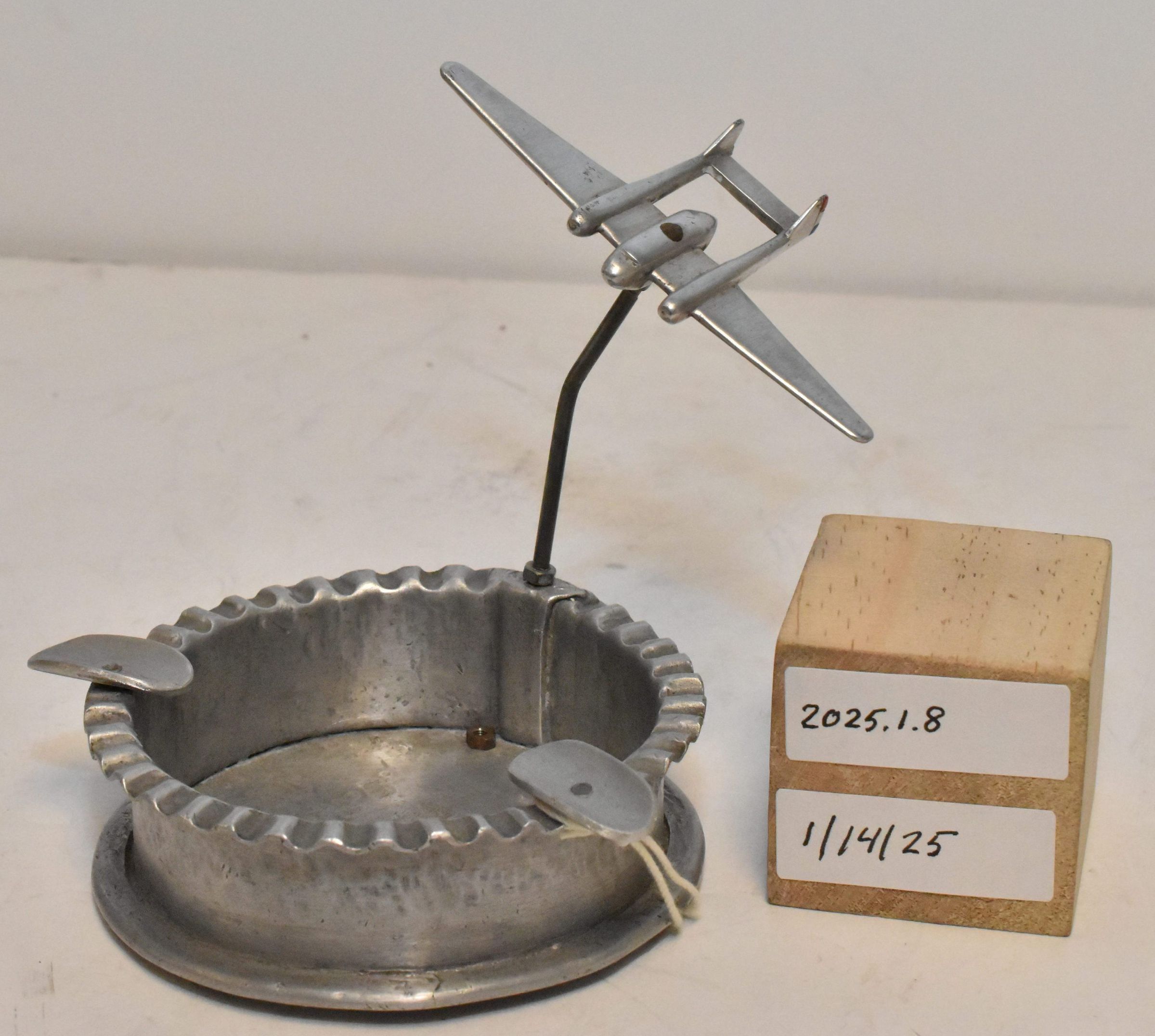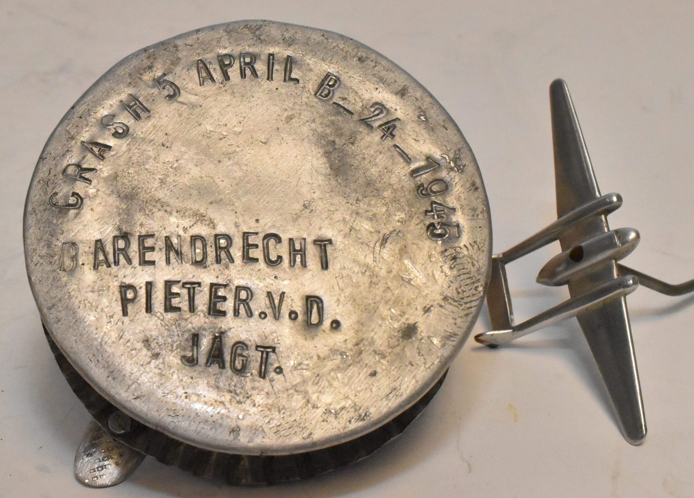 Edward E Beebe Collection - aluminum w/ small aircraft on thin pylon. Made by a citizen of Barendrecht, Netherlands from the wreckage of B-24 "Pinup Girl". Aircraft mounting is fragile. Bottom of item is stamp marked: "Crash 5 April B_24_1945 Barendrecht Pieter V.D. Jagt."Acquisition