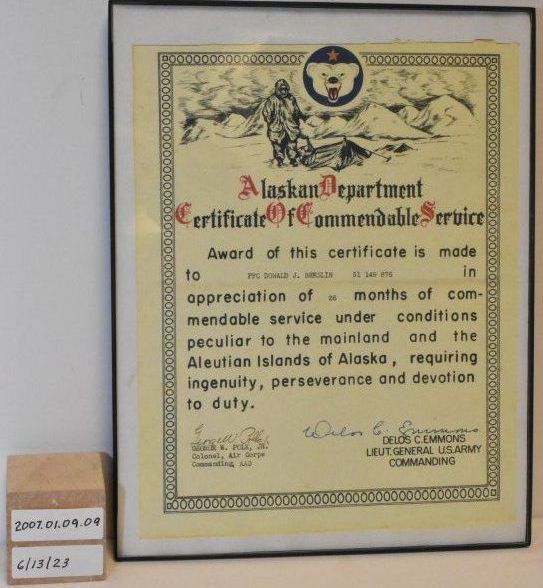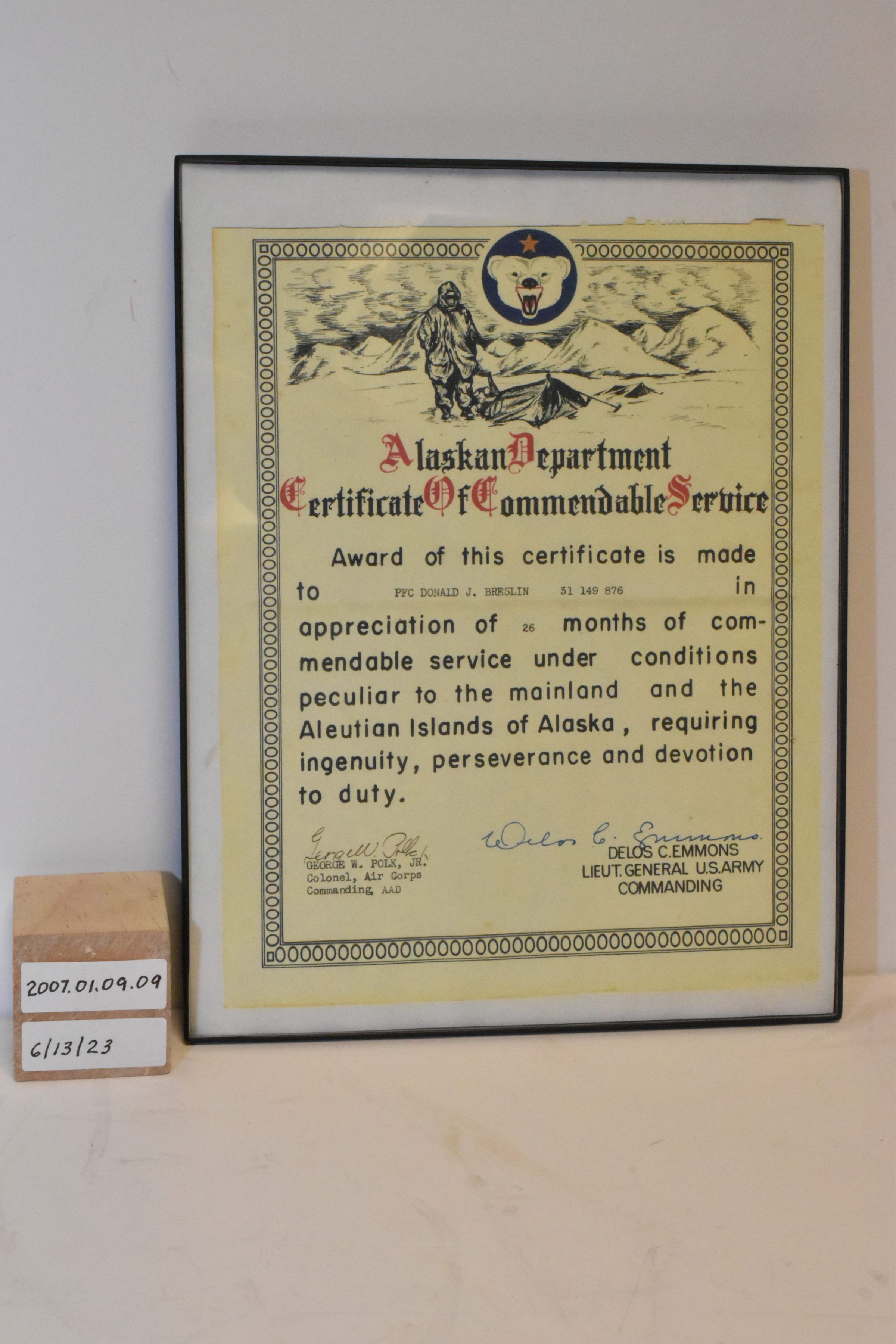Army Air Corps Certificate for Commendable Service to PFC Donald J BreslinAcquisition