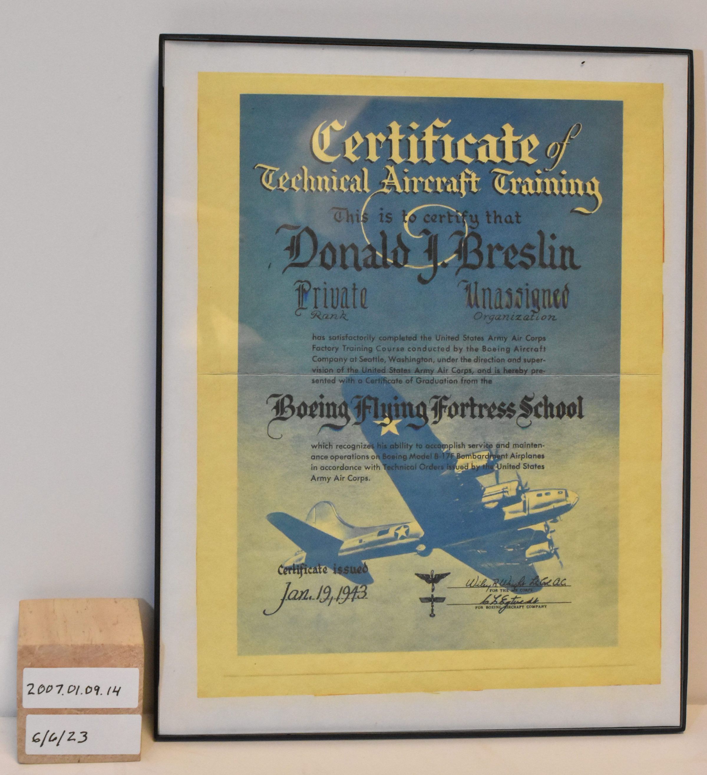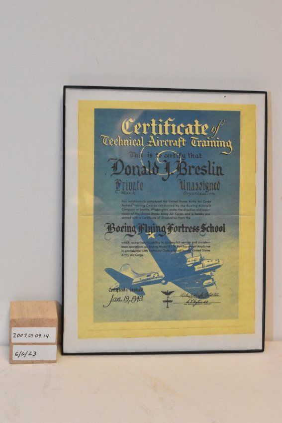 USAAC Certificate of Technical Aircraft Training at Boeing Flying Fortress School - To Donald J Breslin Jan 19, 1943 - Graphic is a B-17FAcquisition
