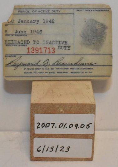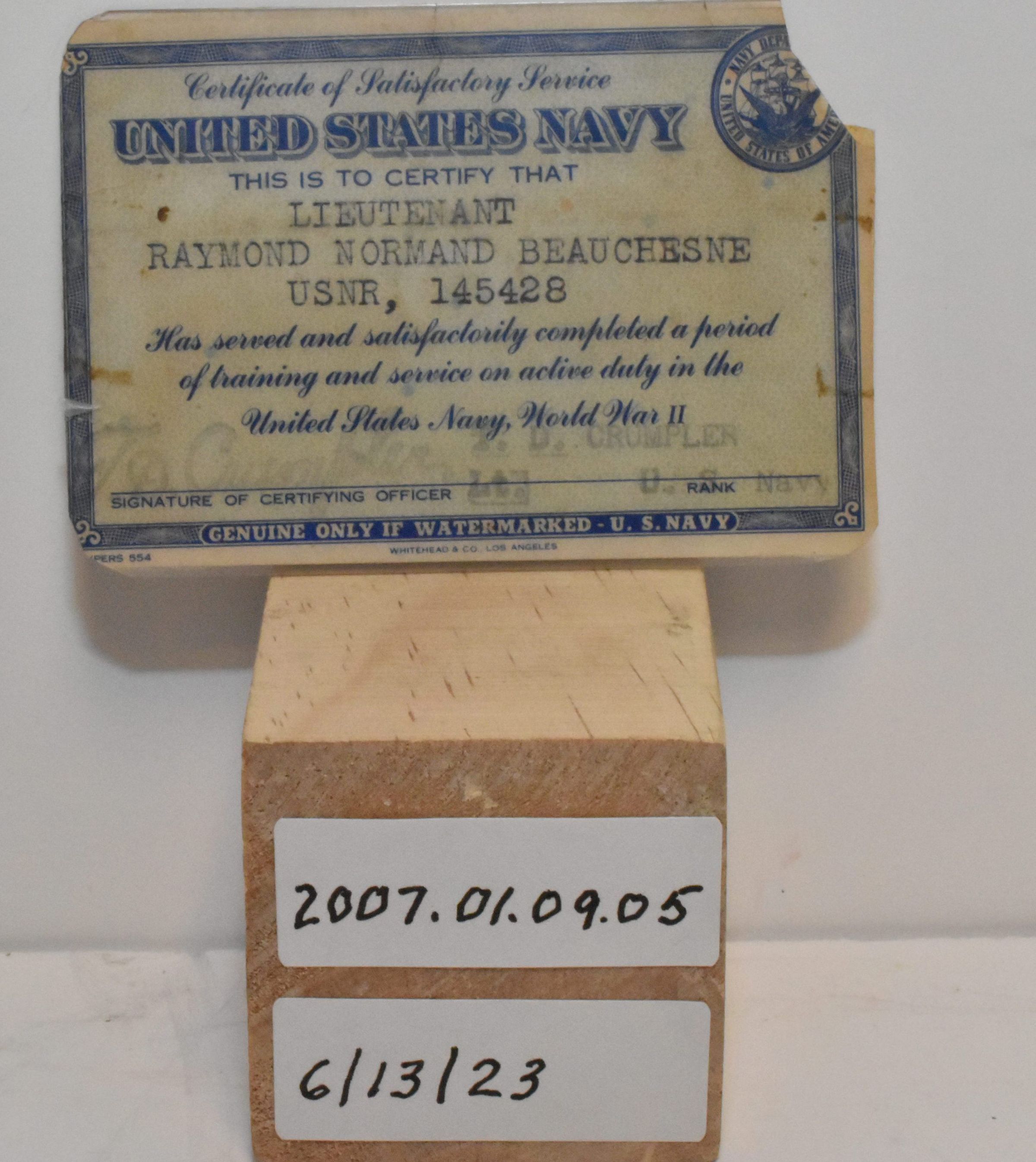 US Navy certificate of satisfactory service to Lt. Raymond N BeauchesneAcquisition