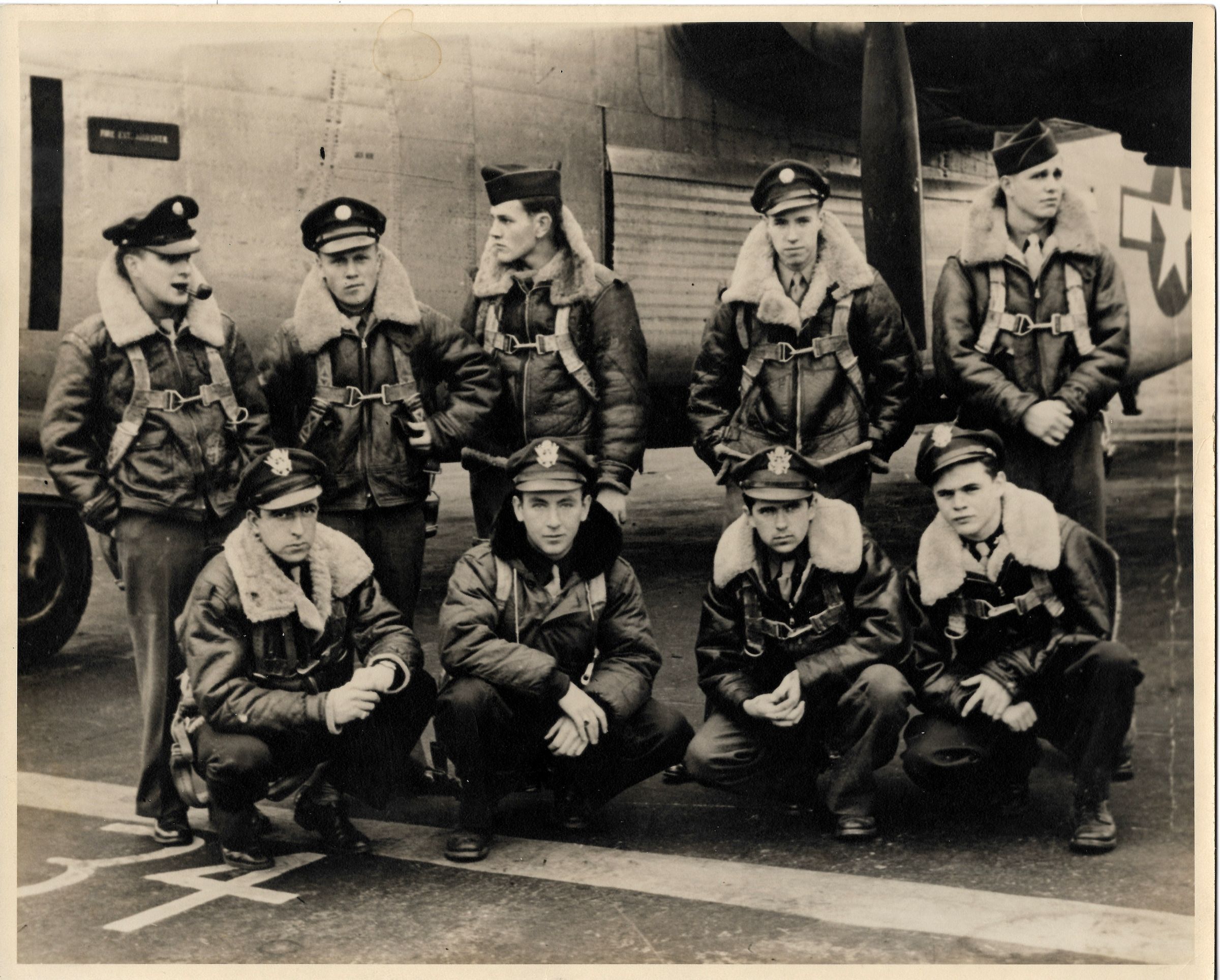 Taken prior to the 5 April 1945 crash in Barendrecht, Netherlands. F/O Edward Beebe is in the front row, far left.Acquisition