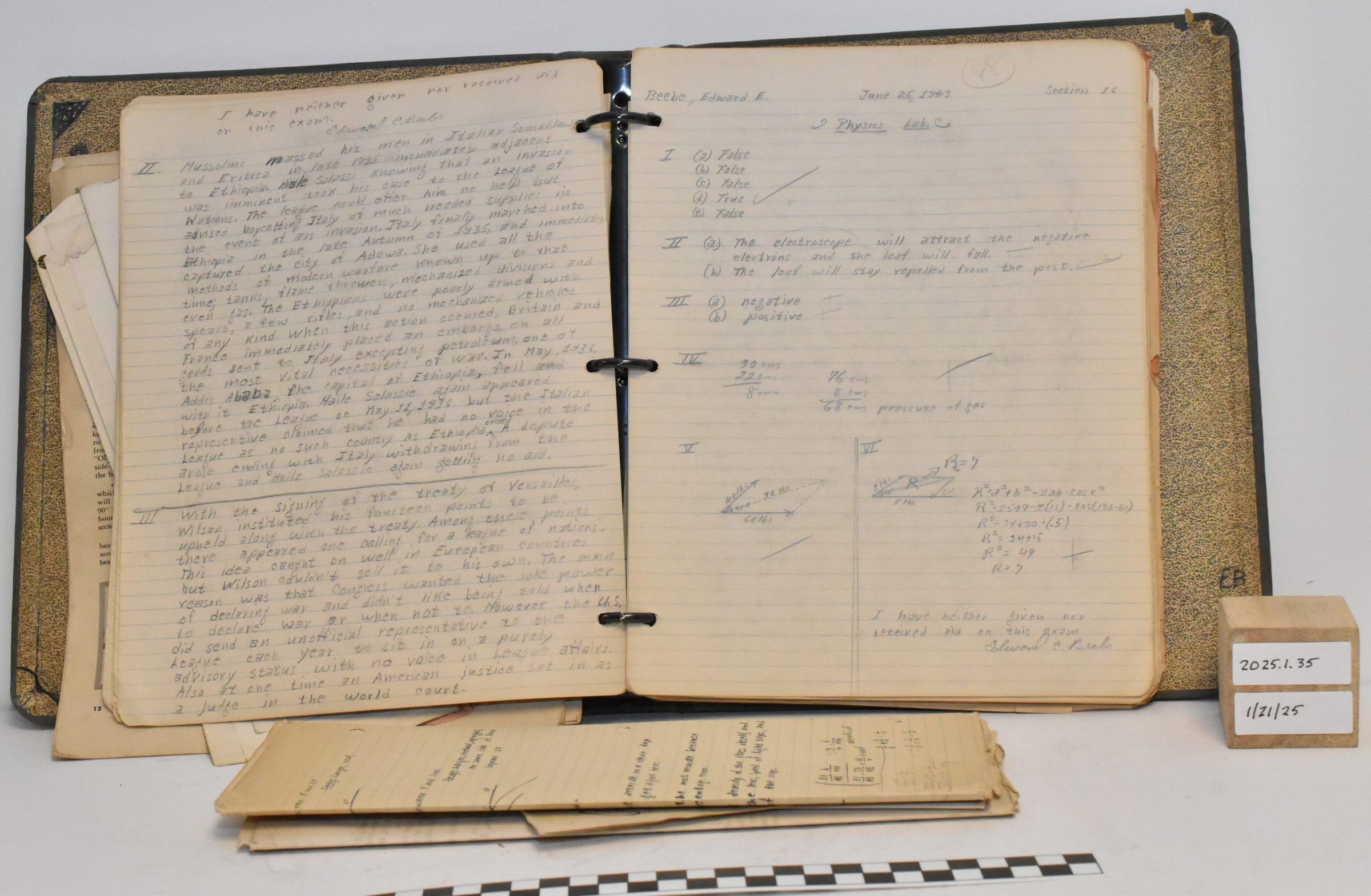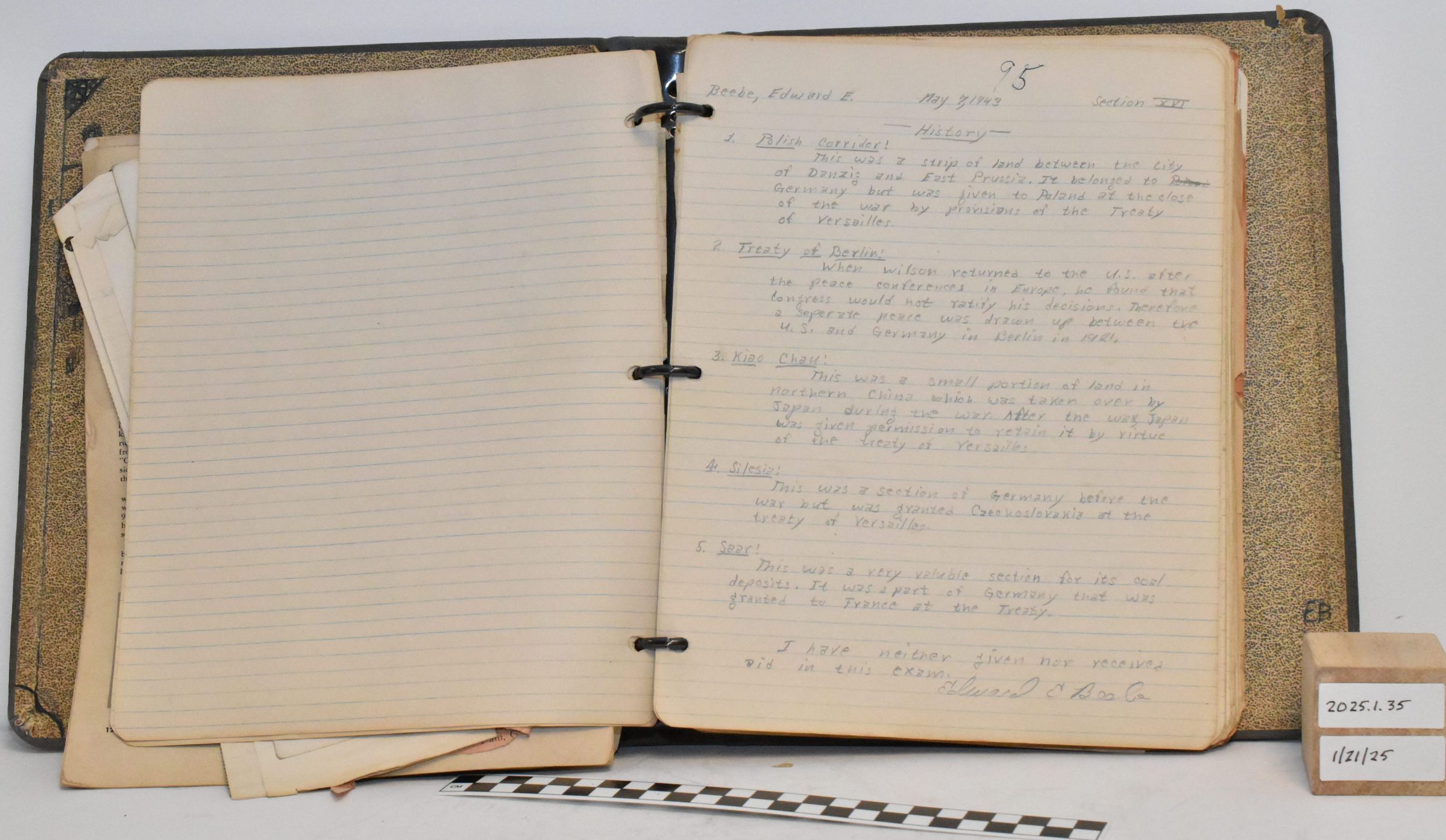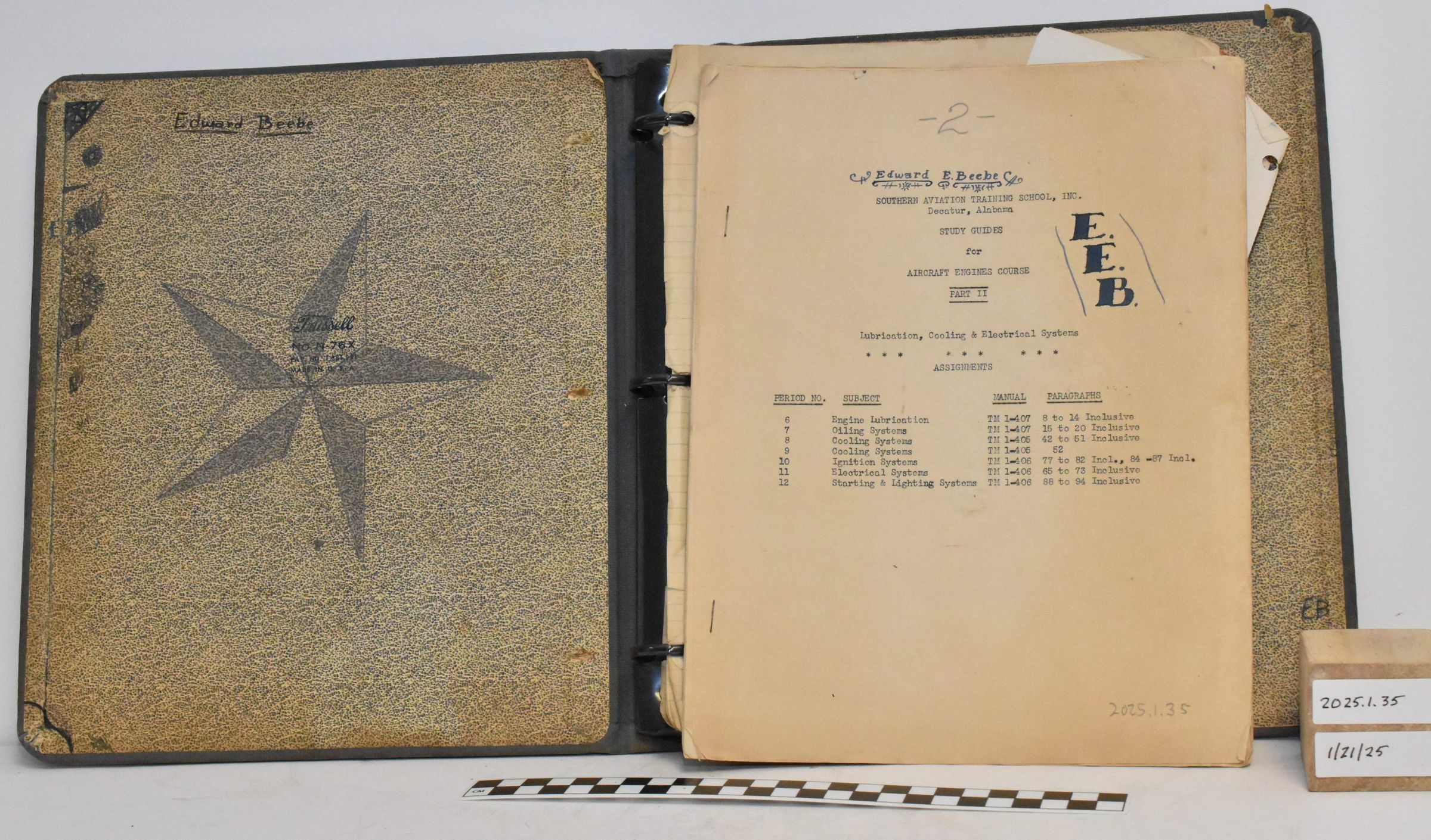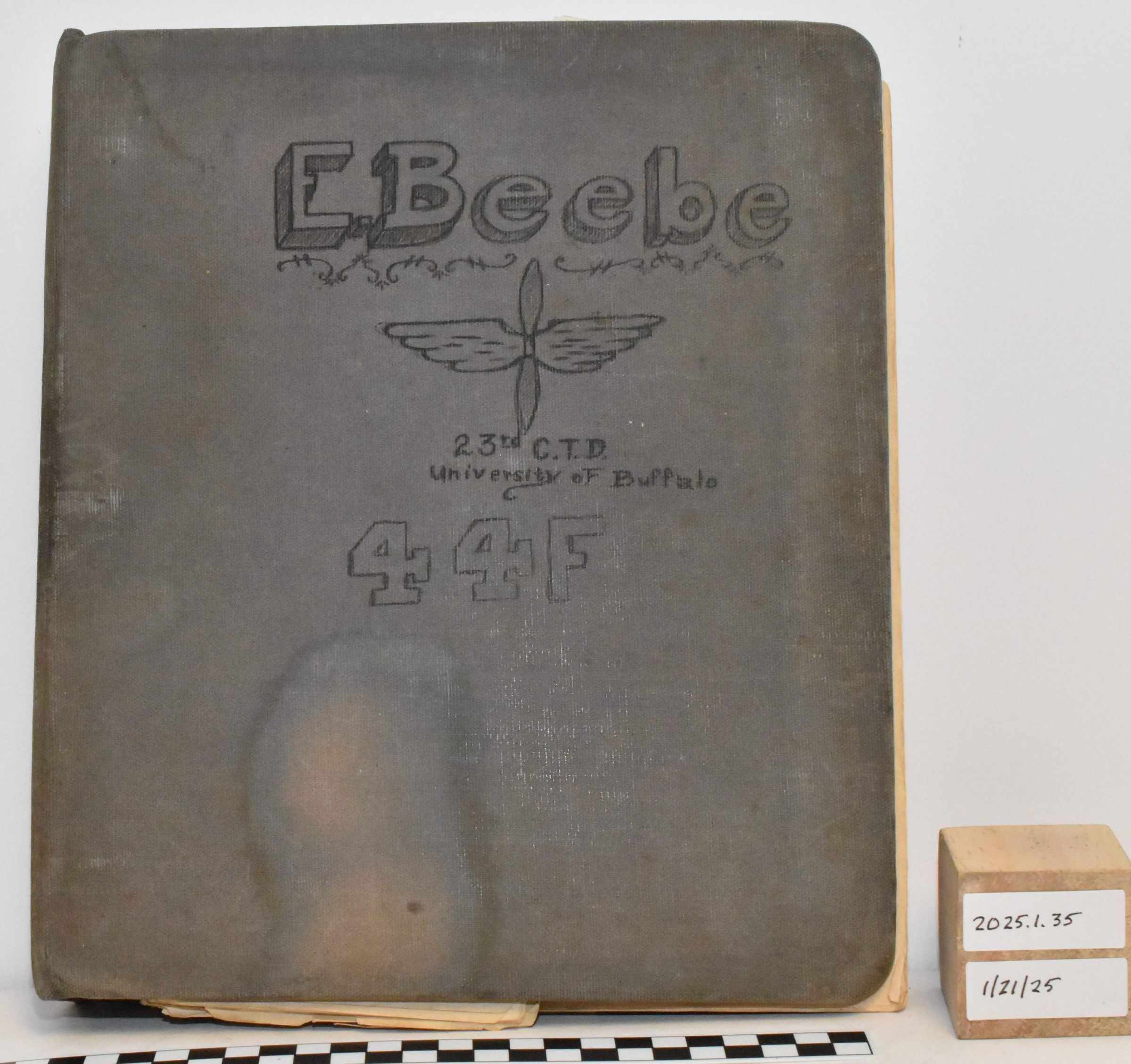 Edward E. Beebe Collection - binder containing course notes from his time at University of Buffalo. Marked "E. Beebe, 23rd C.T.D., University of Buffalo, 44F". Suspect that 44F is his class number.Acquisition