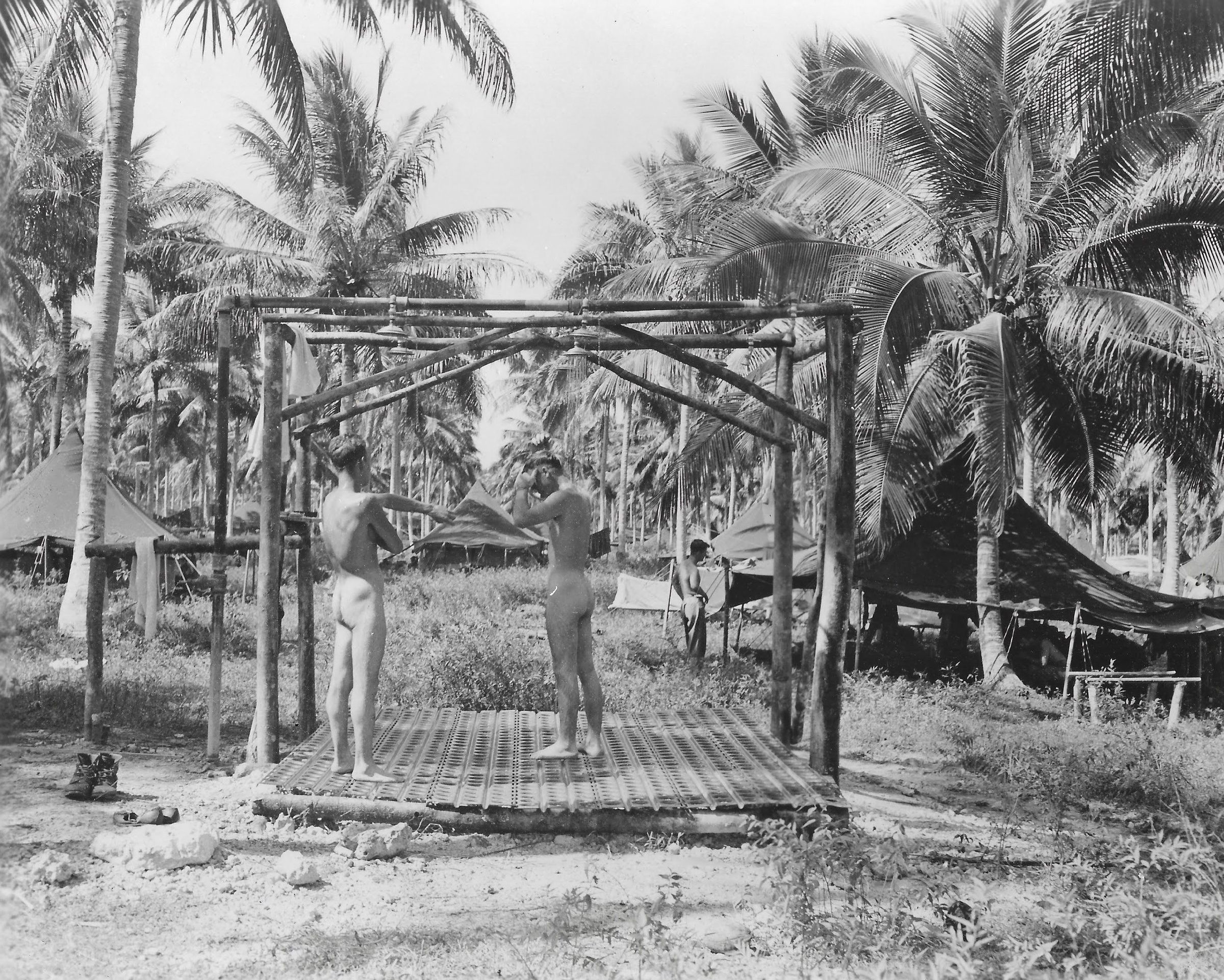 Shower: Backstamped:  Date:  2-12-43 VMD-154 OFFICIAL PHOTOGRAPH Not To Be Used For Publication By Order Of The Chief Of the Bureau Of Aeronautics
