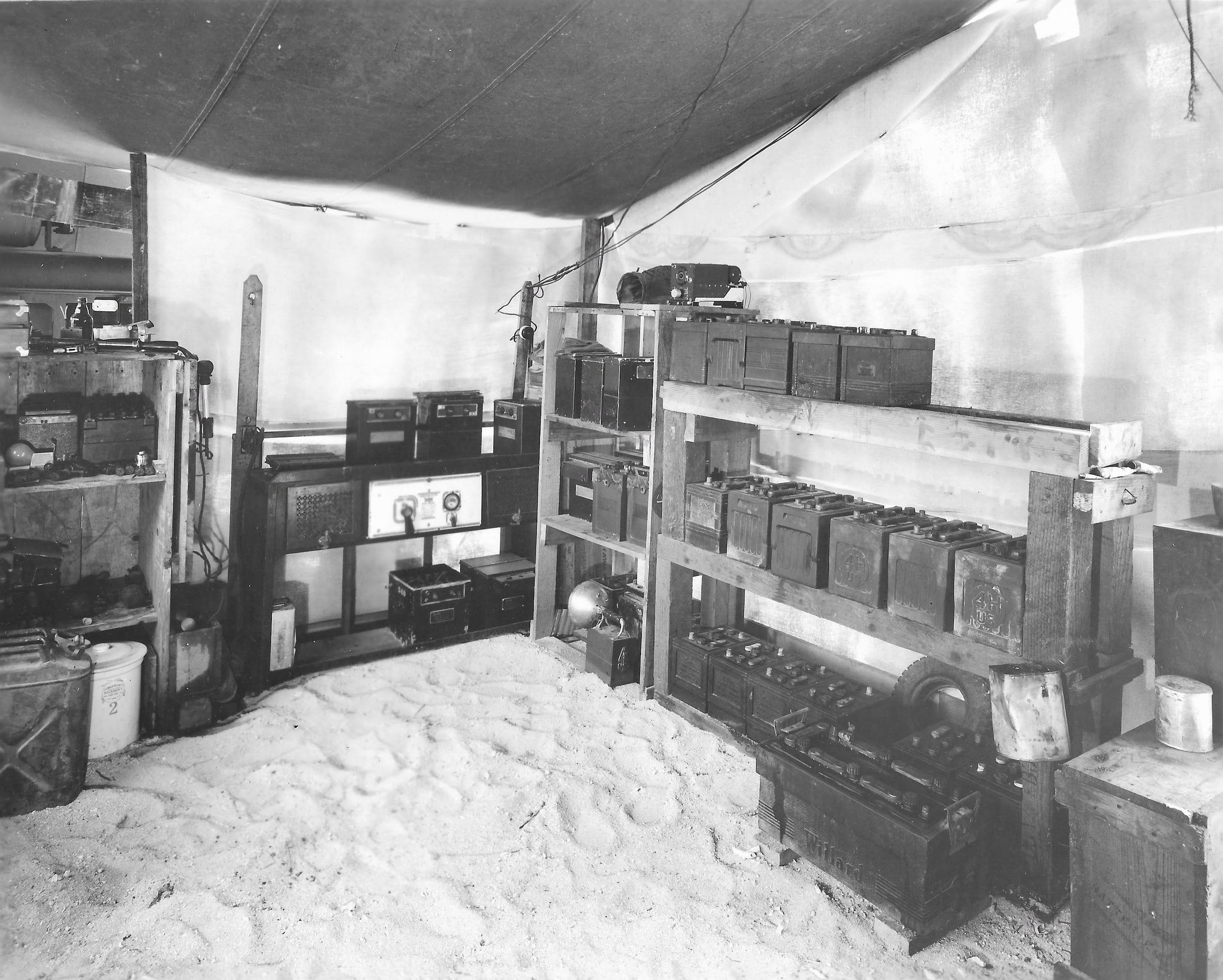 Interior of Electric (Battery) Shop: Backstamped:  Date:  9-16-43   VMD-154 OFFICIAL PHOTOGRAPH Not To Be Used For Publication By Order Of The Chief Of the Bureau Of Aeronautics