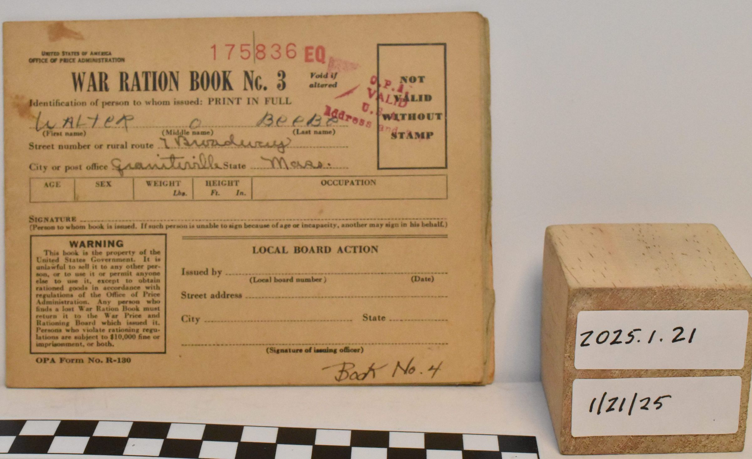 Edward E Beebe Collection - Walter O. Beebe ration book