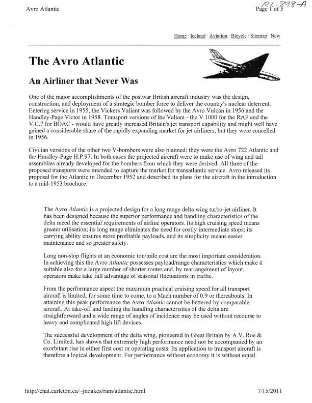 Story on the UK Avro 722 Atlantic jetliner