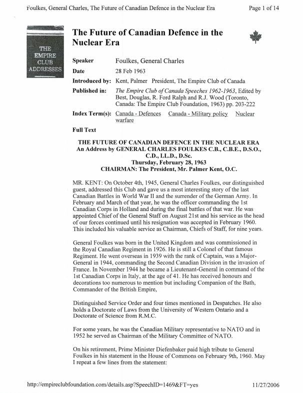 Copy of General Charles Foulkes speech" The future of Canadian Defence in the Nuclear Era" presented at The Empire Club Foundation 28 Feb 1963