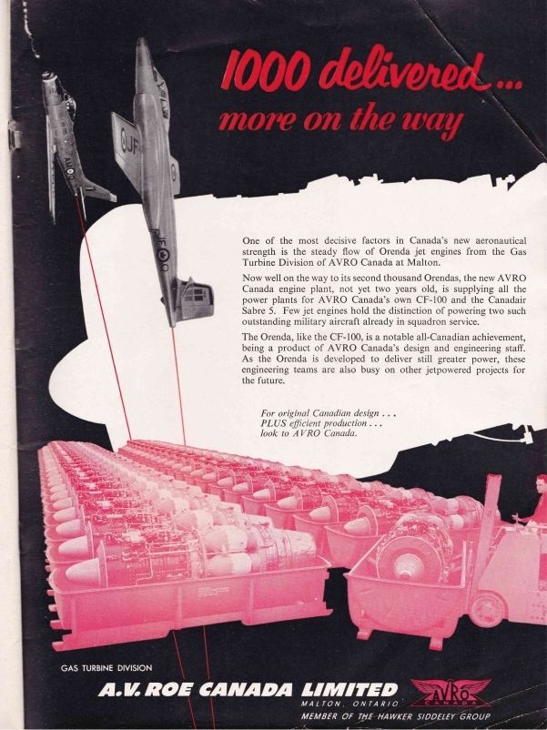 A.V. Roe Canada ad - shows JF-Q CF-100, Sabre and Orenda engines in cases